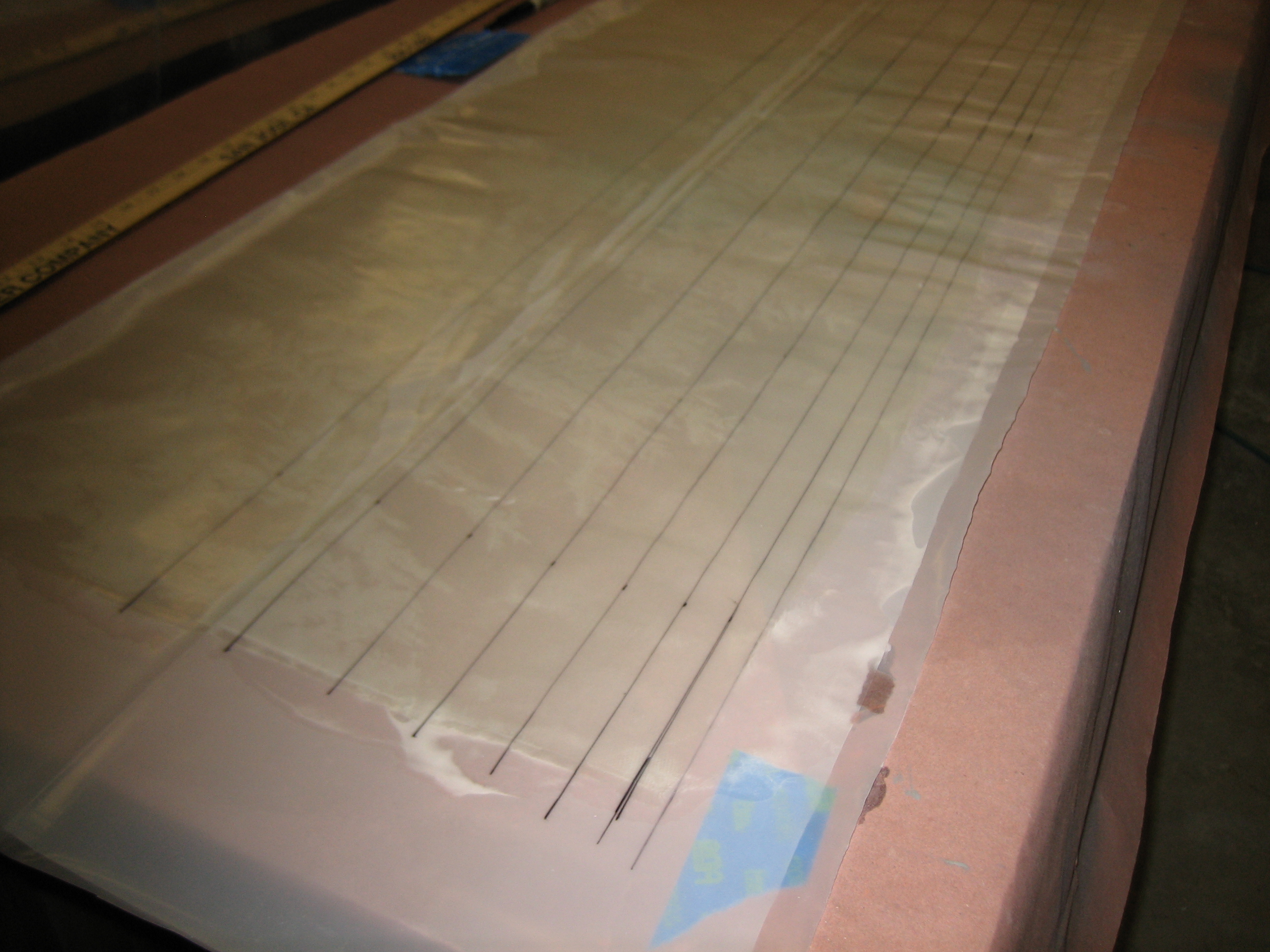 I impregnated some 8.9oz satin weave cloth with epoxy and marked strips of widths in 1/4″ increments from 1/2″ to 2″.