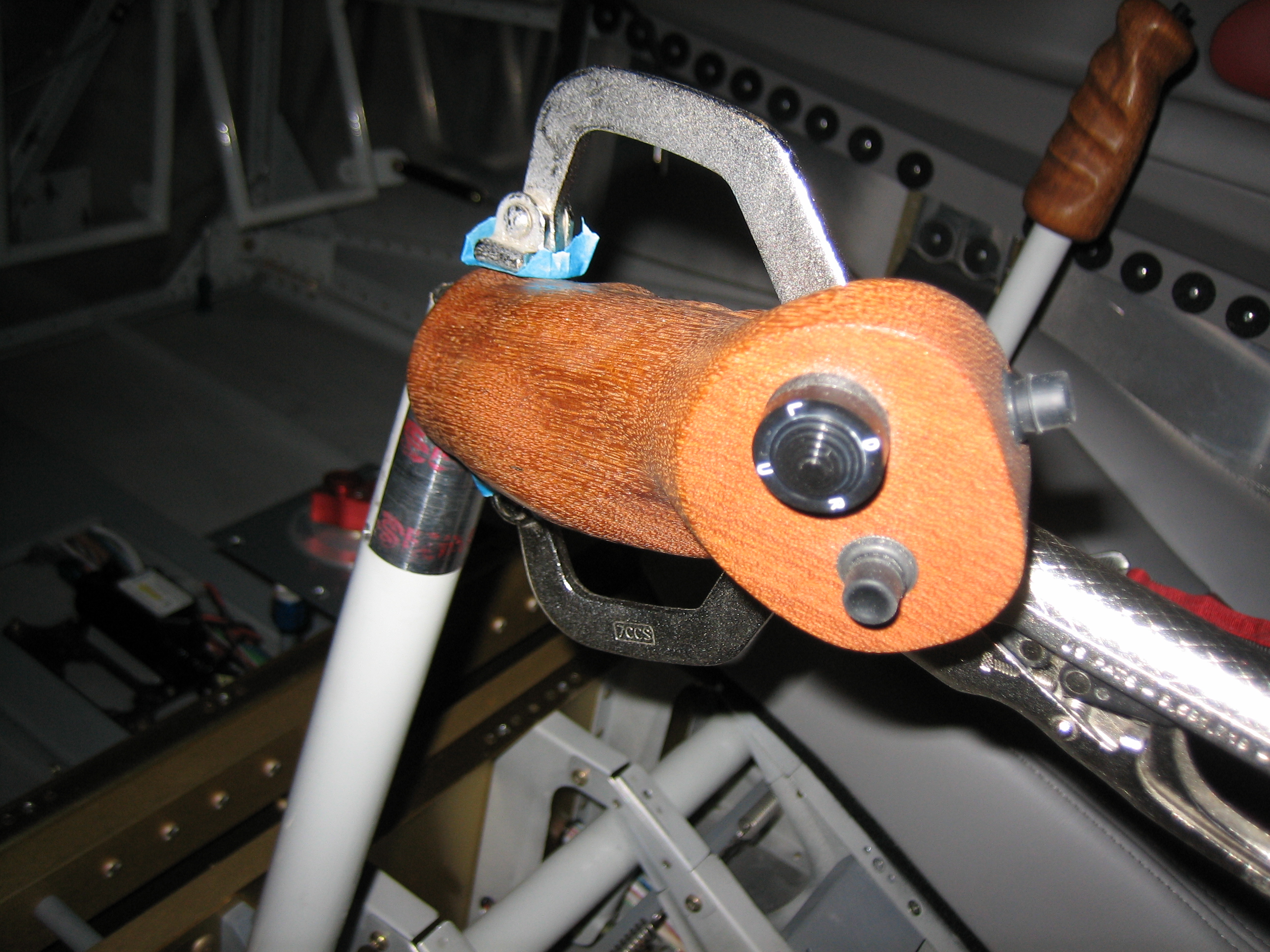 Next, I tried to tighten the set screw that anchors the pilot’s control stick grip, but ended up cracking the wood in the grip a little bit. I flexed open the crack and filled it with epoxy before clamping it. I also drilled a small hole where the set screw sits so that the set screw will screw into a hole instead of just applying pressure to the stick. This should be a much more secure way to attach the grip and it can never loosen.
