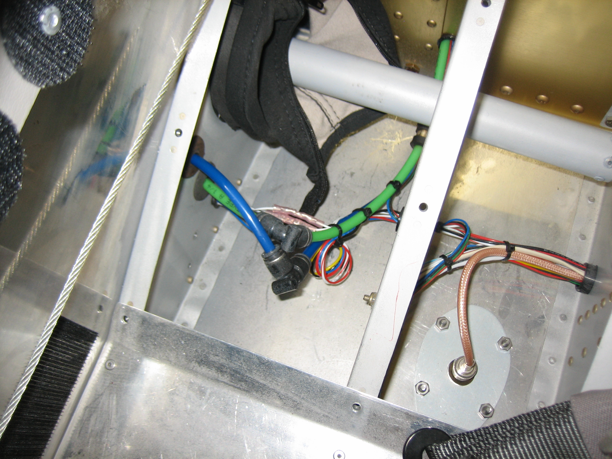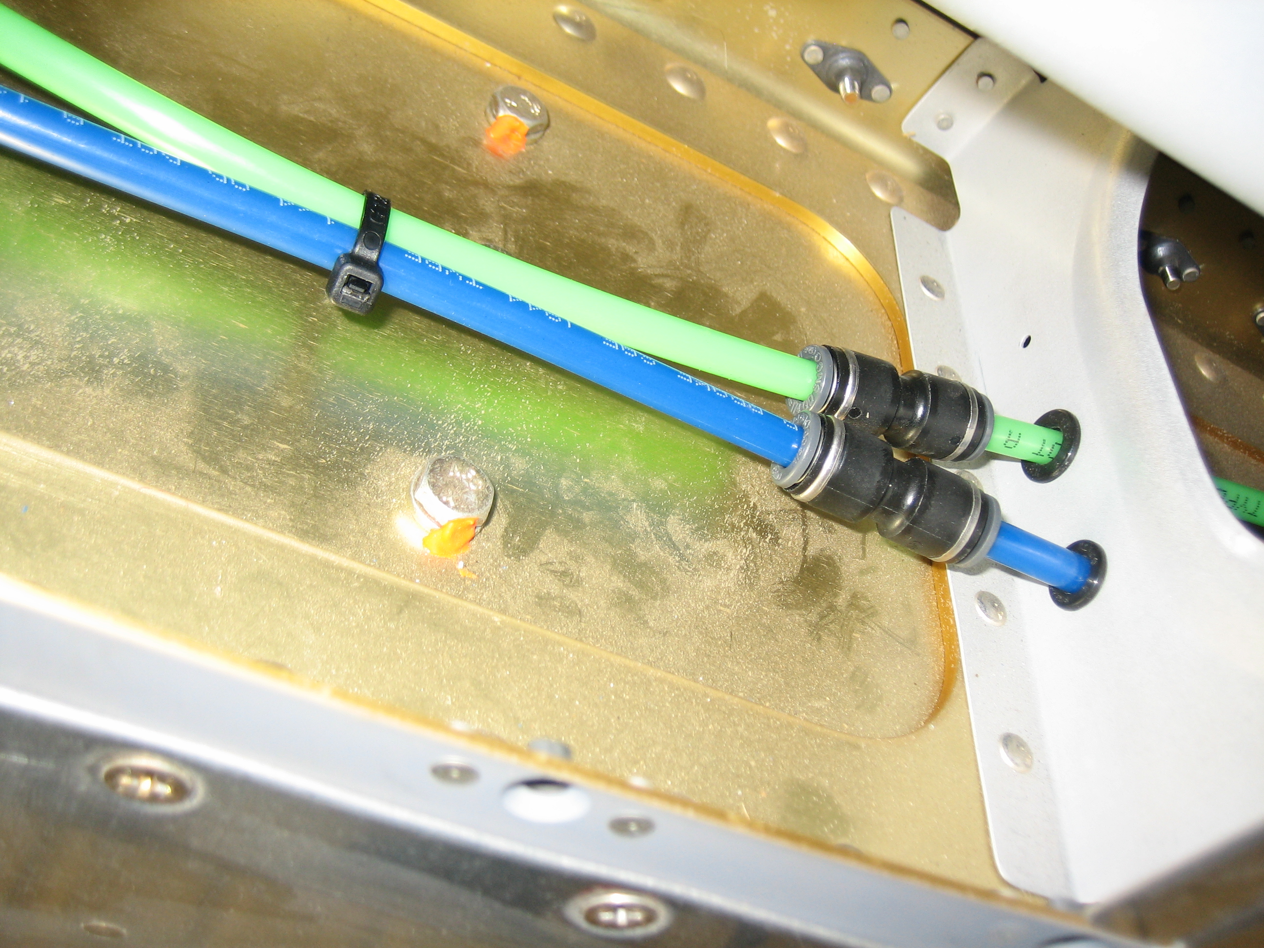 I then cut the lines in the wing and took some longer pieces and ran them from the pitot tube to these fittings. This is better anyway since I can disconnect the tubing here and pull the pitot tube out of the mount. This is looking up into the inspection port just inboard of the pitot mast. With the way the lines were previously run, pulling the pitot tube out of the mount required disconnecting the lines right at the top of the mount. That wasn’t too painful, but reinstalling the pitot tube was a real pain since it required hooking up the tubing entirely by feel. This way, the fittings are easy to inspect and verify correct installation.