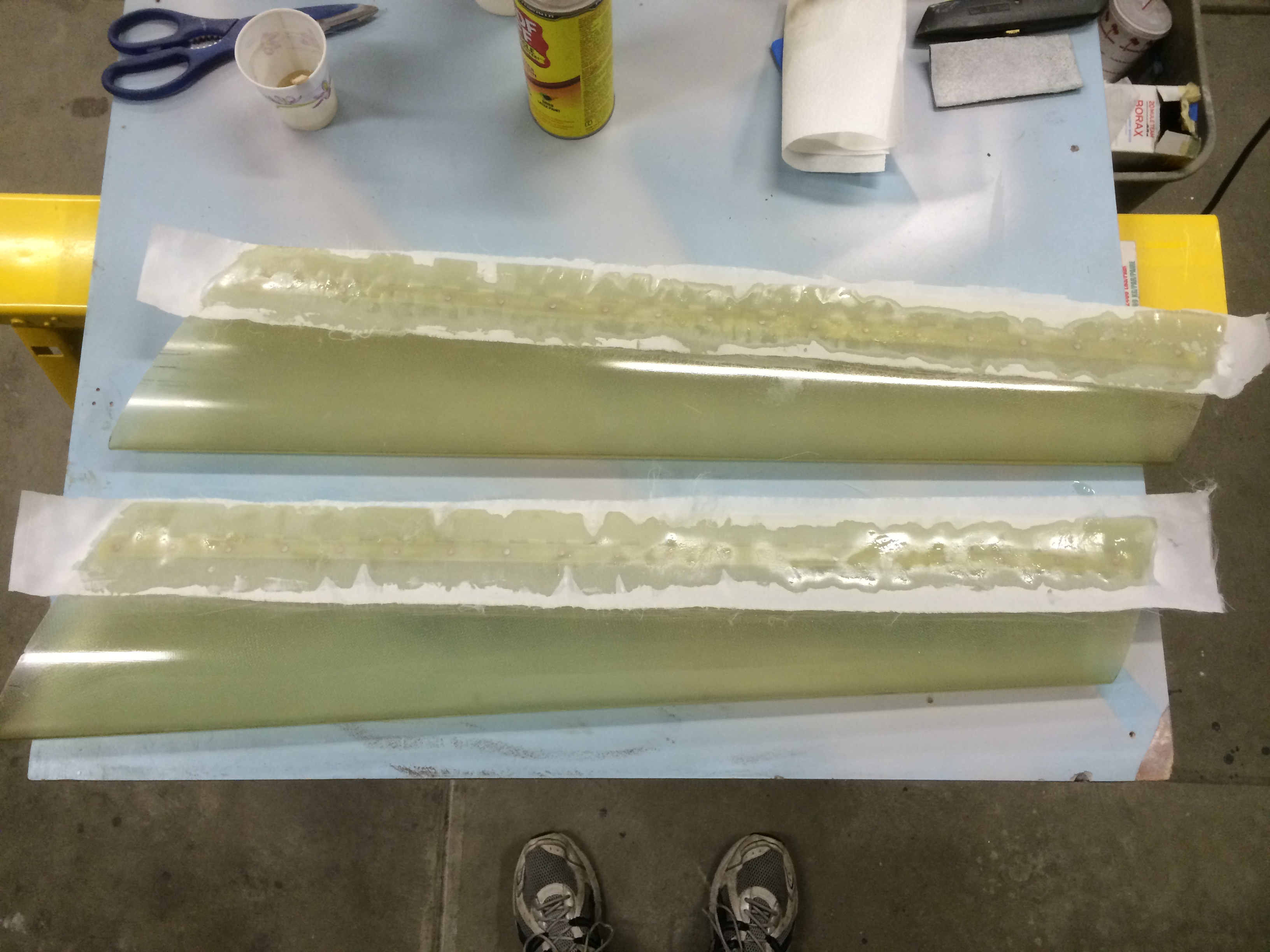 I wanted to lay up a thin layer of glass over the rivets holding the hinge material to the gear leg fairings. I used a couple of strips of the lightest cloth I had on hand and covered them in some Dacron (which is what you see here). I’ll do the other side of these soon and then I can put a thin coat of filler on the fairings.