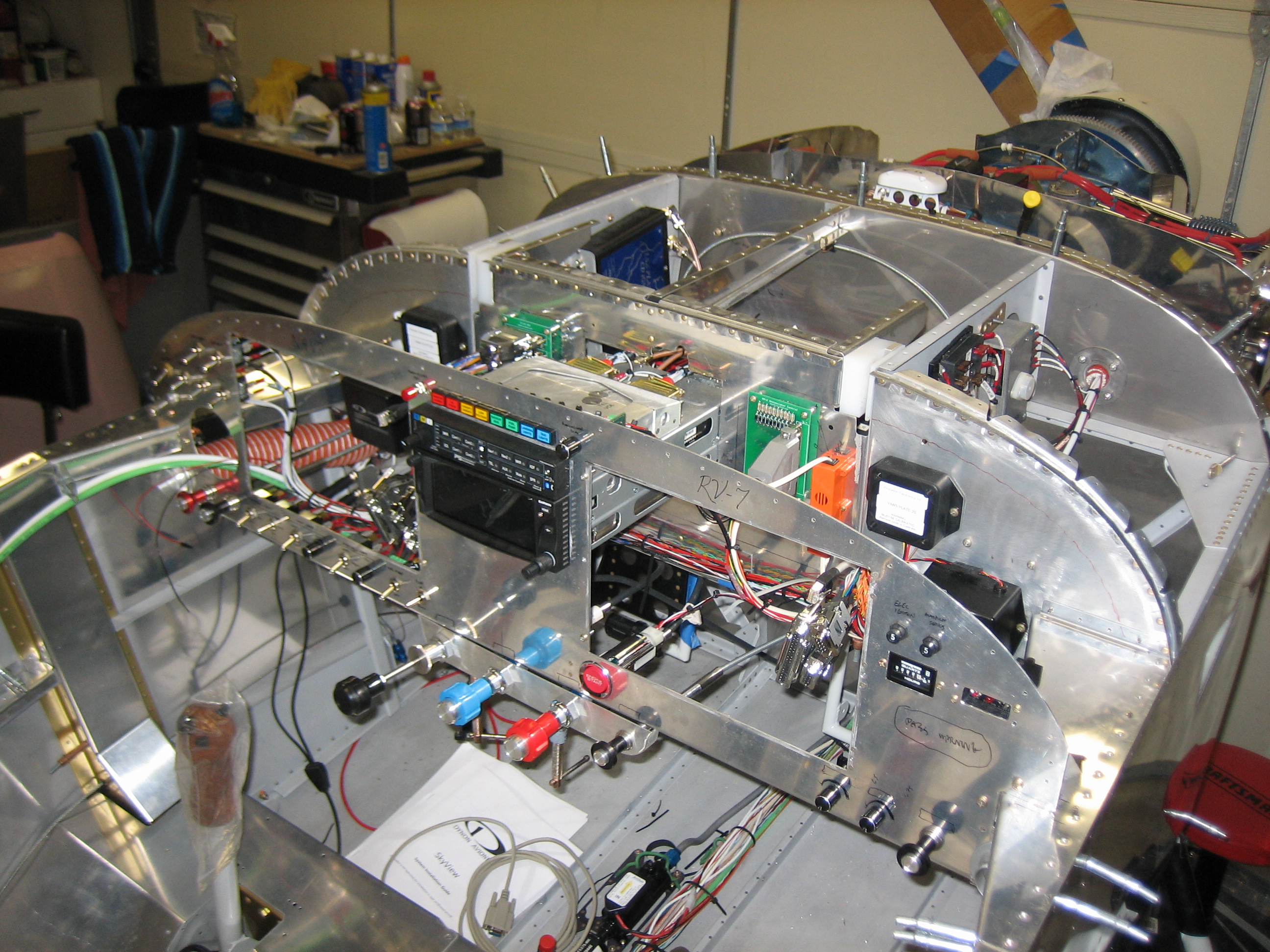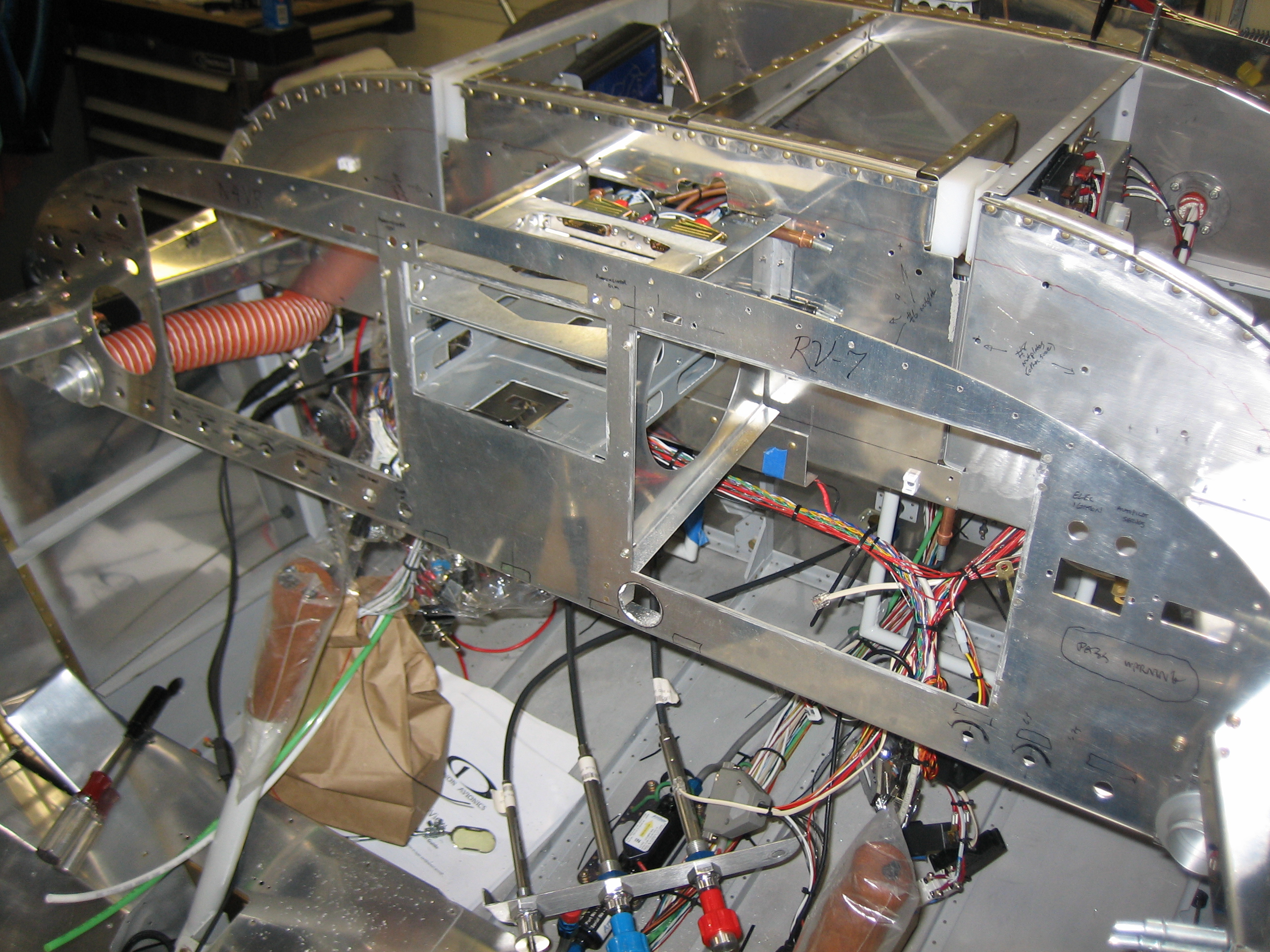 The bundle of ignition, EGT and CHT wires running aft from the #4 cylinder weren’t well supported. I riveted a K2000-3 nutplate to the side baffle and used a two-wire adel clamp to secure the bundle to the baffles. This prevents these wires from flexing down and contacting the #4 exhaust pipe (or flexing up and contacting the baffles under negative G conditions). Other than hooking up the starter wire just before first engine start and the coax wires to the electronic ignition coils, I believe all of the firewall forward wiring is complete. Other than final hookups of wing and empennage components (lights, roll servo, OAT probe, etc.), I believe all of the firewall aft wiring is complete as well.