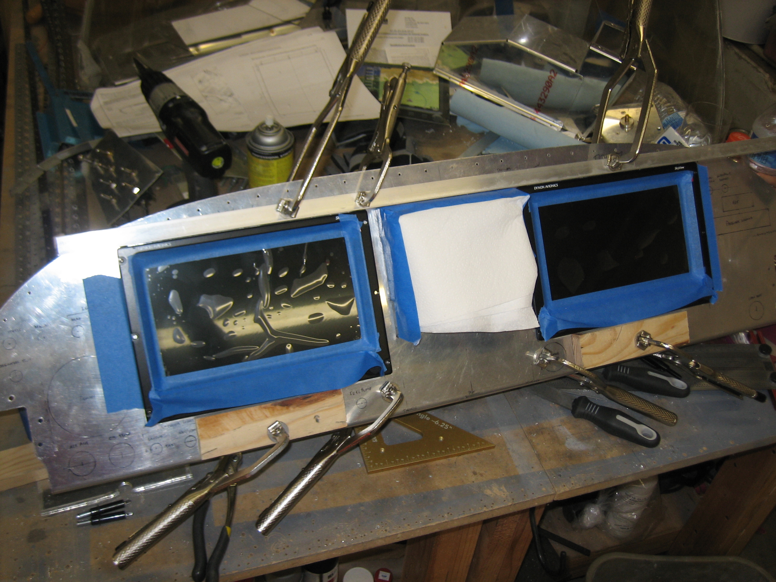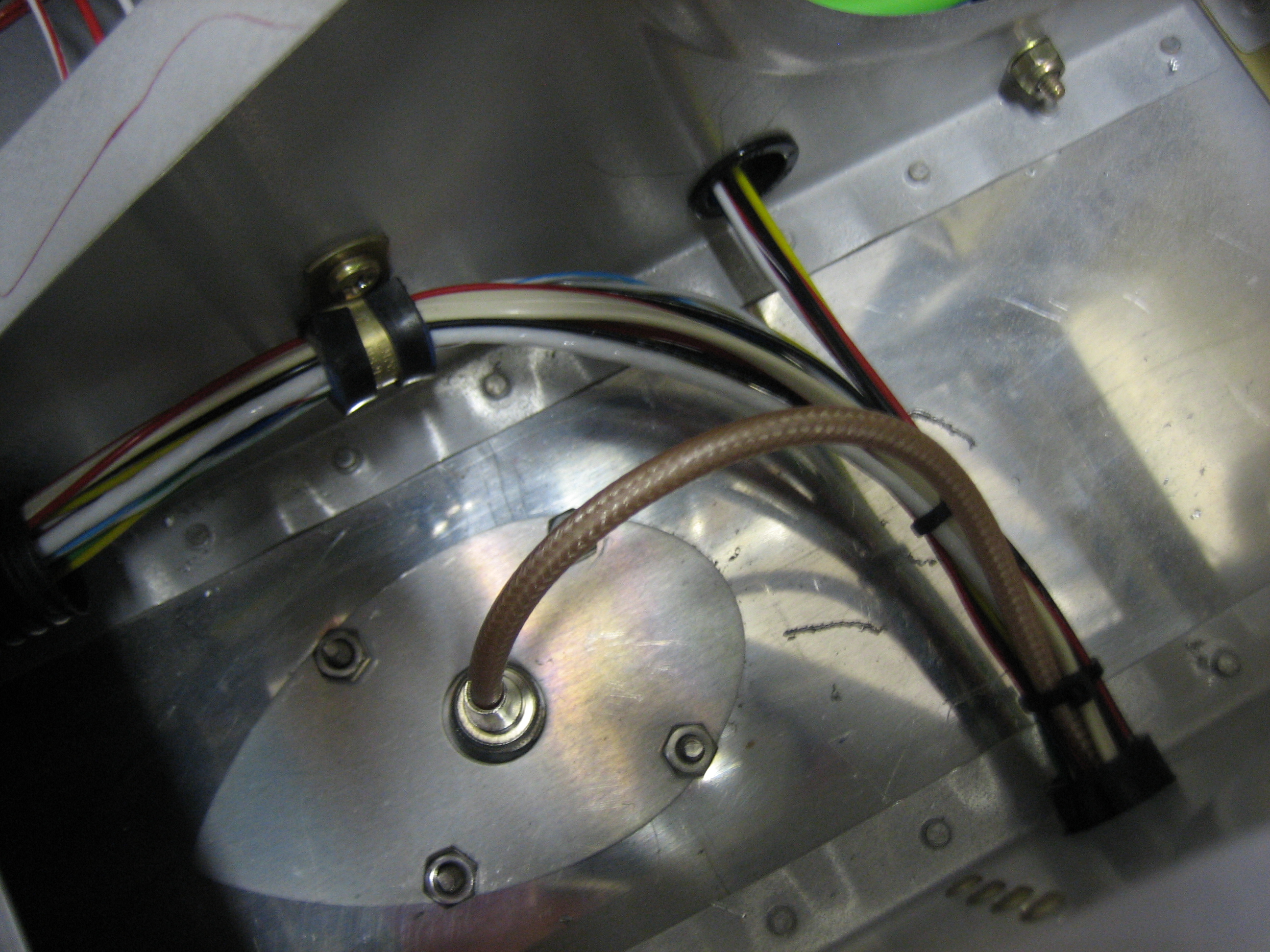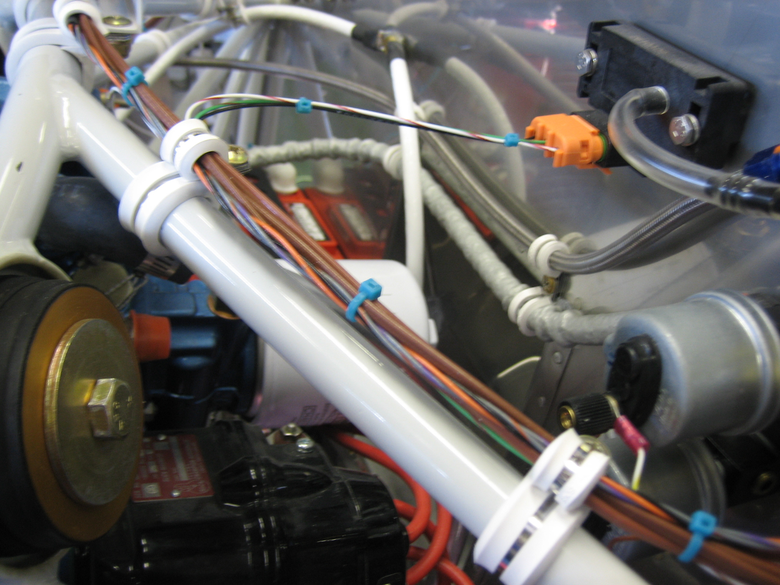 I spent a little time tonight tidying up some wiring runs under the seats. I installed an adel clamp on the wires to the left of the center tunnel. I haven’t tightened either of these down fully yet since I want to wait until the GPS antenna cable is adjusted to length and I still need to run the wires for the control sticks.