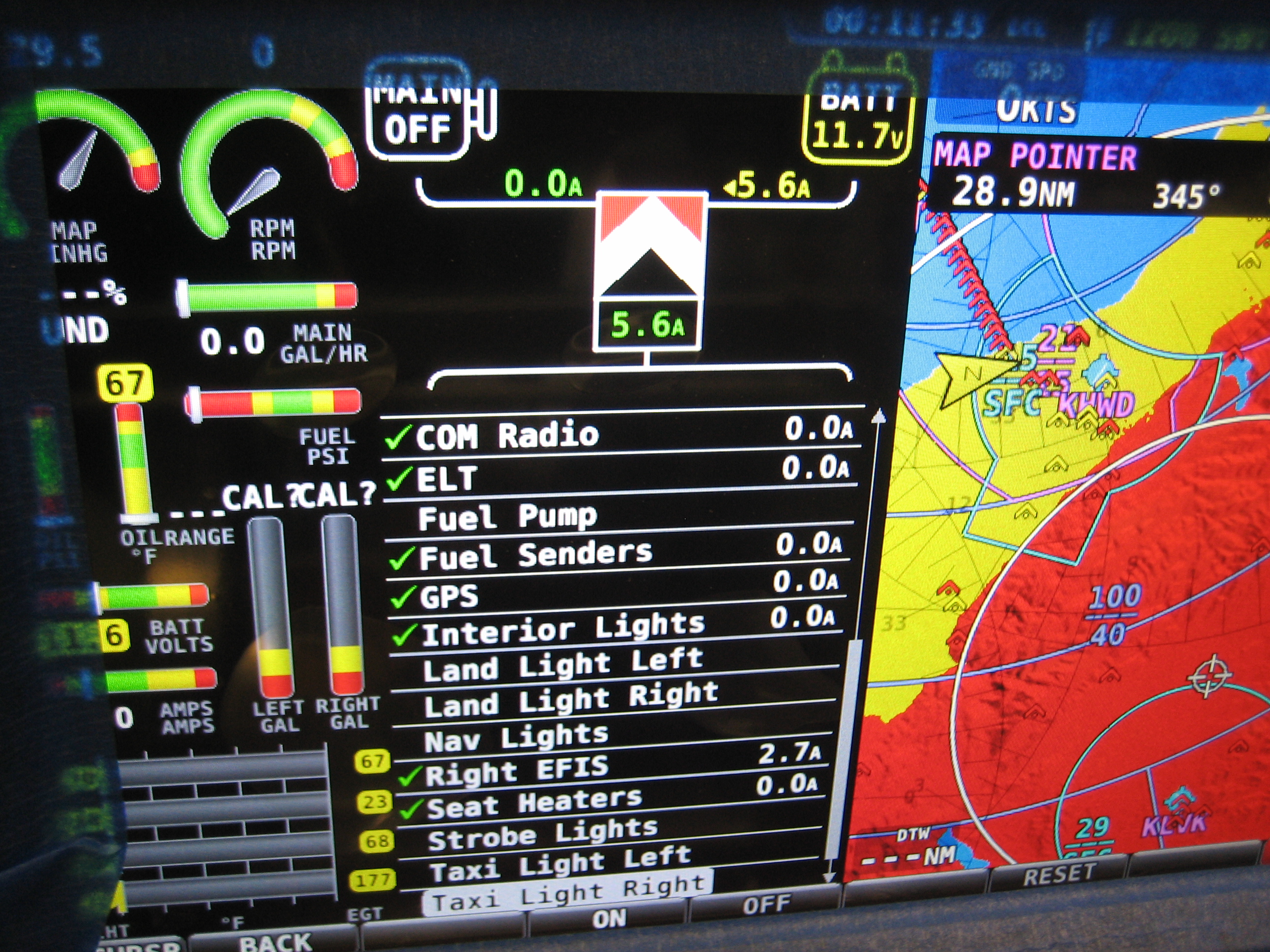 The VP-X screen on the SkyView indicates the problem is that the taxi lights aren’t drawing any current.  From here, you can scroll down and reset the fault.  The other nice thing is that device can be turned on or off or controlled directly from this page.  For example, if my fuel pump switch were to fail, I could navigate to that device here and press the “ON” button seen at the bottom of the screen to turn the device on regardless of the state of the switch.  You can even control the trim and flap motors from here.  The buttons change to “Left” and “Right”, or “Up” and “Down” as appropriate.  This is really slick, and I’m very glad I waited for the VP-X and SkyView integration.
