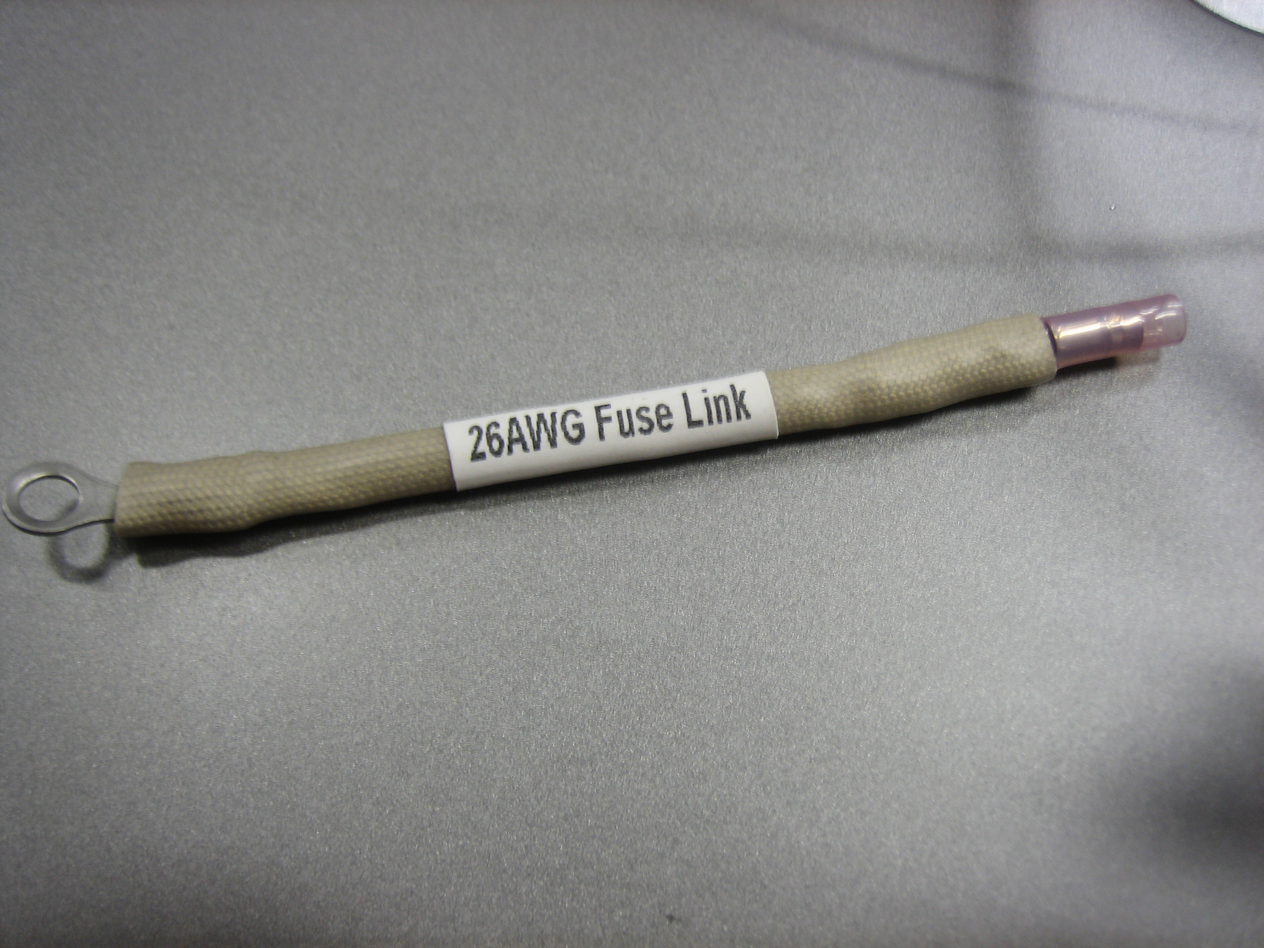 One of the annunciator lights to wire up is the Essential Bus light.  This pulls power off the stud on the essential bus fuse box.  The wire needs to be protected though since the essential bus fuse box is supplied with a pretty fat wire.  If I just used a bare wire from that stud to the annunciator circuit, it could melt and start a fire if it ever shorted somewhere along the wire.  To protect the wire, I could use an inline fuse, but a more reliable way is to use a fusible link.  This is basically just a short length of 26AWG wire with terminals crimped on each end.  The whole thing is covered with some silicone impregnated fiberglass sleeving.  This will be crimped to a piece of 22AWG wire that will run to the annunciator control circuit.  If this wire were to ever be shorted to ground, the 26AWG wire would melt and break before the 22AWG wire got hot enough to cause a fire.  The silicone sleeving keeps the melting 26AWG wire from causing a fire.