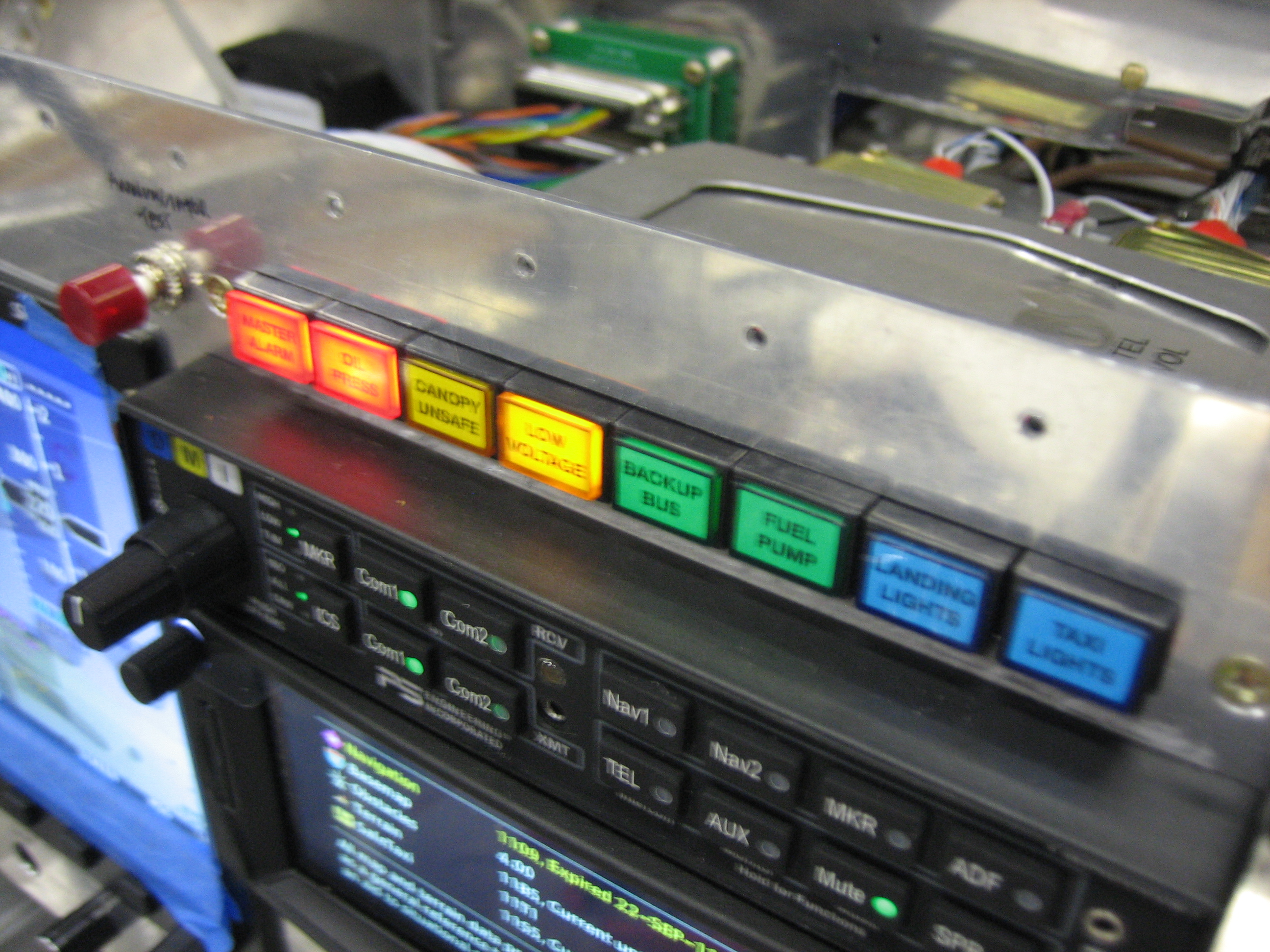 I wired up the remaining annunciator lights (other than the “Canopy Unsafe” light).  The final three were the landing and taxi lights as well as the fuel pump.  Unfortunately, this unveiled a flaw in the annunciator control circuit I designed.  Basically, for annunciator lights that are triggered high, I was assuming the transistor base voltage would be shed through the load when the load was turned off.  The problem is that for certain types of loads (e.g. LED lights), the load resistance is pretty high at low voltages.  This has the effect of causing the transistor base voltage to fall pretty slowly after the load is turned off, which causes the annunciator light to dim slowly.  I really need to couple the base and emitter with a resistor to provide an alternate path for the base voltage to drain.  I’ll have to redesign the circuit and have new PCBs made.