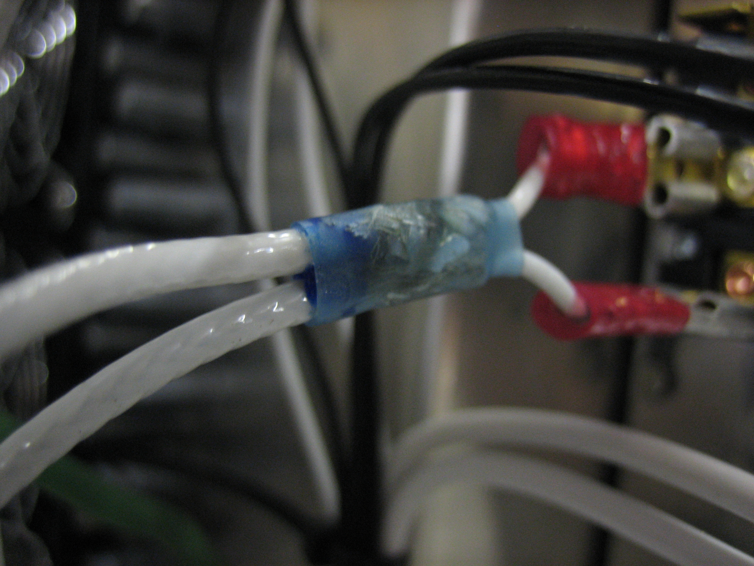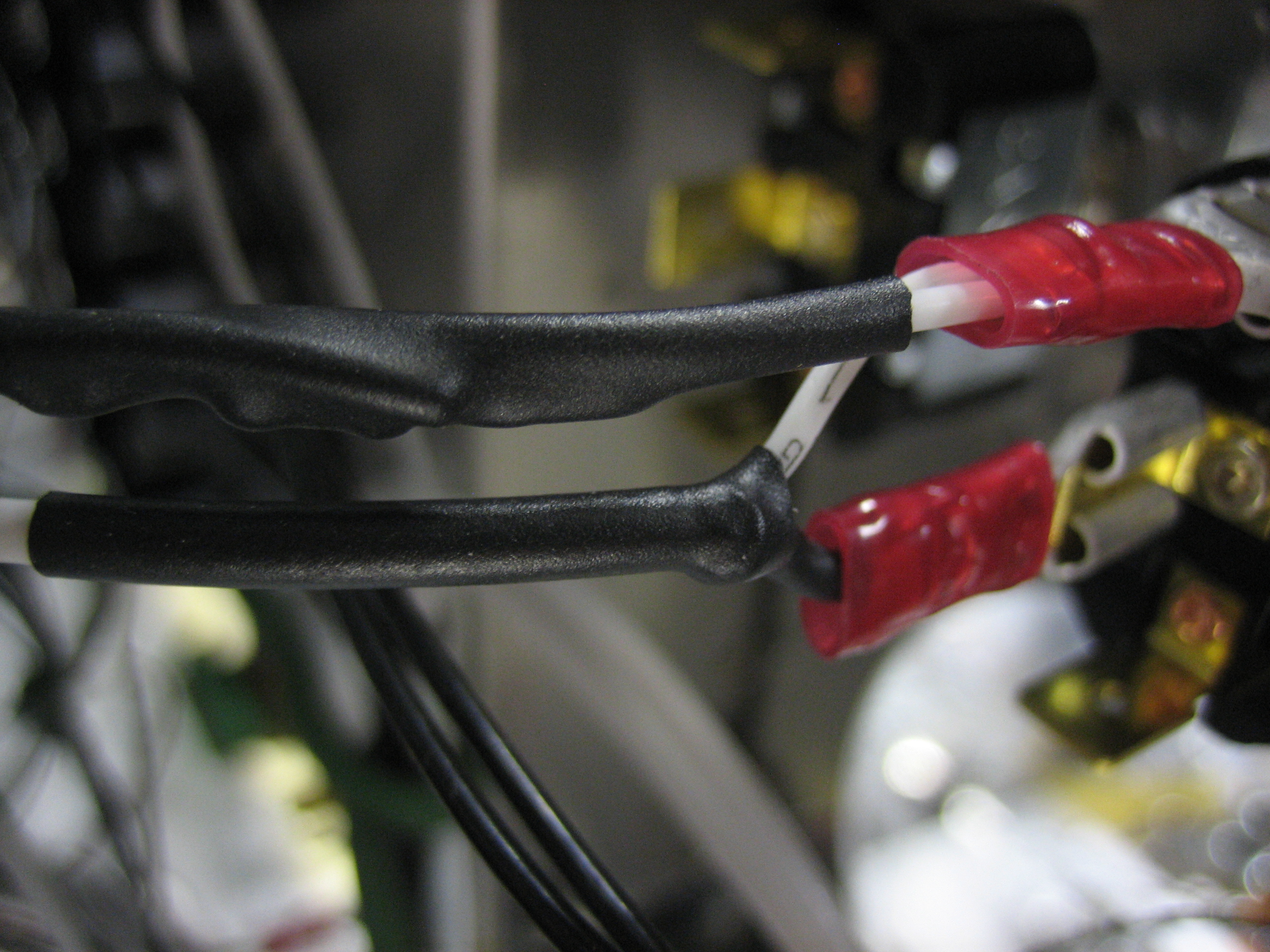 The center conductor of the shielded wire is connected to the battery bus (the upper right fuse here).  Another solder sleeve is used to connect an 18AWG black wire to the shield.  The installation manual specifies that this should be directly connected to the battery, but I’m trying to limit unprotected wires in the aircraft as much as possible.  Connecting this here adds only a couple of connections over the recommended wiring method, and these are very high-reliability connections.