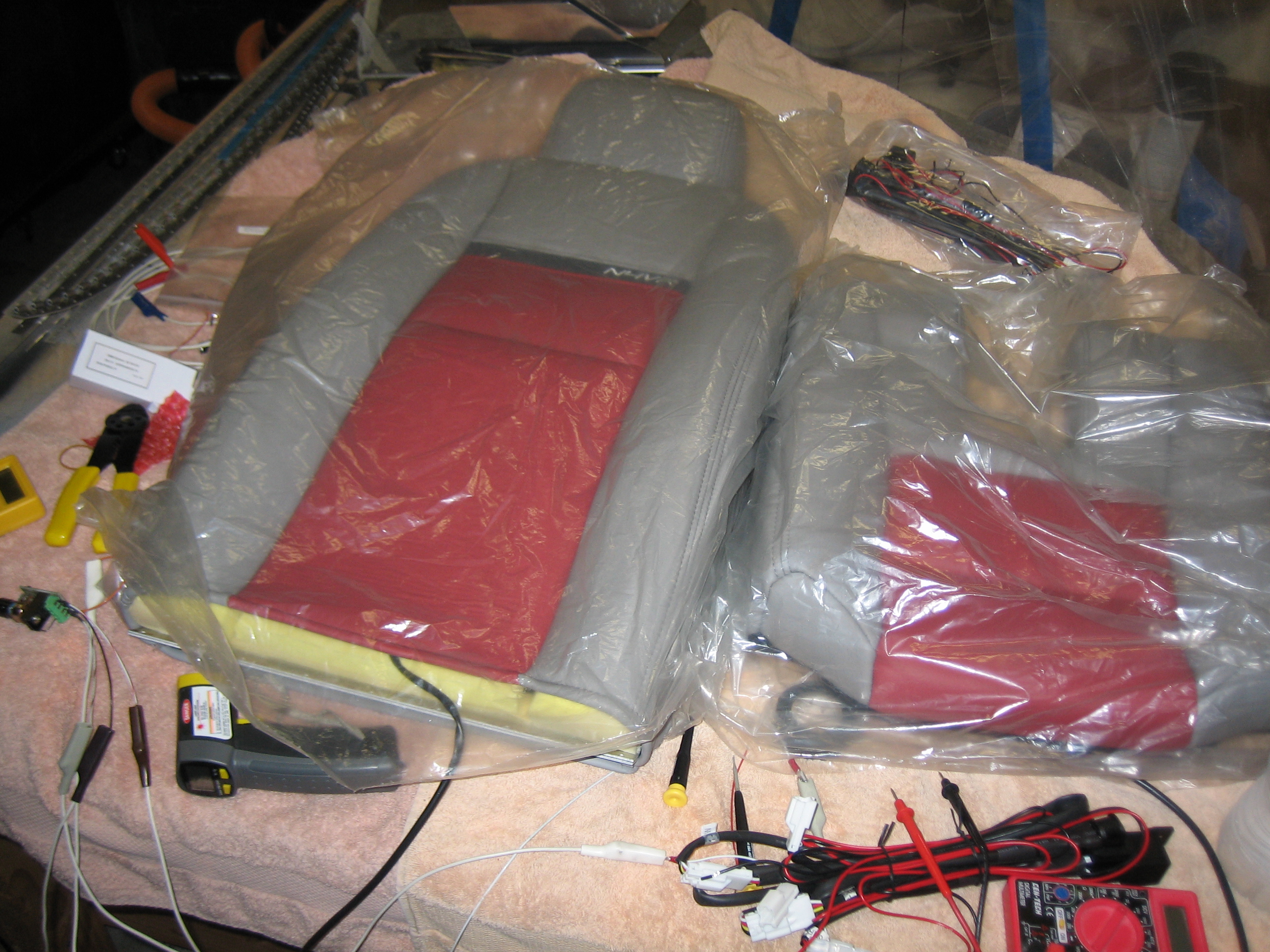 I pulled out my seats and hooked up the dimmers (bypassing that huge bundle of wire, connectors, relay, and switch in the lower right that come with the seats).  The dimmers work beautifully with the seats.  The voltage varies linearly with the knob position.  I had a little scare when the current through the seat bottom suddenly dropped to almost zero (~10mA).  I checked the dimmer and voltage at the seat, and everything looked good.  After a few minutes of head scratching, the current suddenly jumped back to the original value.  Apparently, the seat heaters have thermistors built into them to prevent over-heating.