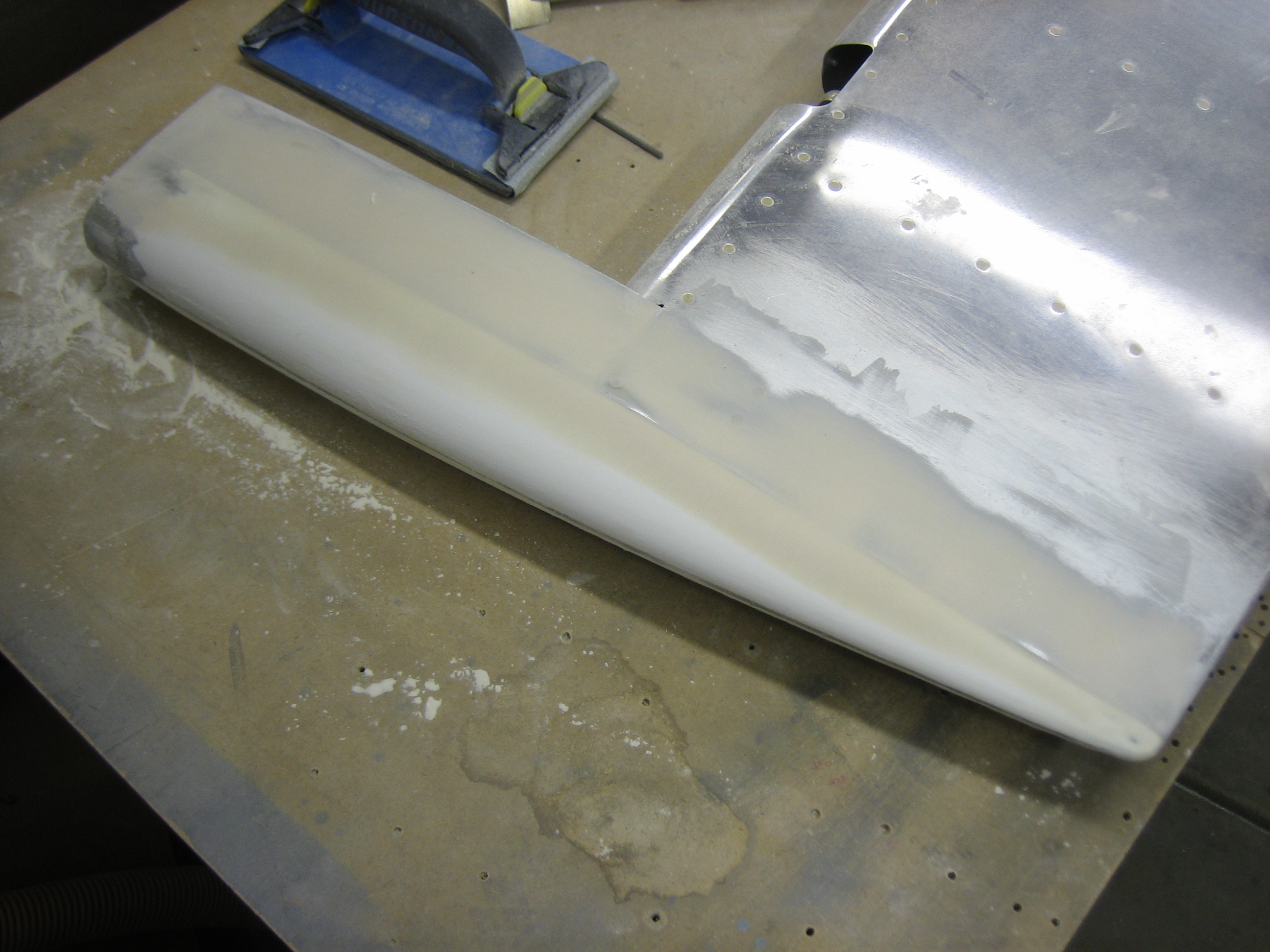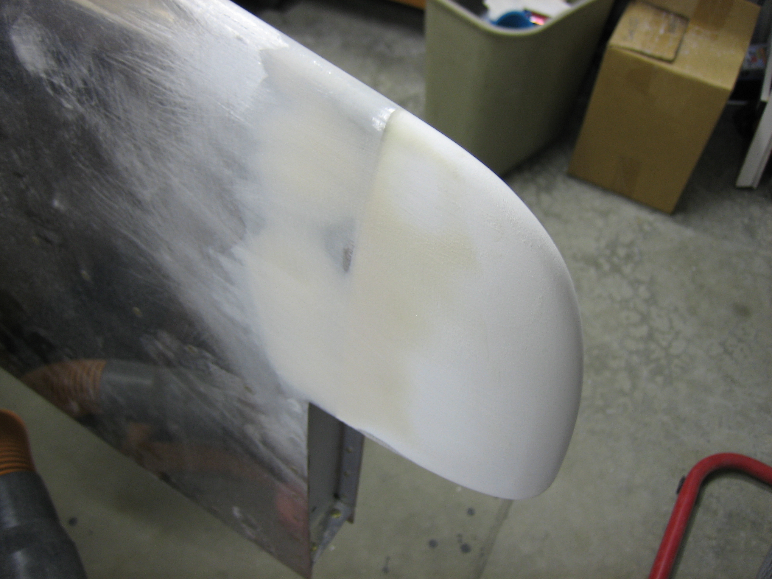 I sanded down the filler on the left side of the rudder and then applied some filler to the right side. I also removed the foam from the fiberglass tip at the top of the vertical stabilizer. I need to reshape the tip a bit to fair it in with the rudder.