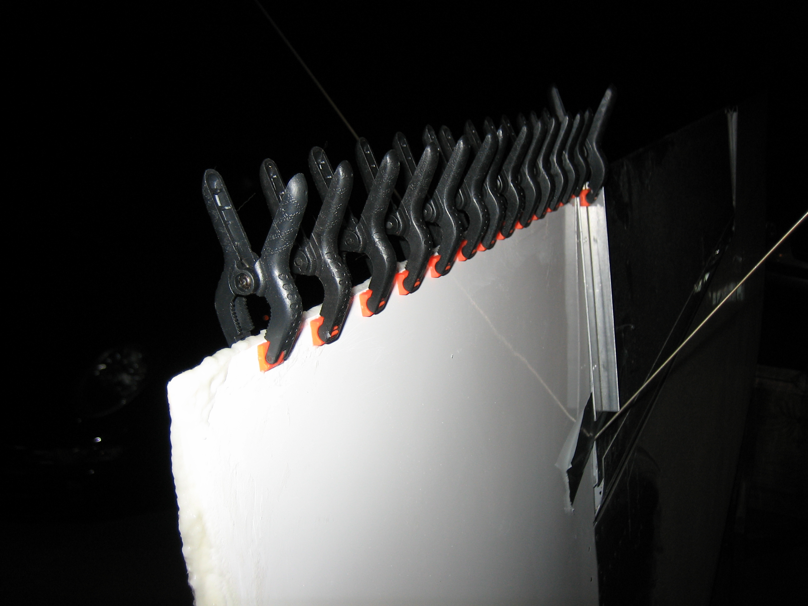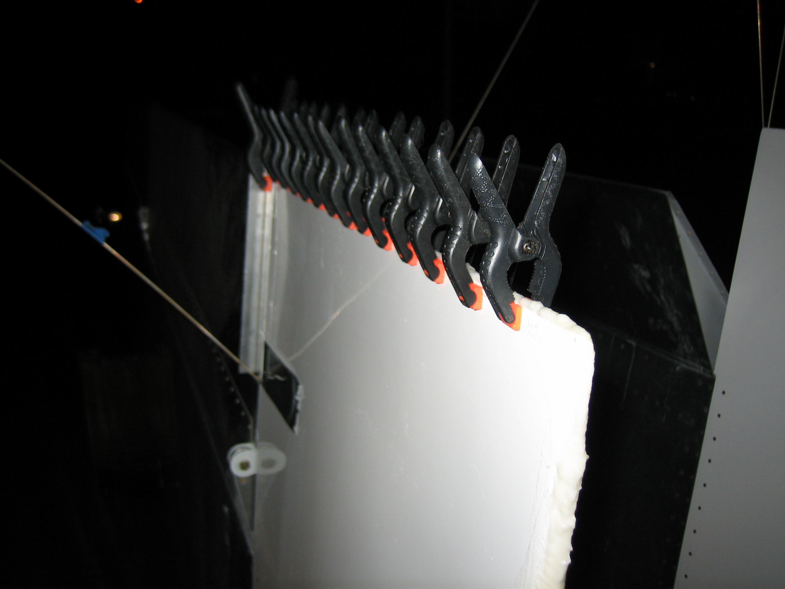 With the internal stiffeners glassed in, I could glue the trailing edge back together. I mixed up some epoxy/flox and put a bead down the back. I used a bunch of small spring clamps to hold the trailing edge closed while the epoxy cures. The clamp in the back is holding a couple of scrap pieces of aluminum angles and span the gap between the aileron and wingtip ensuring that the wingtip perfectly follows the edges of the aileron.