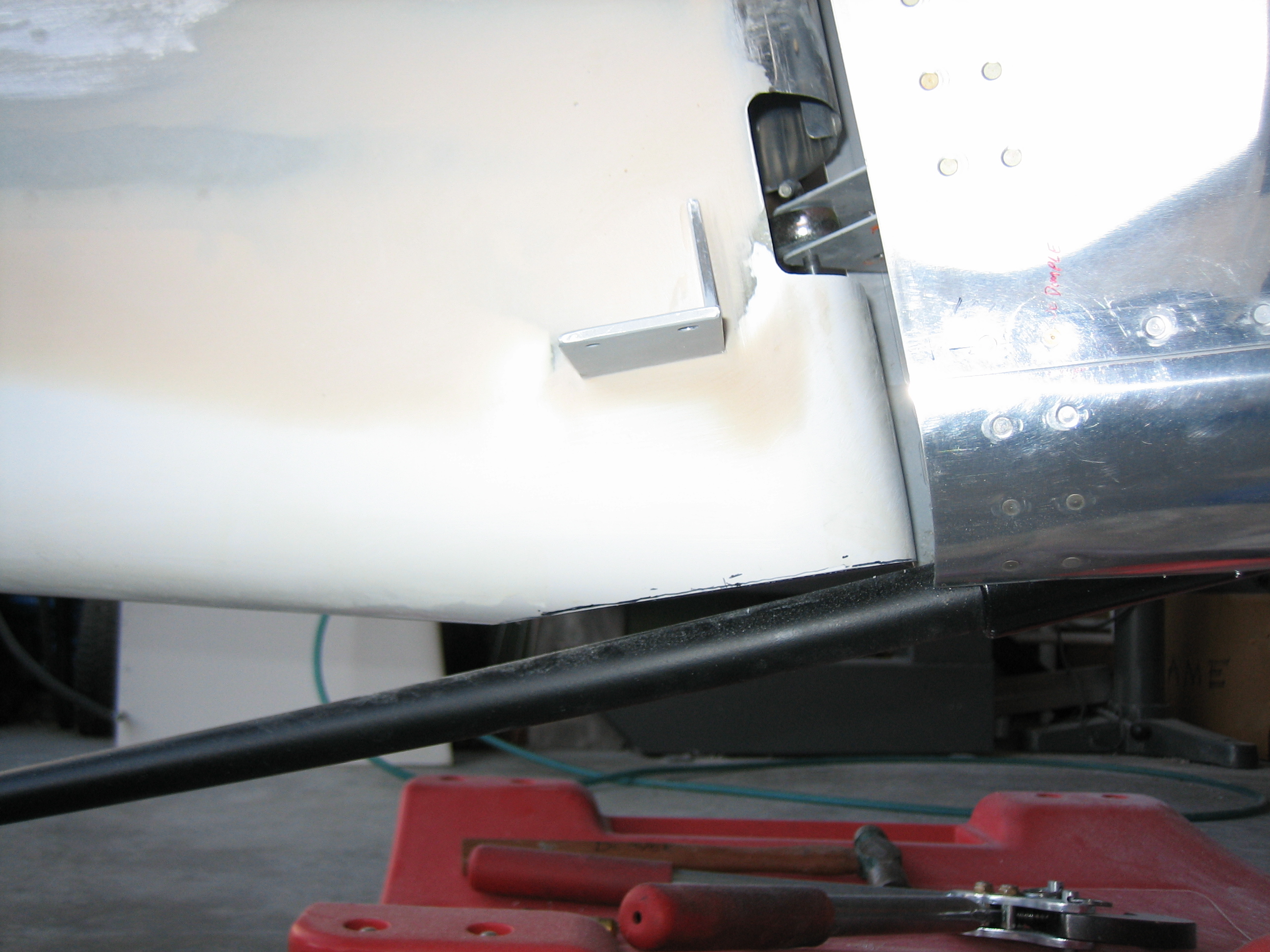 I needed to start fairing the rudder and vertical stabilizer, but I wanted to do it on the plane since it will be at a more comfortable working height. With the rudder bottom fairing in place though, the rudder couldn’t be mounted since the fairing hits the tailwheel spring. I measured and chopped off a chunk of the fairing.