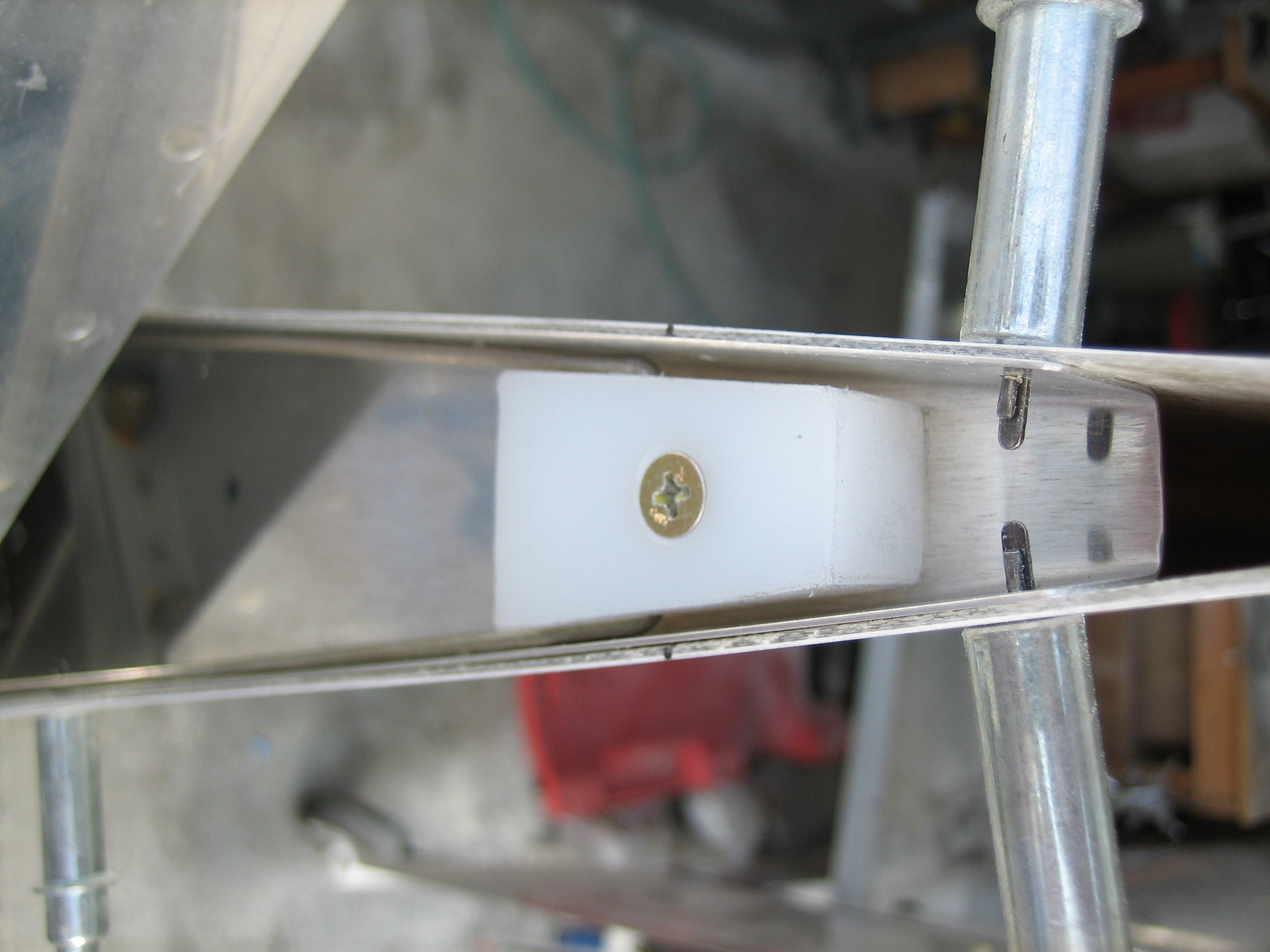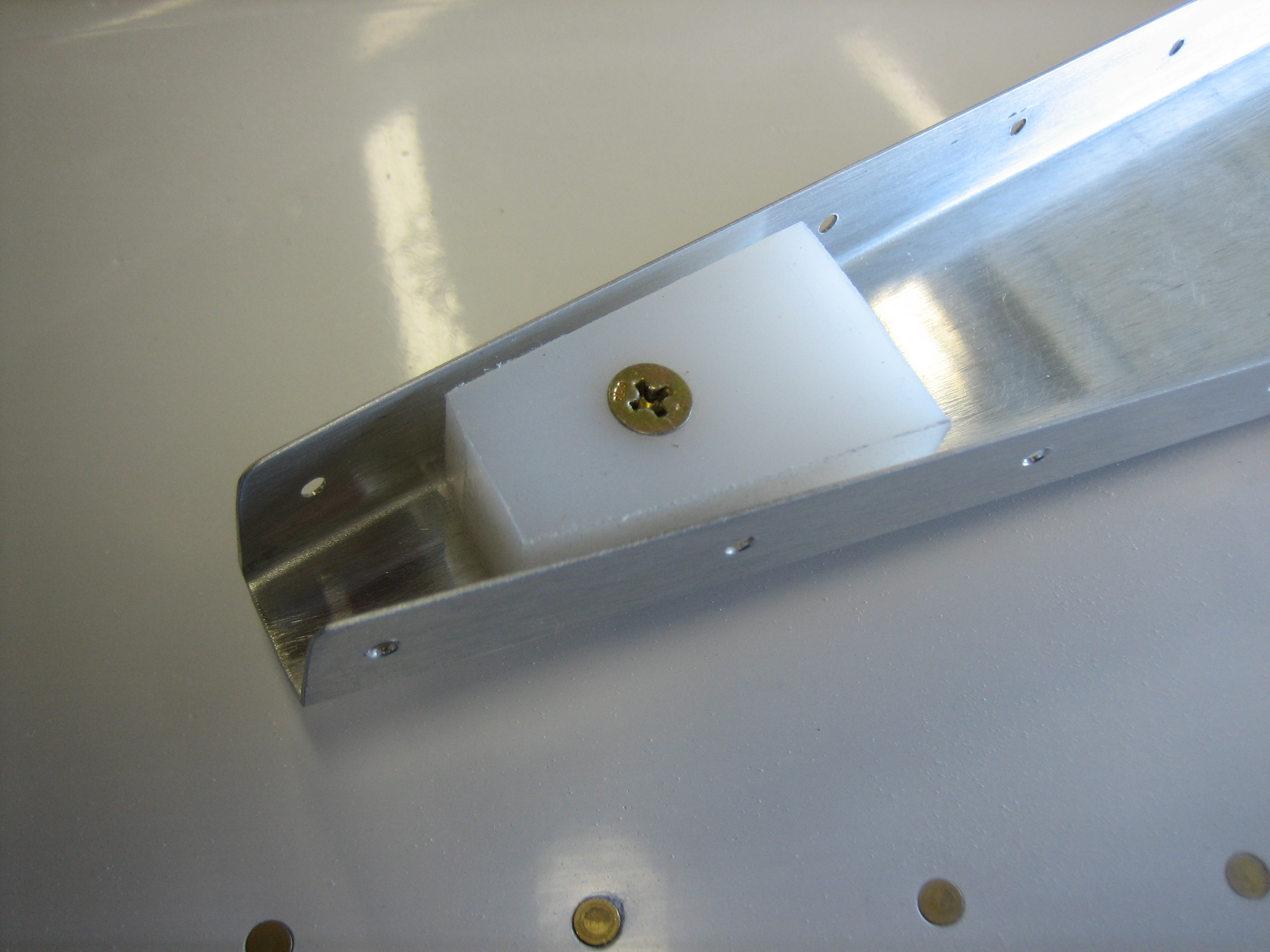 Since the wingtip is held on with hinges, I needed a method to secure the hinge pins so that they can’t come out. I fabricated these retaining blocks out of a chunk of Delrin that I machined down to fit inside the trailing edge of the wingtip rib. It’s held on by an AN509-8 screw.