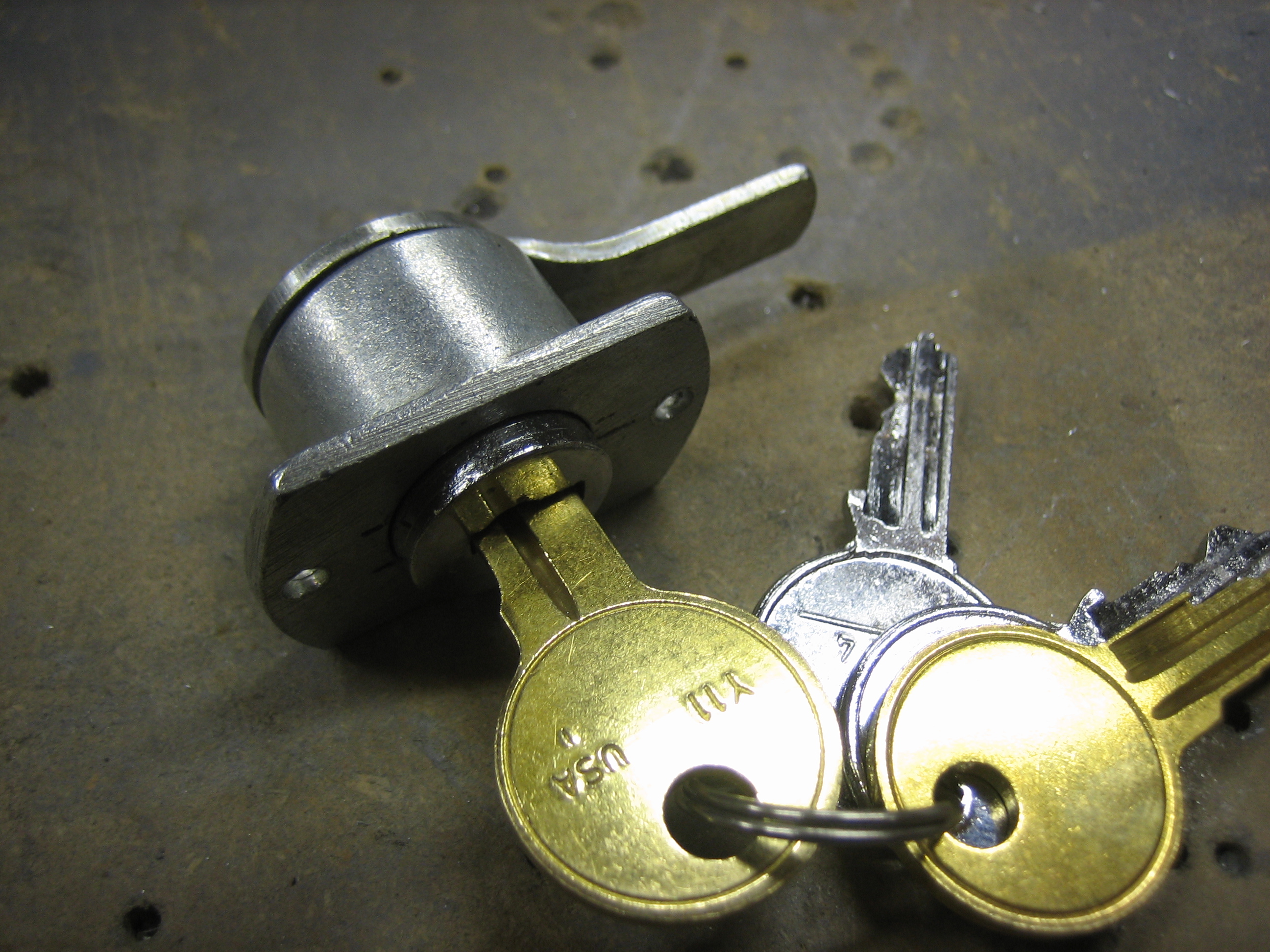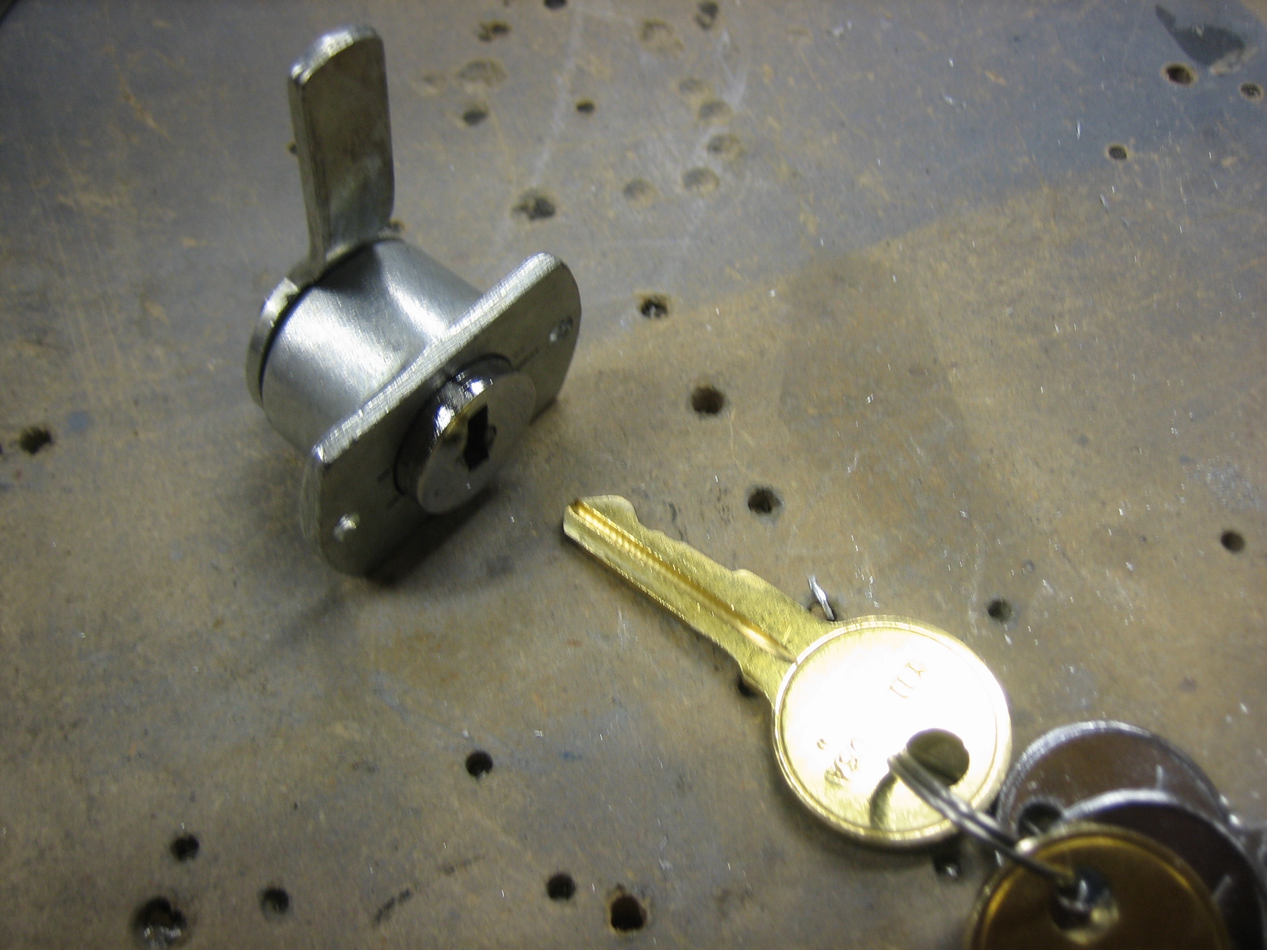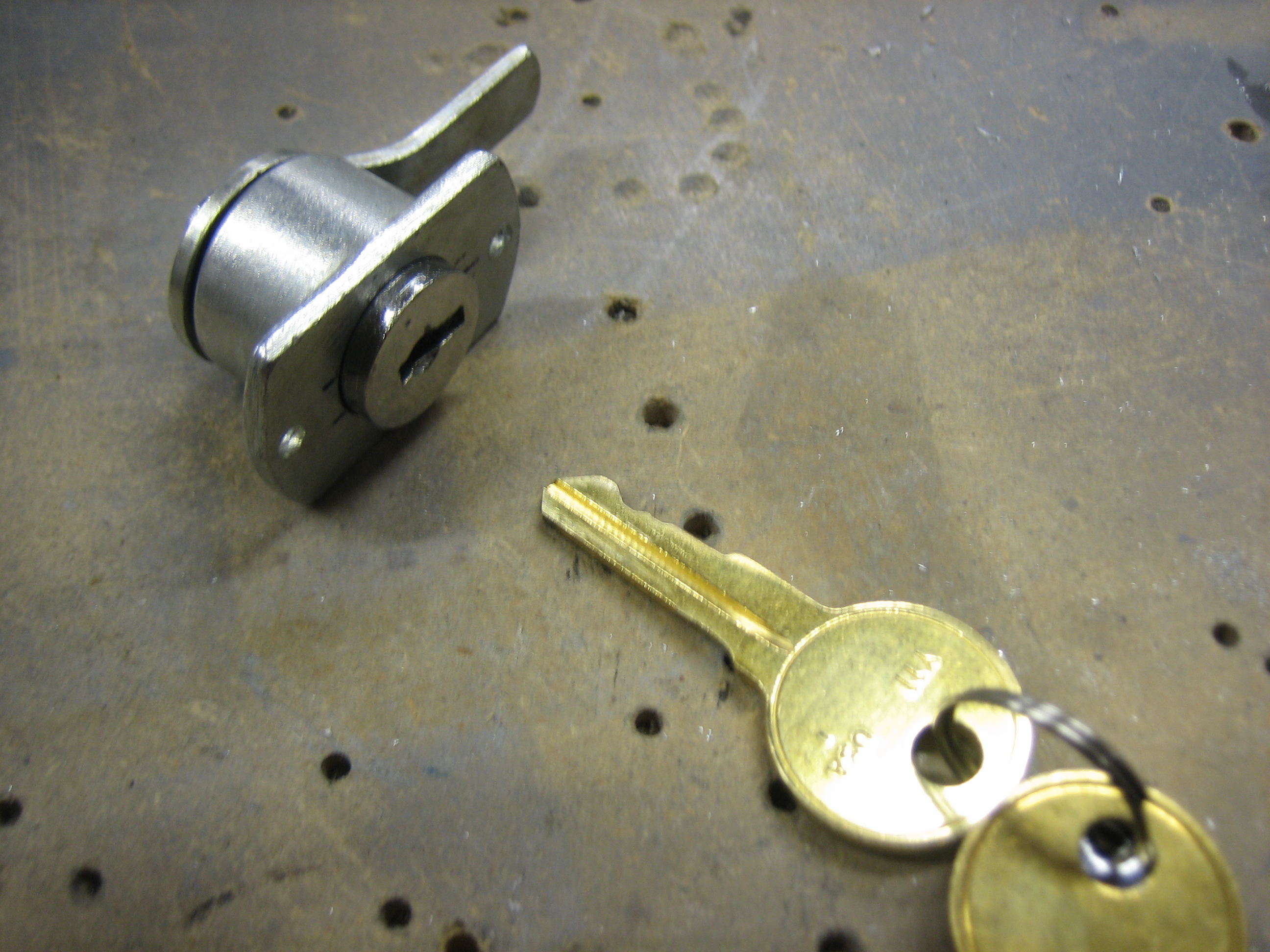 I found a great lock online that can be flush mounted against the side of the plane. Most camlocks mount through the hole, but this can be mounted from behind so that it doesn’t protrude beyond the skin. This is apparently the baggage compartment lock for a Lambretta/Scooters India Limited motor-scooter. You can find them on eBay for about $5.
