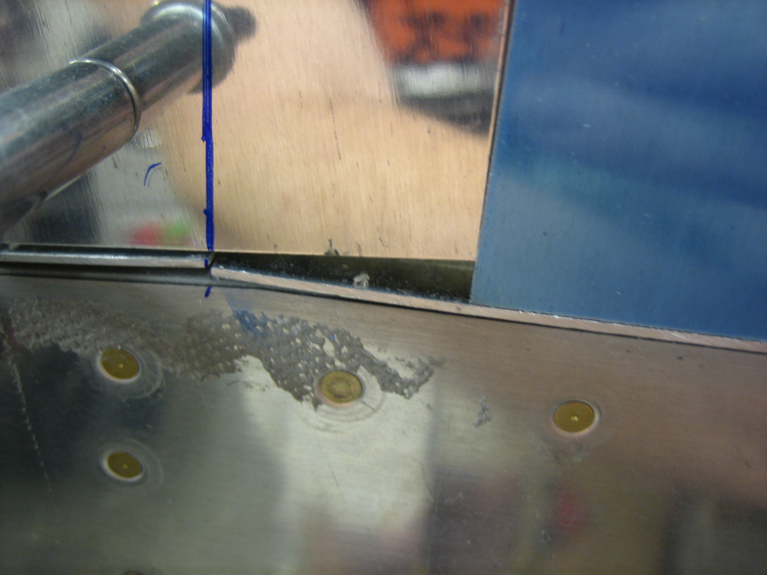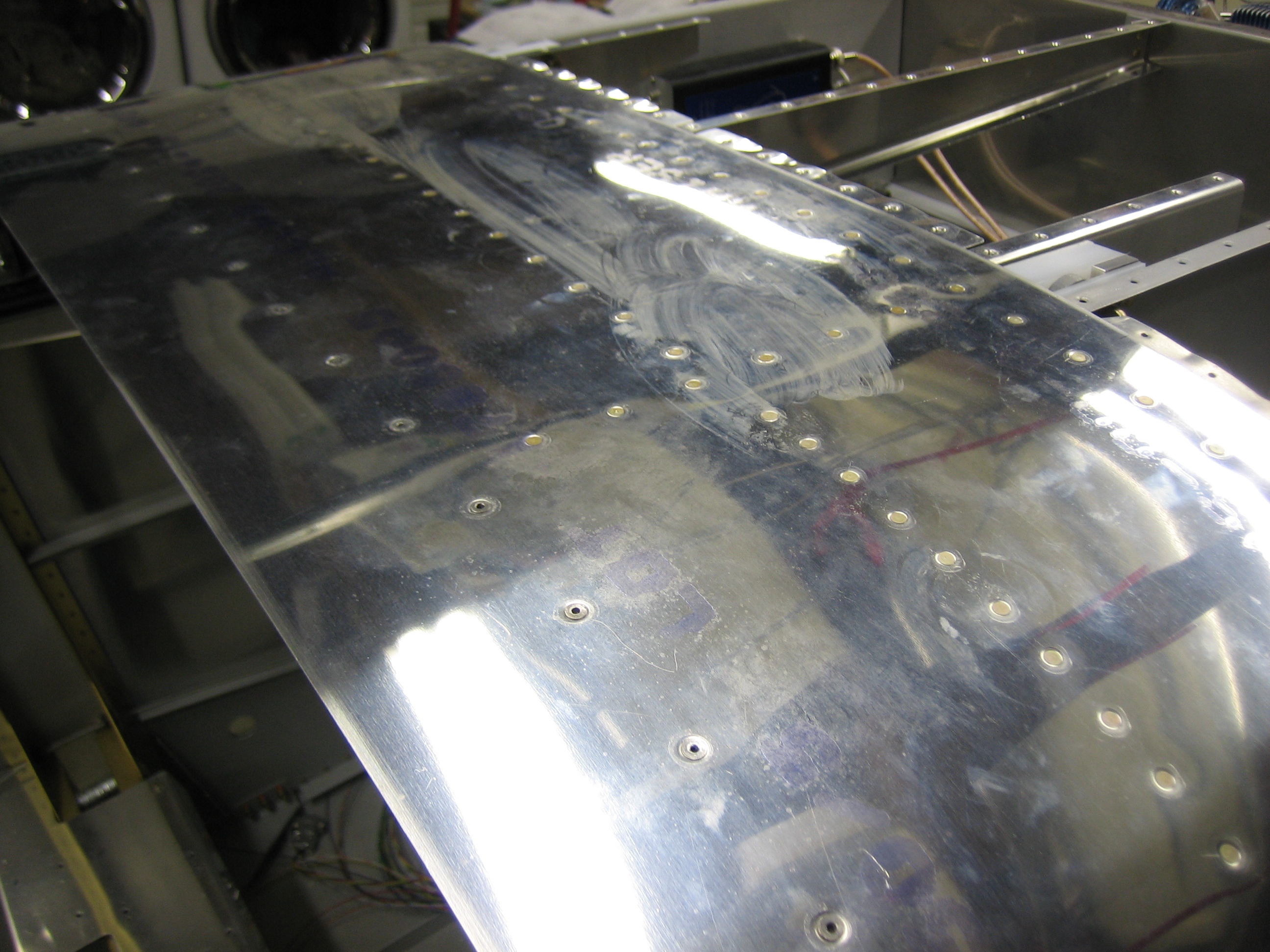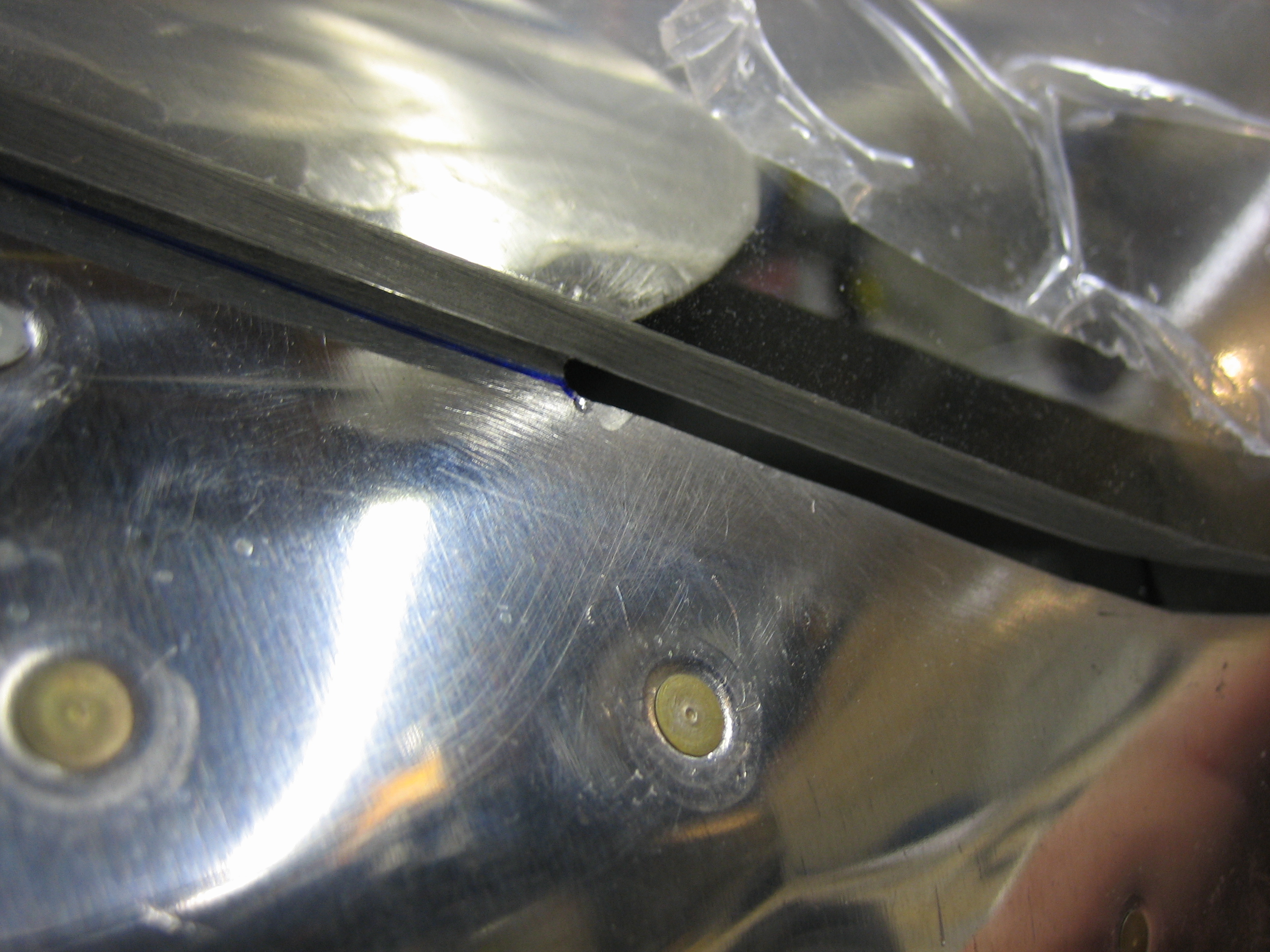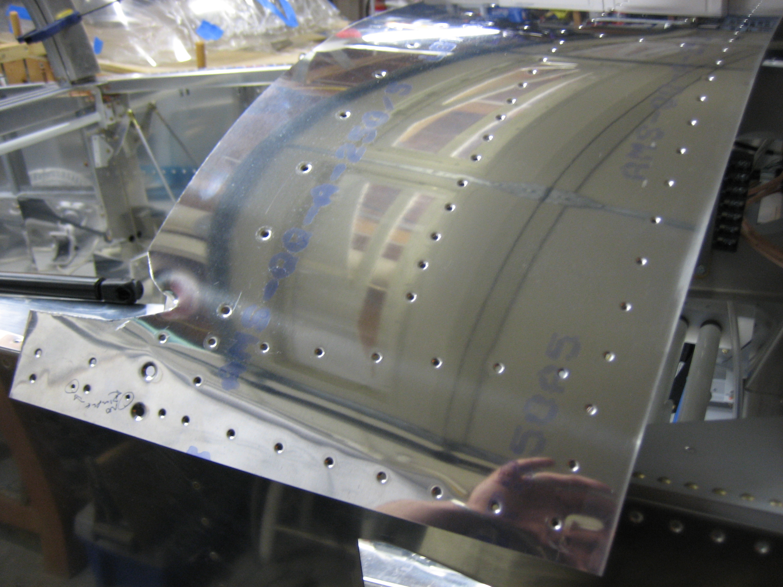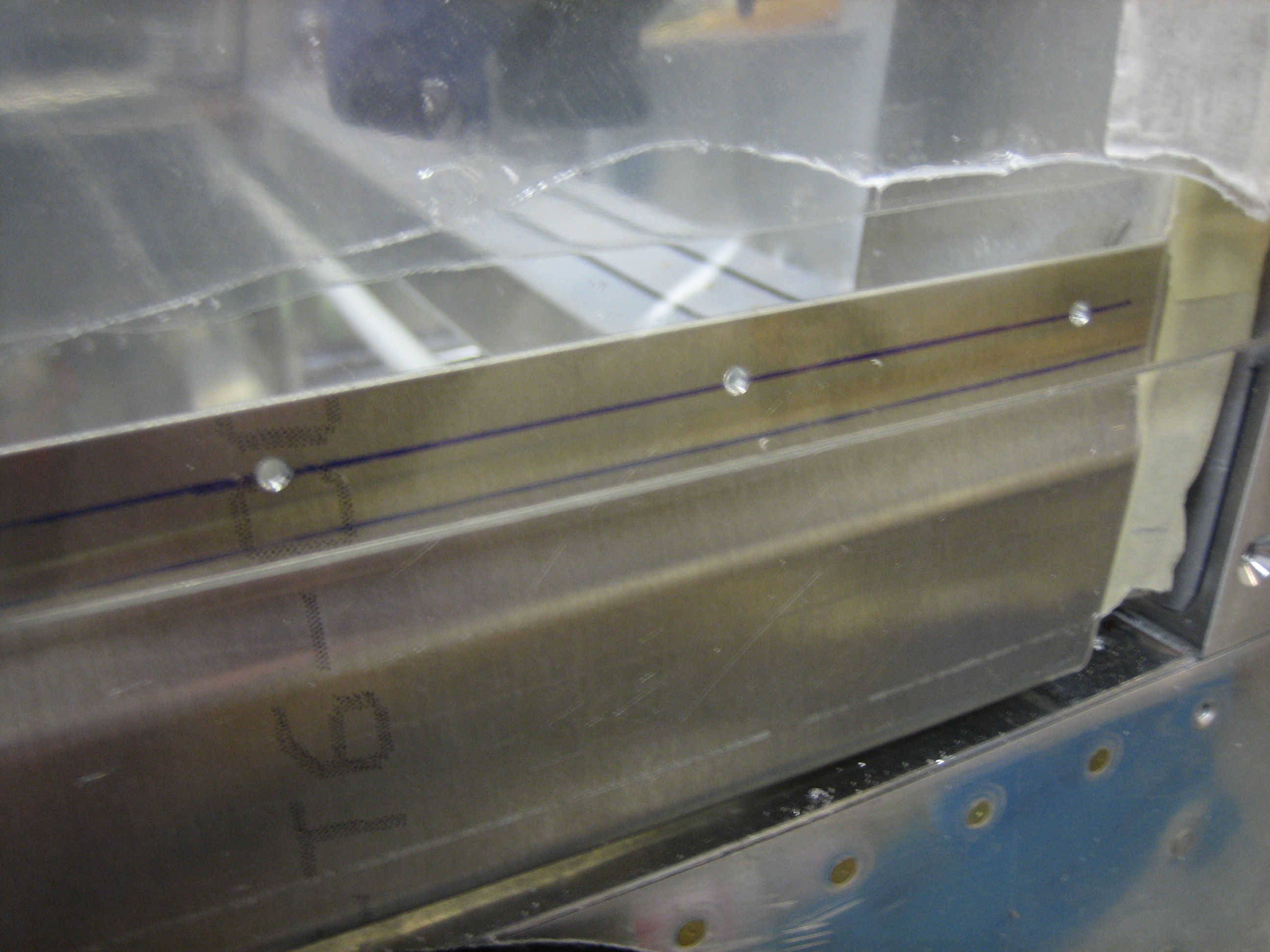 It’s a blurry picture, but we then riveted the skin to the canopy frame channel. This was a bit tricky because the outer canopy frame reinforcement pieces needed to be bent out of the way to reach most of these rivets since it was already riveted on. We couldn’t rivet it on afterward though because there wouldn’t be access to squeeze the rivets above.