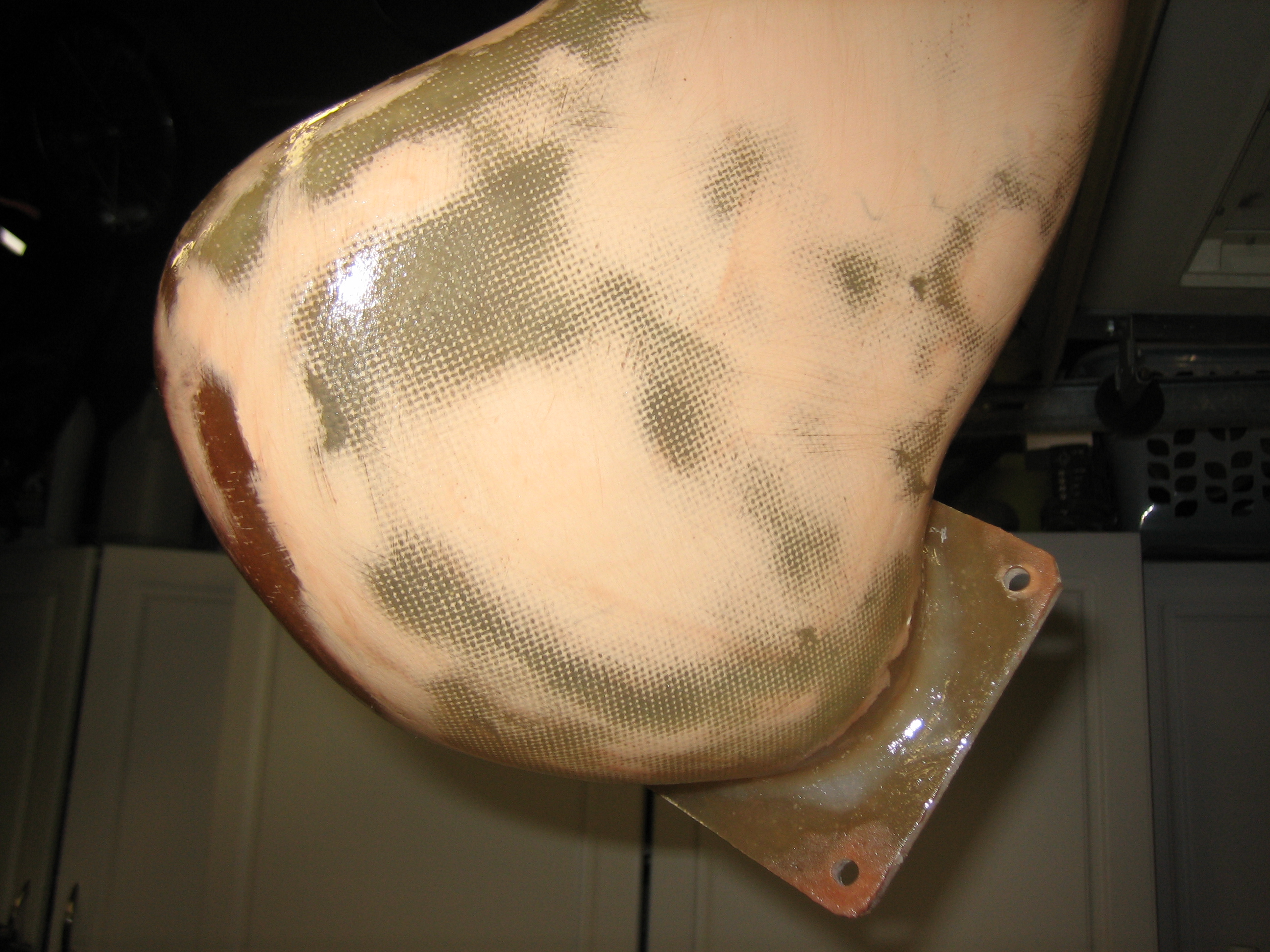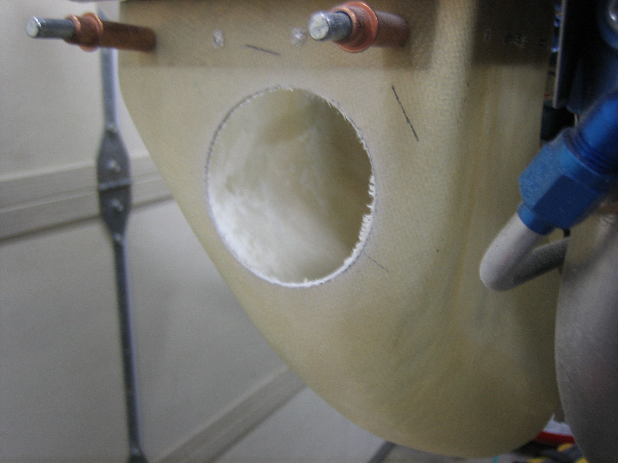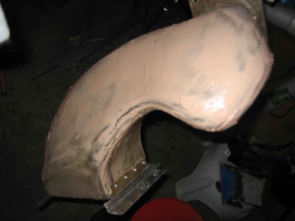 Finally, I sanded and cleaned the surface and flange, then clecoed it down with some epoxy mixed with flox. I then roughly faired in the flange so that there is a nice transition to the snorkel. The flox leaves a fairly rough surface though; I’ll use some filler to smooth this out nicely after it cures.