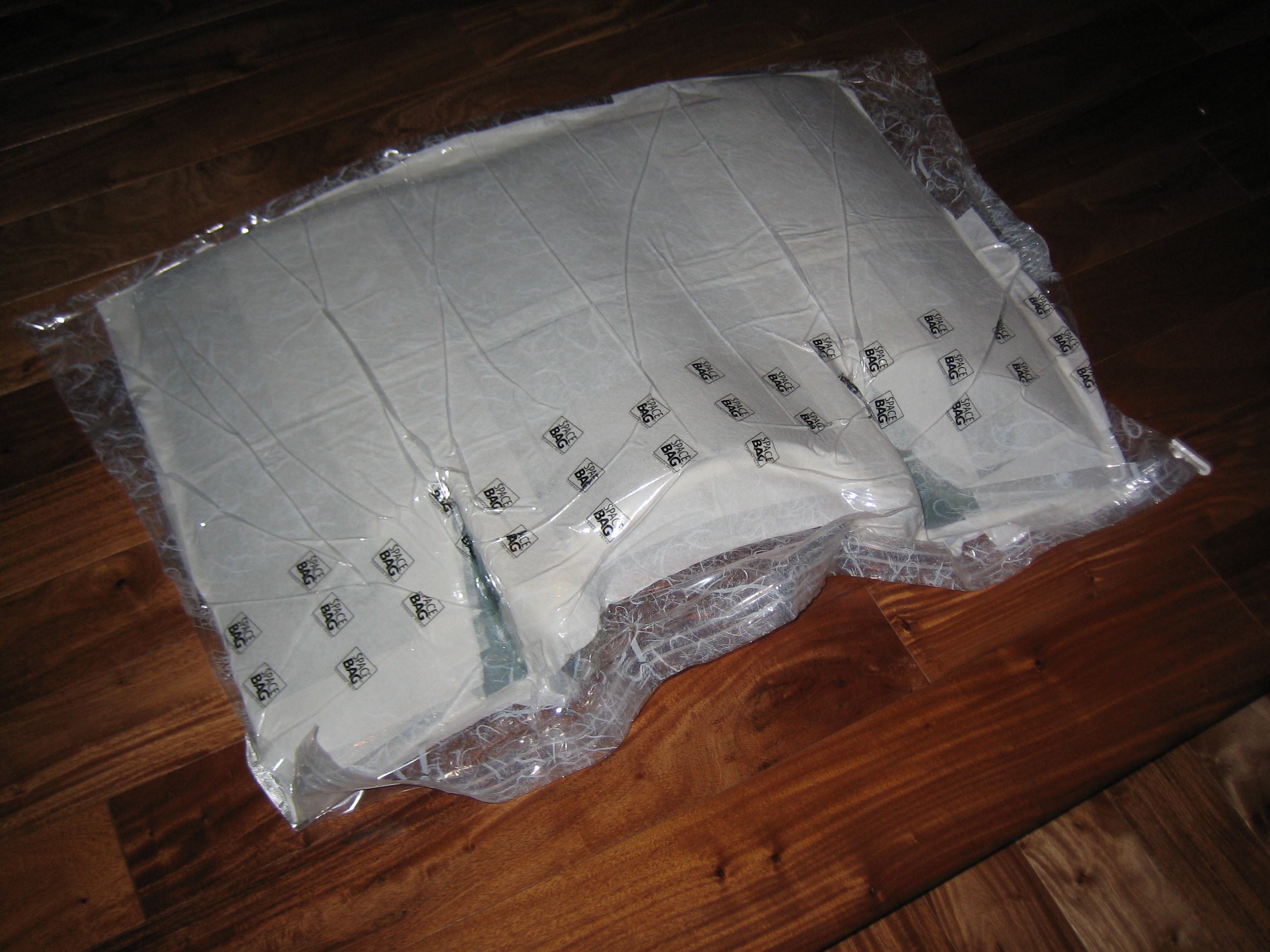 I had been considering buying the equipment to do vacuum bagging, but it’s fairly expensive and I don’t expect to do much of it. After thinking about it a bit though, I stumbled on a really cheap alternative. This is one of those Space Saver storage bags. Most of the bags they sell are too small, but they sell some larger bags labeled as hanging bags, the “suit” sized bag was perfect for the plenum and cost around $10. The material isn’t stretchy, so you’ll have to coerce it into corners, but there’s enough slack to do this. Over the two layers of glass, I added a full layer of Dacron and a couple of layers of paper towels to absorb excess resin. I then used our vacuum cleaner to suck out all of the air. This worked surprisingly well, and the vacuum was still maintained the next morning.
