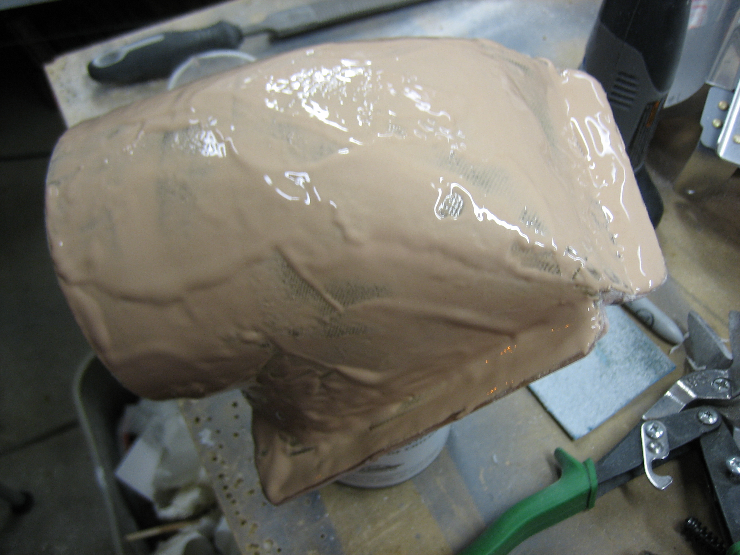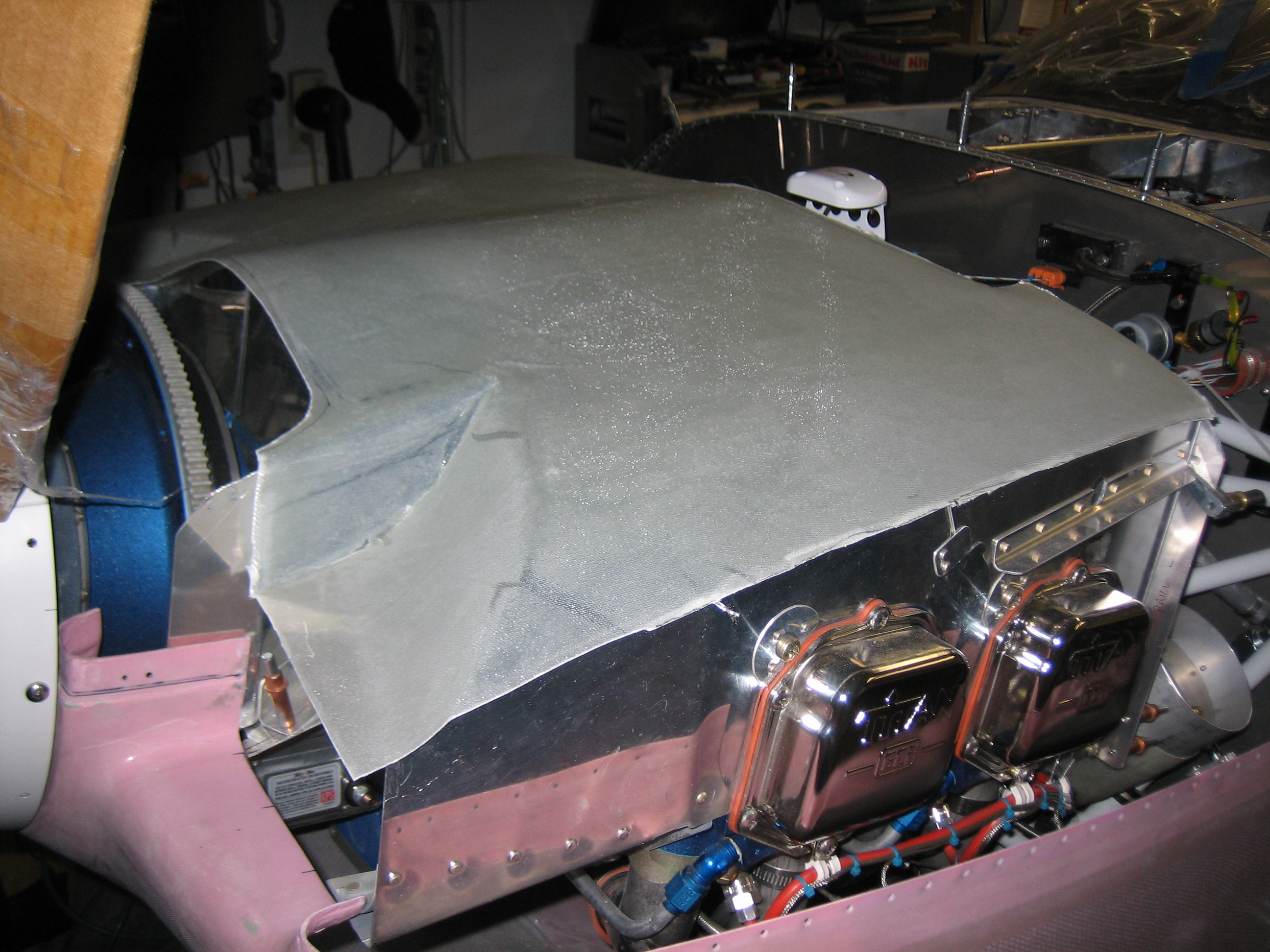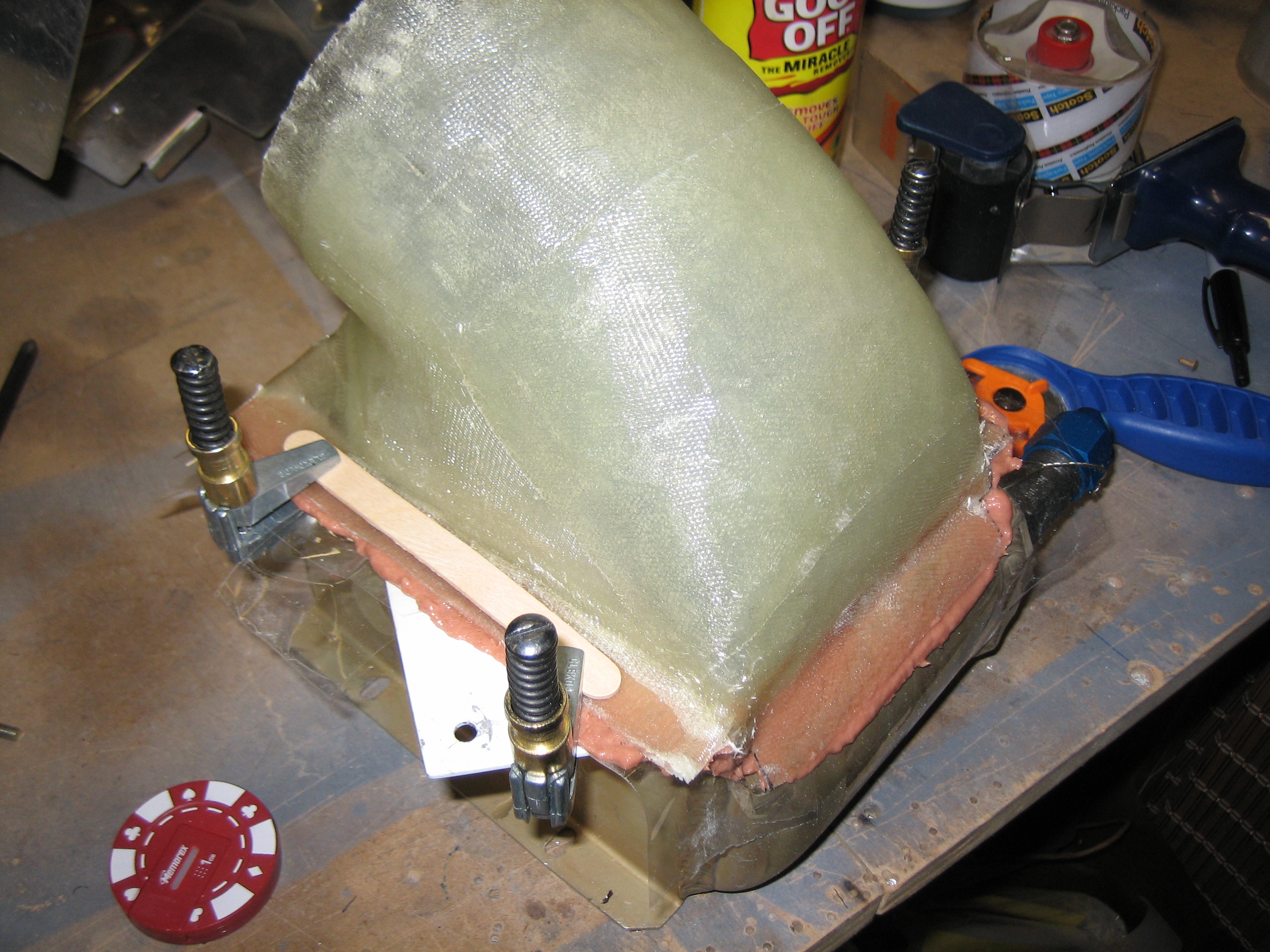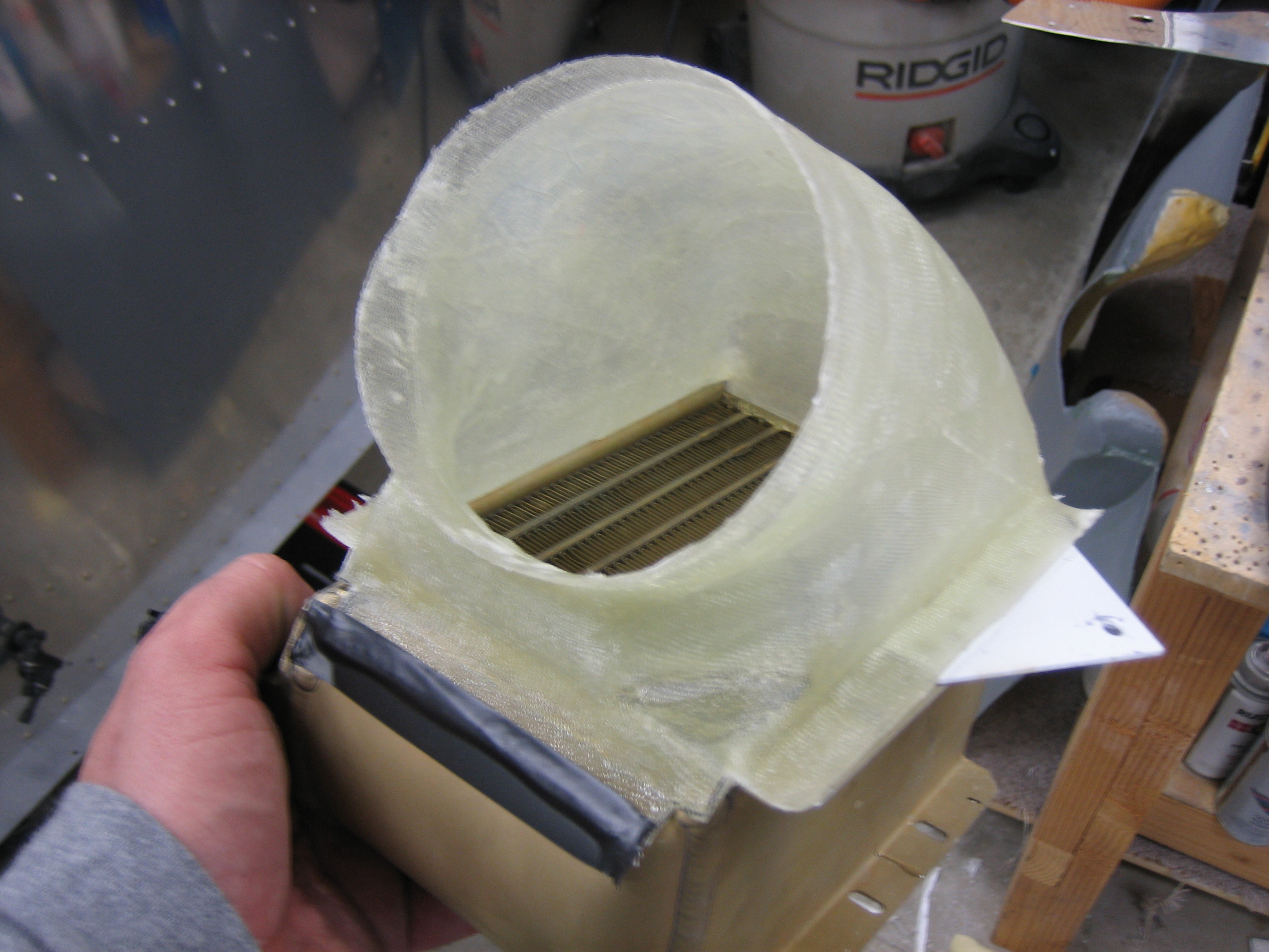 I started laying up the plenum tonight. I’m starting with two layers of glass because I’m going to have to narrow the inlets a bit and create little “ears” out the outer ends to attach the plenum to the baffles. I’ll layup a couple of additional layers once I’ve established the final shape.