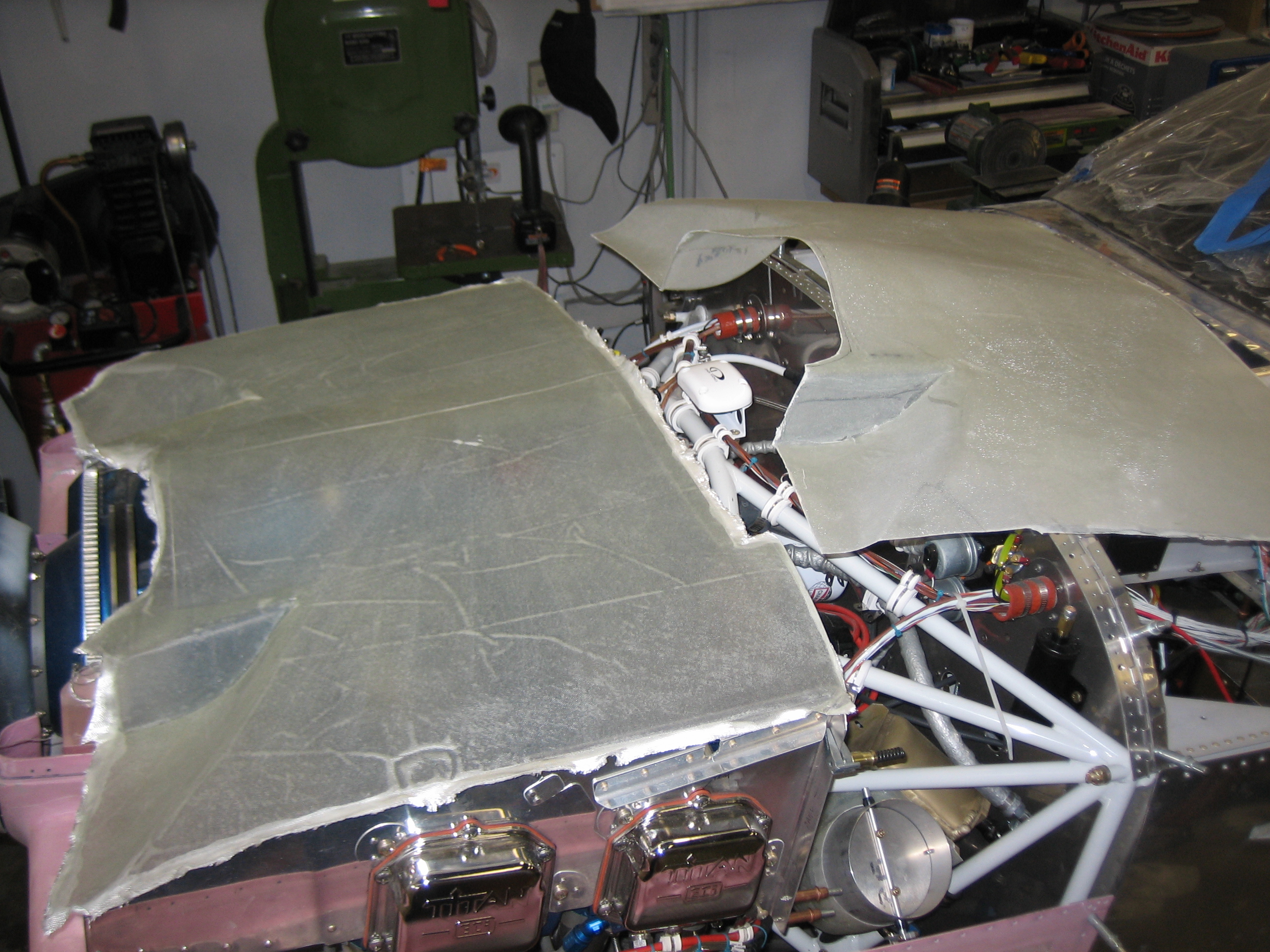 These corners were touching the underside of the top cowl. I’ll want a good 3/8″ of clearance between the top of the plenum and the button of the top cowl to allow for engine movement. I trimmed the forward aluminum baffles in order to lower this part of the plenum almost 1/2″. Unfortunately, this lowers the inboard edge of the ramps a little too much. I’ll have to cut and reglass the side of the ramp to raise the forward edge slightly. I’m really glad I only laid up two layers of glass so far as it makes it really easy to bend and cut. I’ll probably end up laying up the additional layers right on the engine so that the plenum fit perfectly.