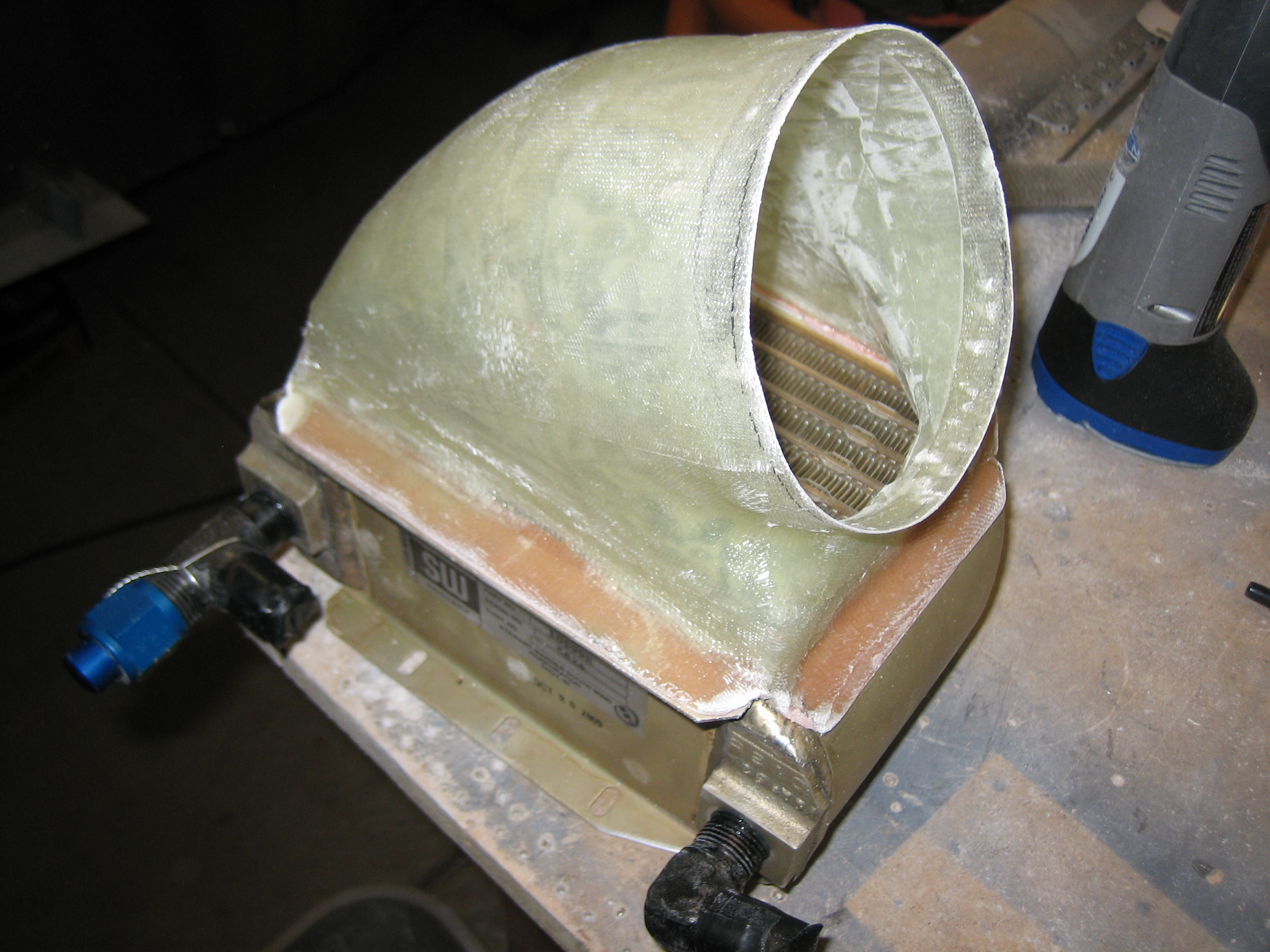 Last night, I laid up some additional glass over the oil cooler plenum using the high-temperature epoxy. You can see here that I wrapped the epoxy down the side of the oil cooler. I also extended the circular flange forward another 1/2″ or so to make it easier to mount the butterfly valve.