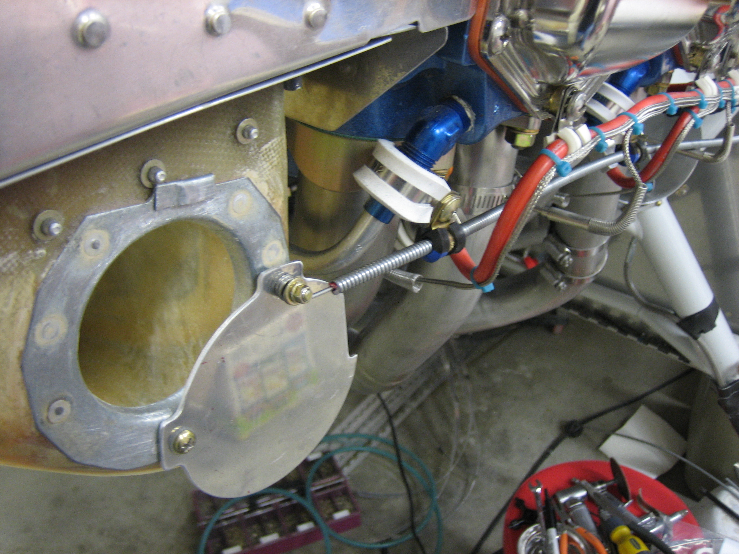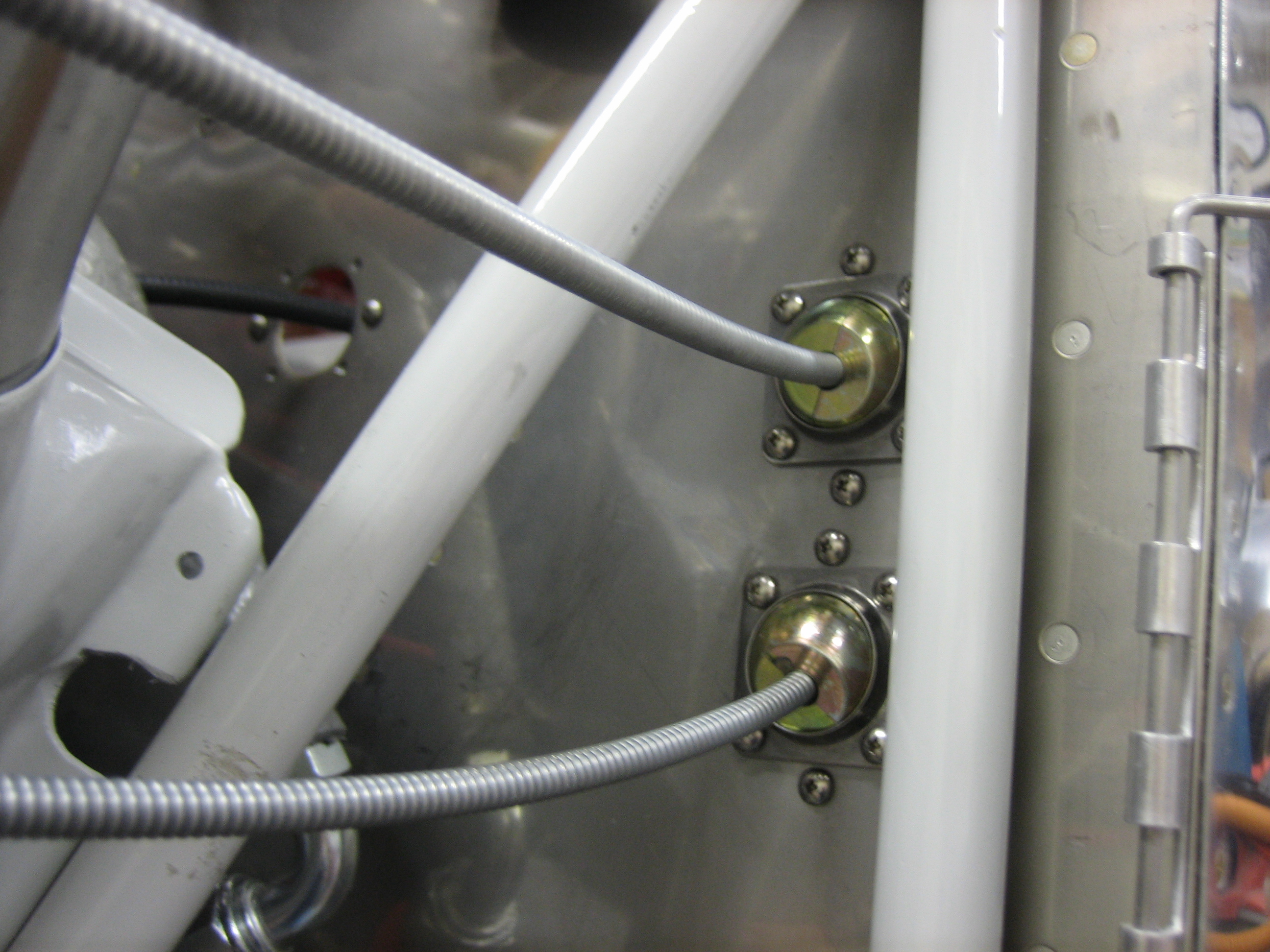 I drilled two additional holes in the firewall for the eyeball pass-throughs. The top hole is for the cable that will control the oil cooler butterfly valve. The lower hole is for the cable that will open the alt air port.