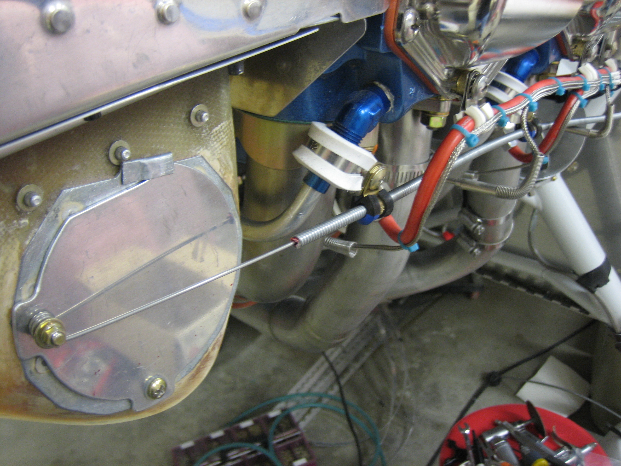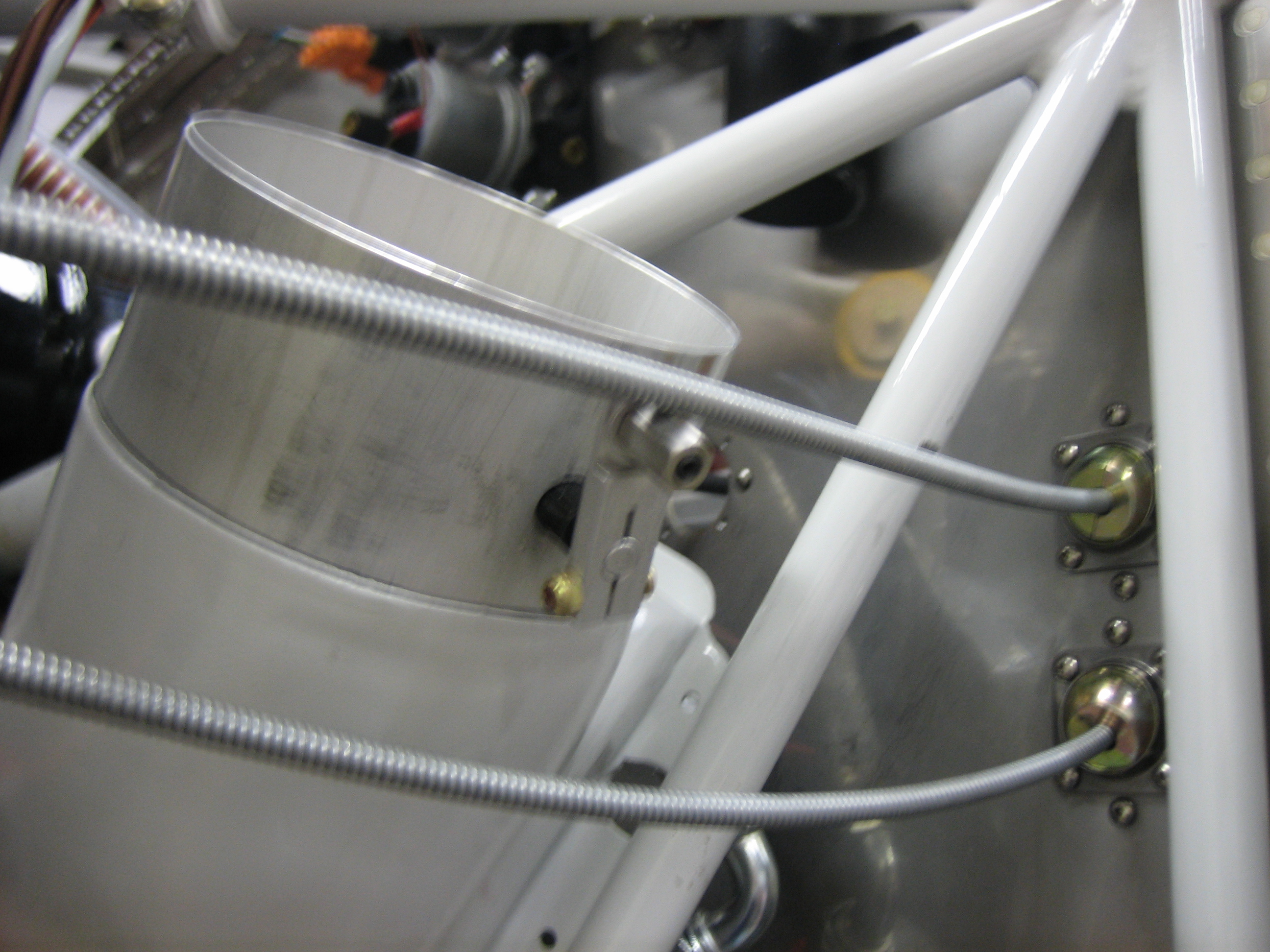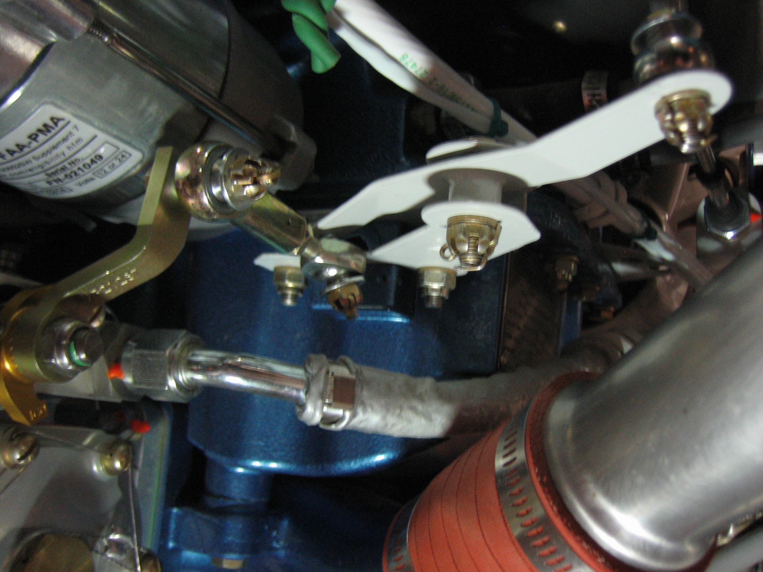 I hooked up the alt air cable tonight. The cable is anchored to the oil return lines on both cylinders #2 and #4. I will have to replace the white silicone adel clamps with standard black rubber ones because the silicone ones can move around a little, but all this has to come apart when the panel is pulled out of the plane for painting/ labeling. You can also see that the aft end of the visible cable dips down and comes very close to the EGT probe. I’ll probably fashion a small bracket to keep the cable going straight back until aft of the baffles.