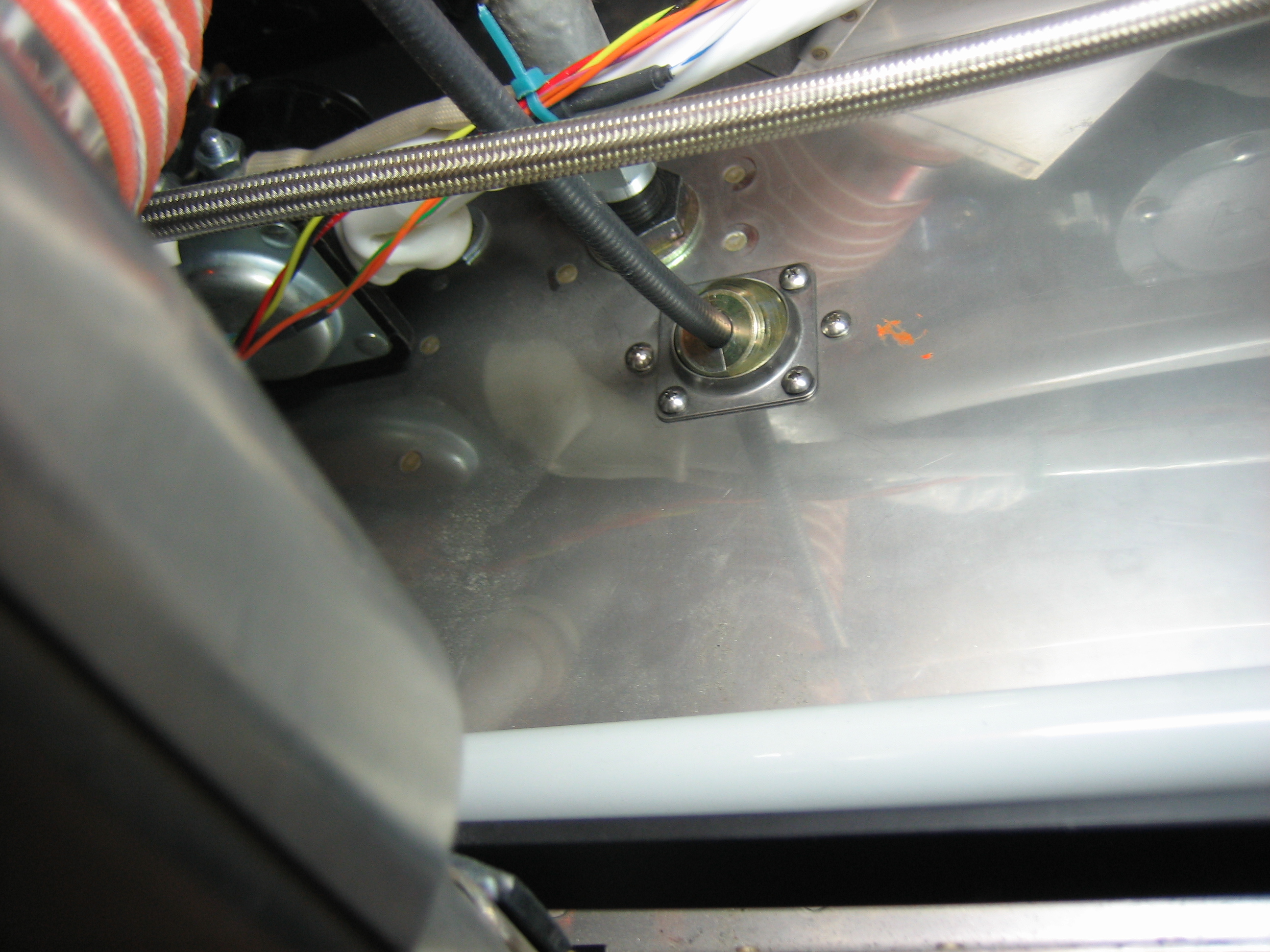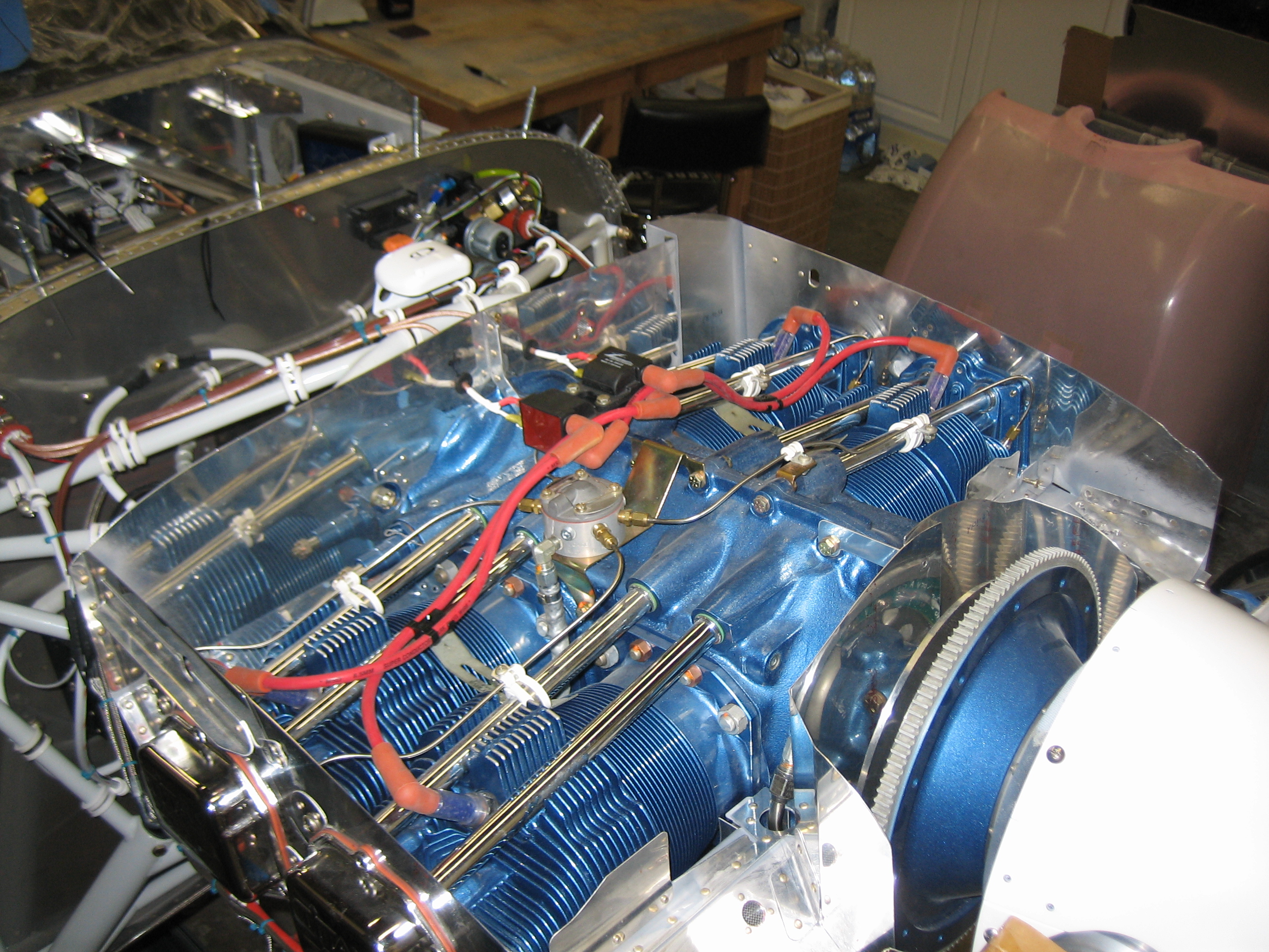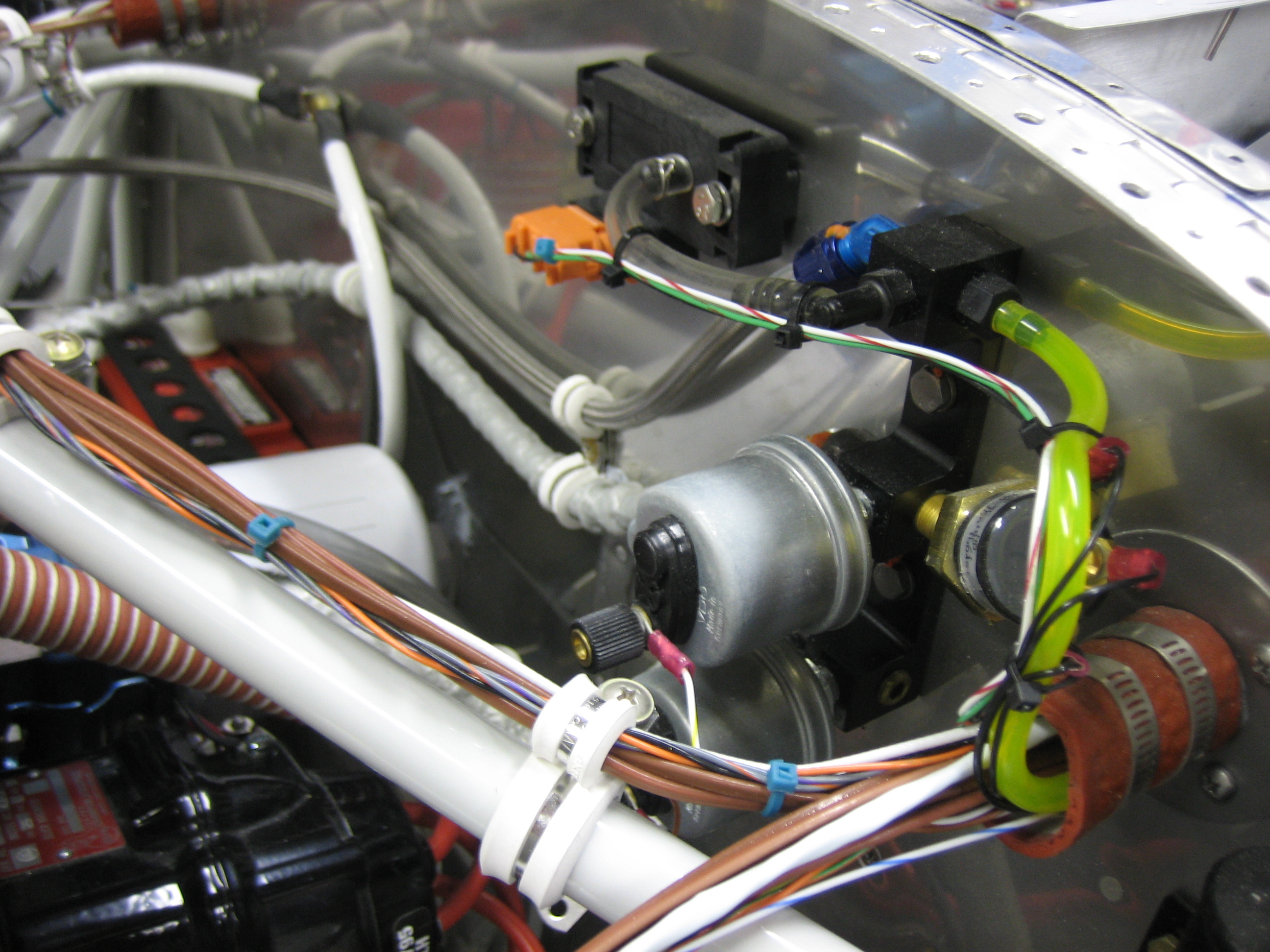 I hooked up the alt air cable tonight. The cable is anchored to the oil return lines on both cylinders #2 and #4. I will have to replace the white silicone adel clamps with standard black rubber ones because the silicone ones can move around a little, but all this has to come apart when the panel is pulled out of the plane for painting/ labeling. You can also see that the aft end of the visible cable dips down and comes very close to the EGT probe. I’ll probably fashion a small bracket to keep the cable going straight back until aft of the baffles.