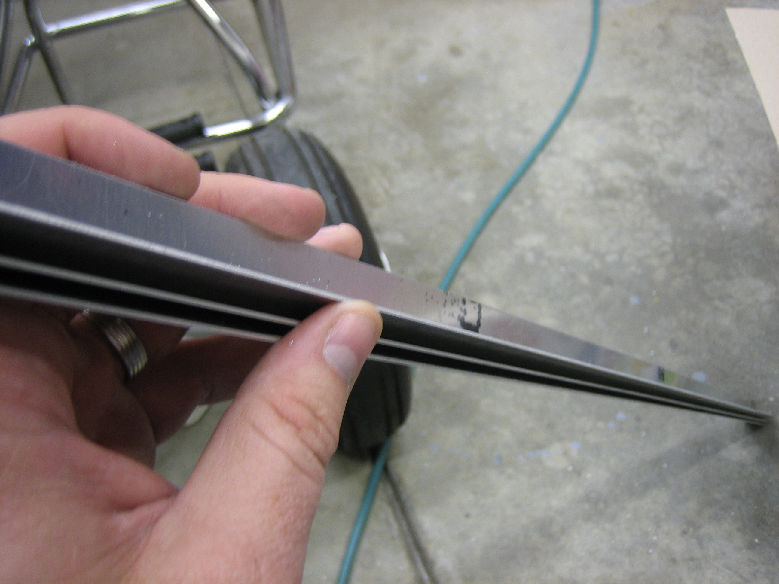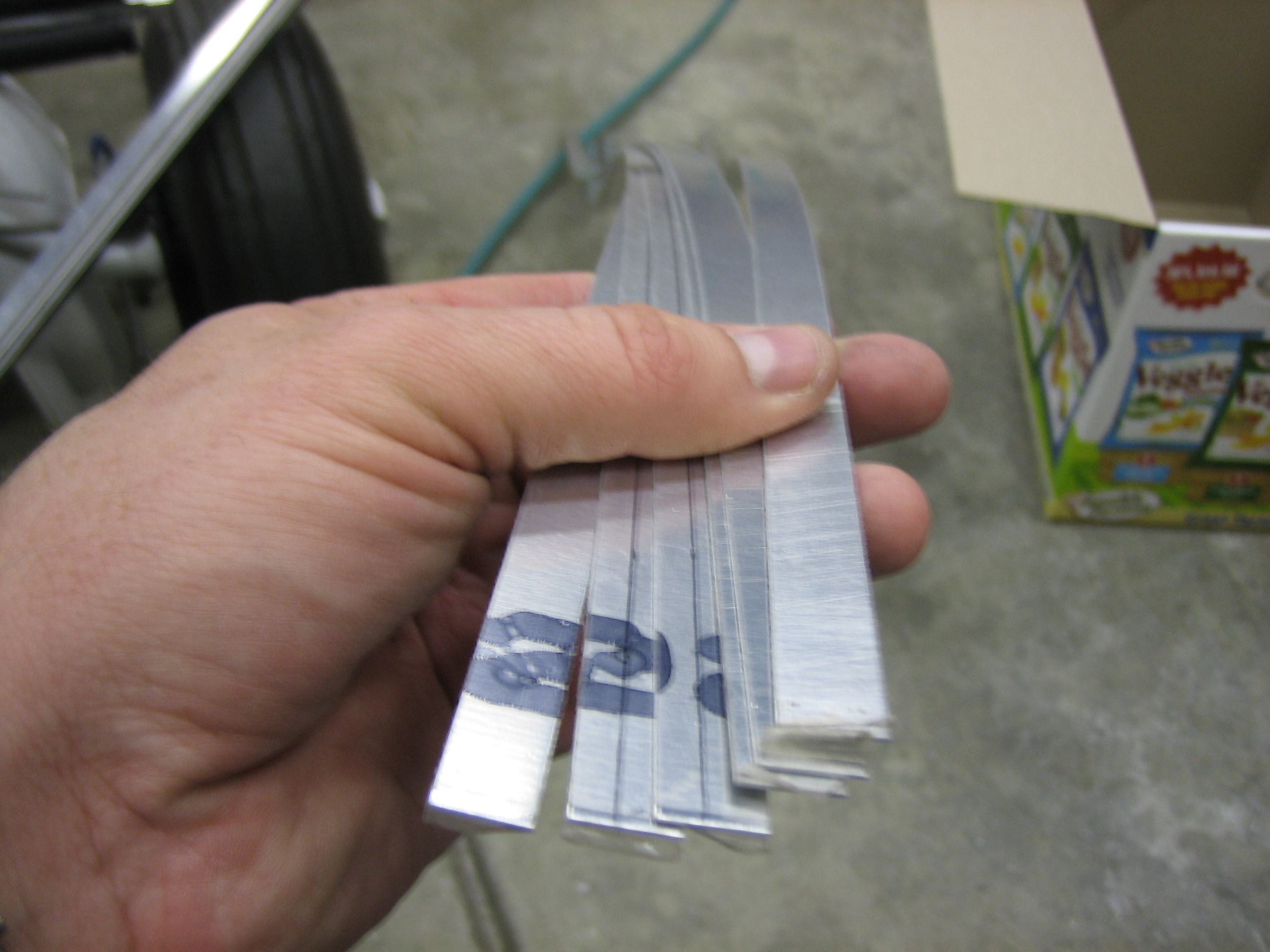 To space the wingtip hinges away from the skin, I need a couple of 0.024″ spacers under each hinge. I cut a few of these by hand, but that was a real pain and it really twisted them up. I recently got a lifetime membership to the TechShop, so I ran down there and used their shear to cut 6 more 1/2″ wide strips. Even counting the drive, this was way faster than doing this with snips (not to mention how much easier it was on my hands).