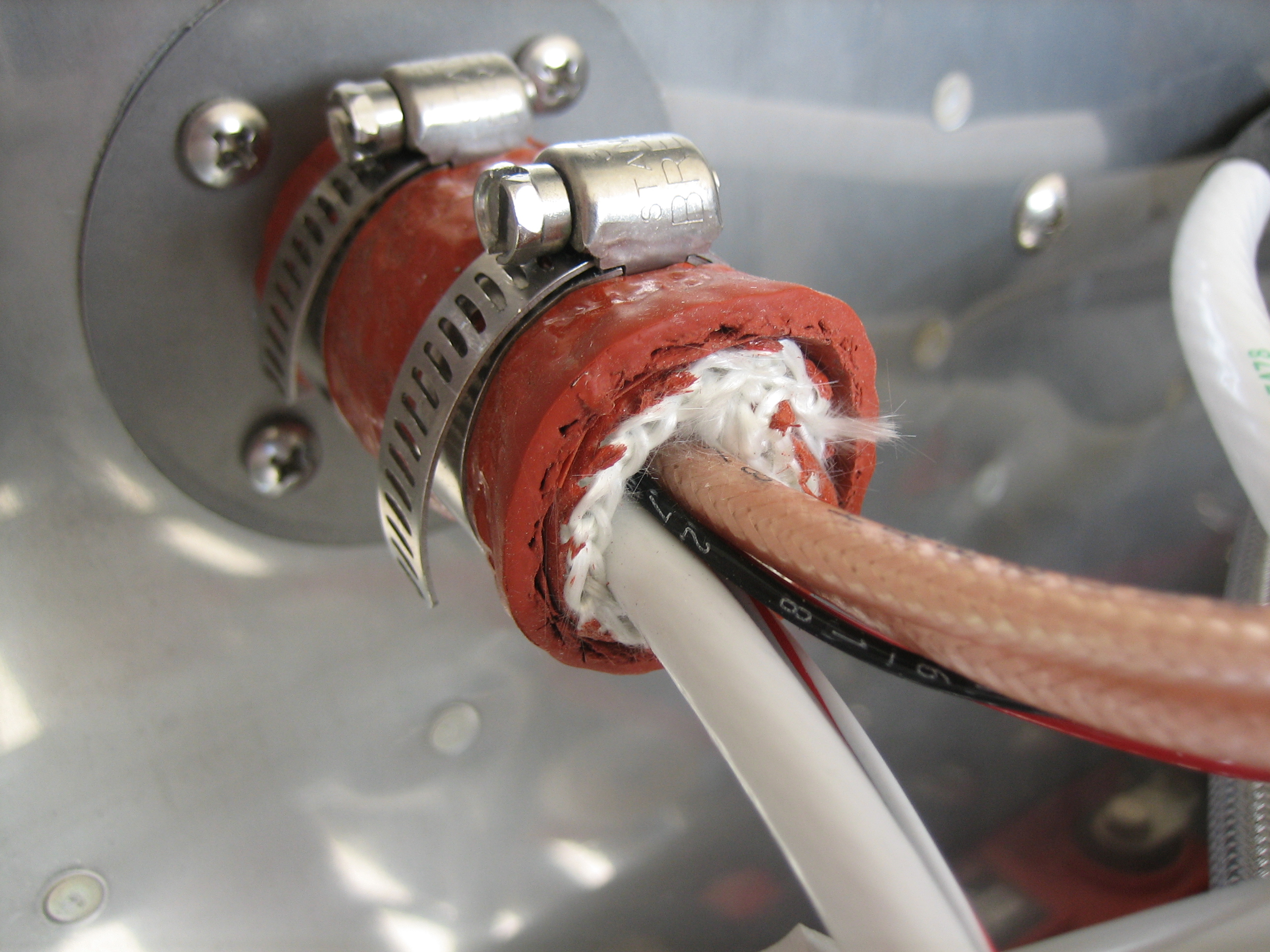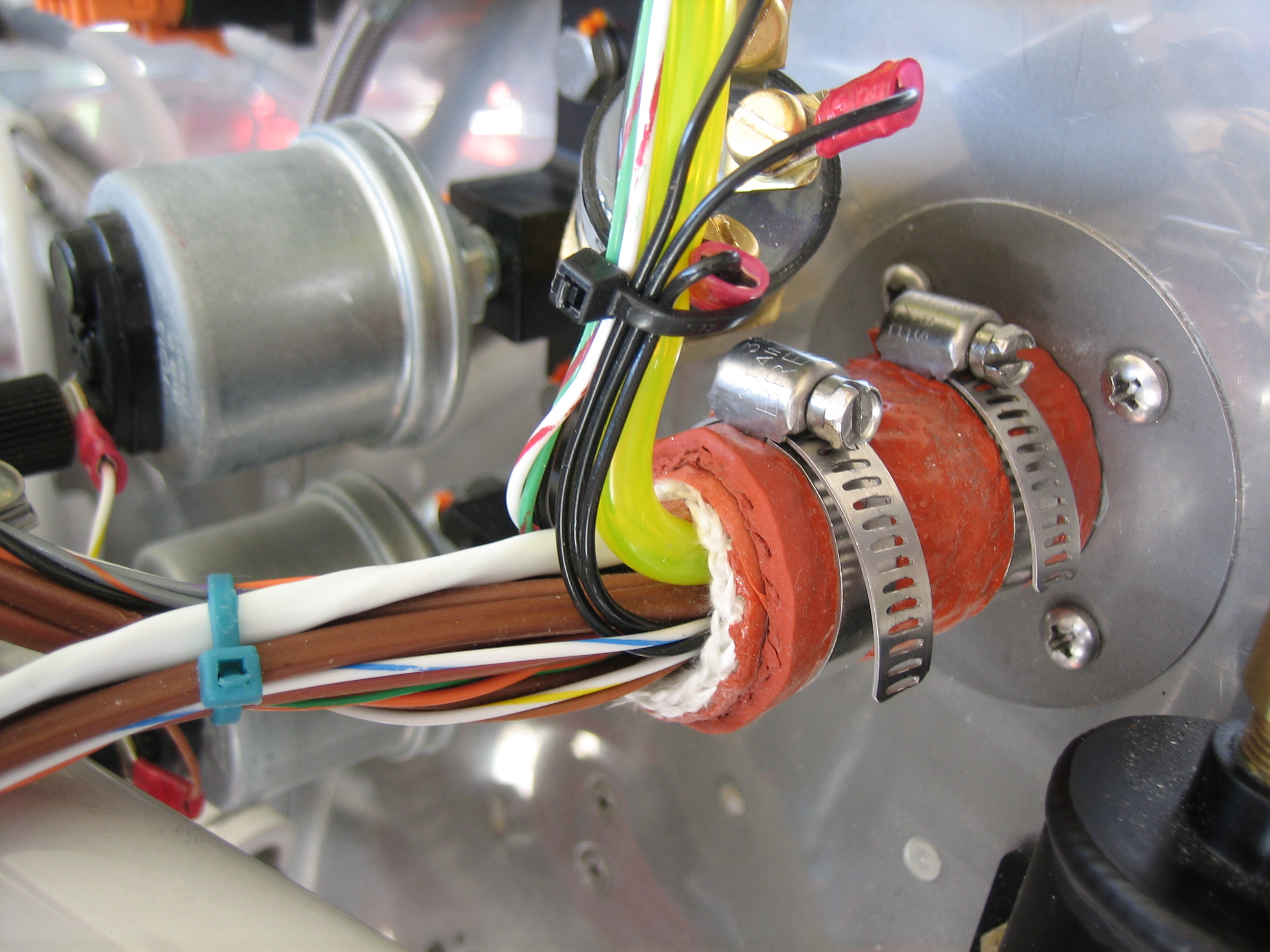 I’m done running wires through the firewall (I hope), so I sealed up the pass-throughs. The wires are wrapped tightly with some silicone impregnated fiberglass and then wrapped that with silicone tape. The silicone impregnated fiberglass sleeve is then slid over the whole mess and squeezed tight with the worm clamps. The back one tightens against the flange and the front one tightens against the wires. This is the one on the right side of the firewall.