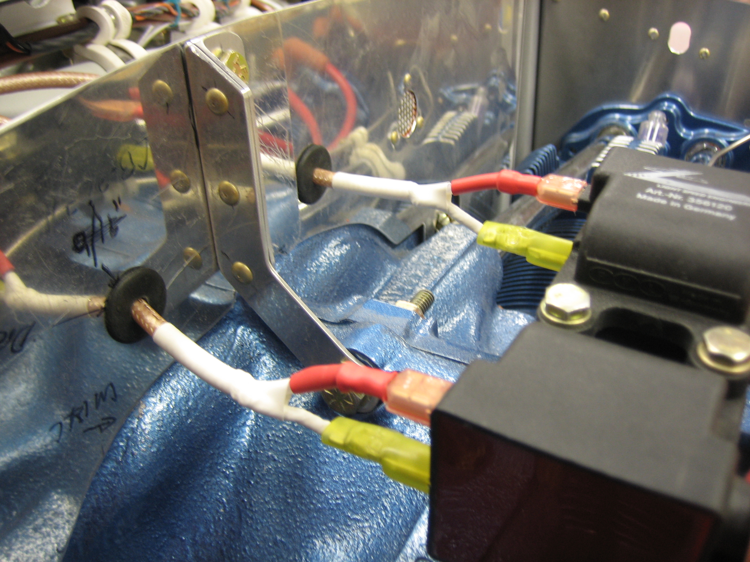 I cut the high-tension leads down and installed the fast-on connectors. You can see that I used some large rubber grommets that allow me to pull the fast-on connectors through the baffles so I can remove them.