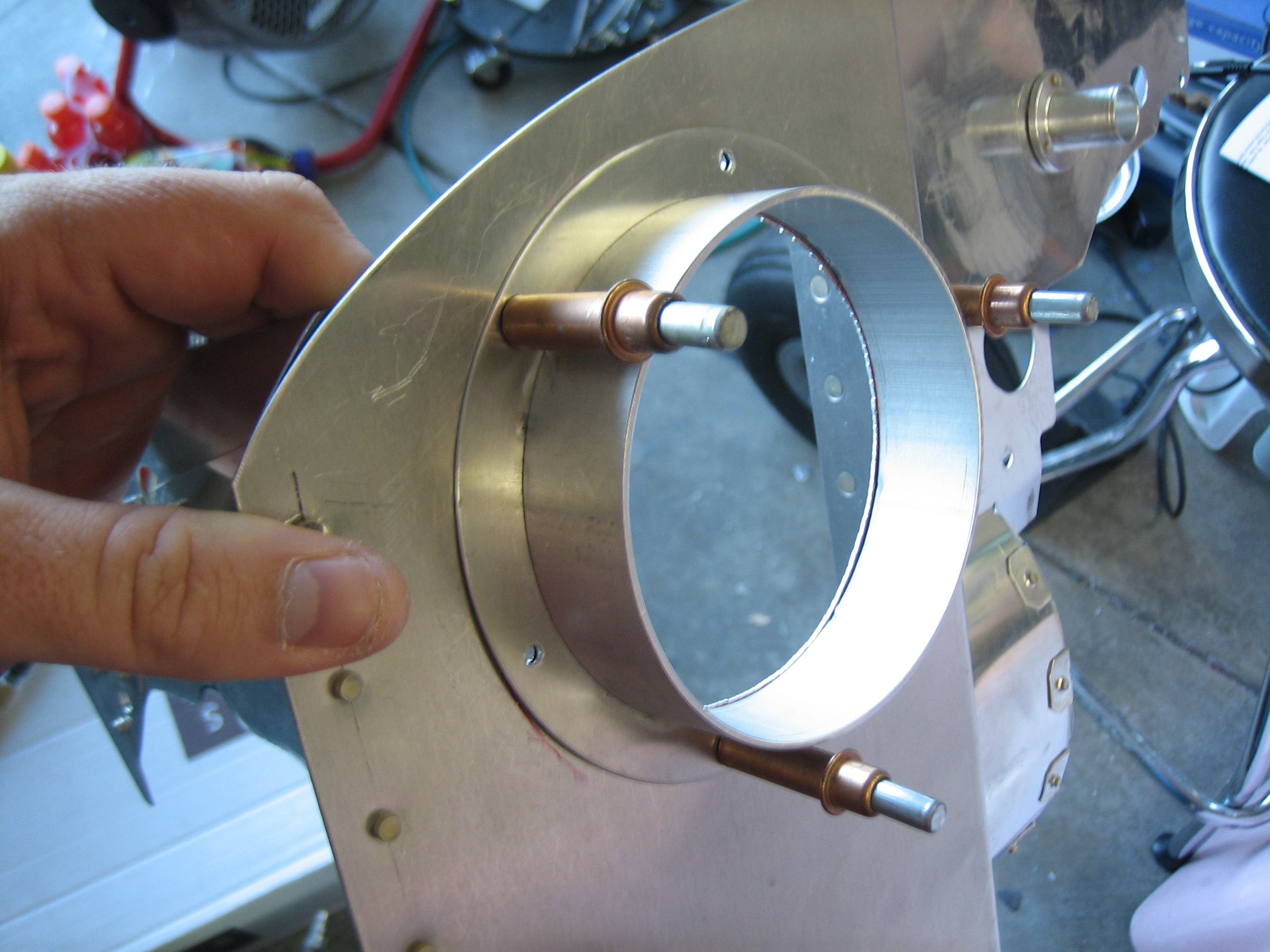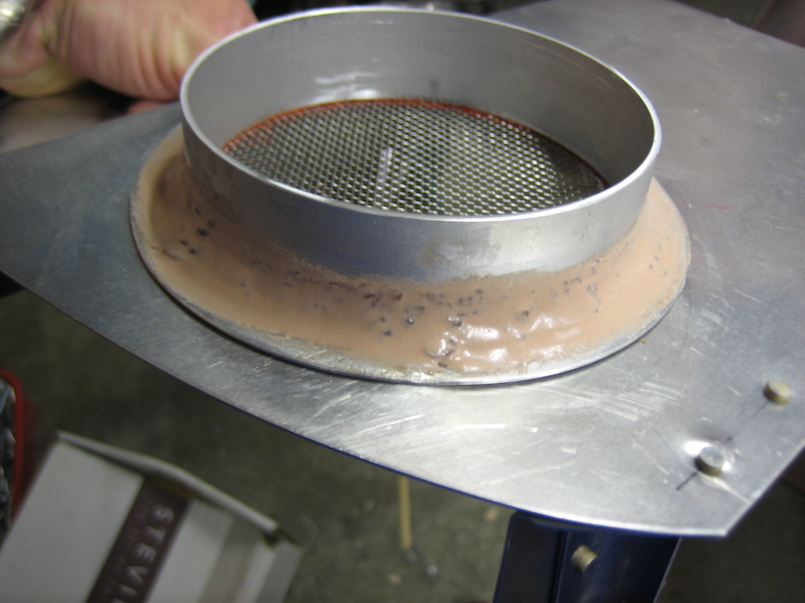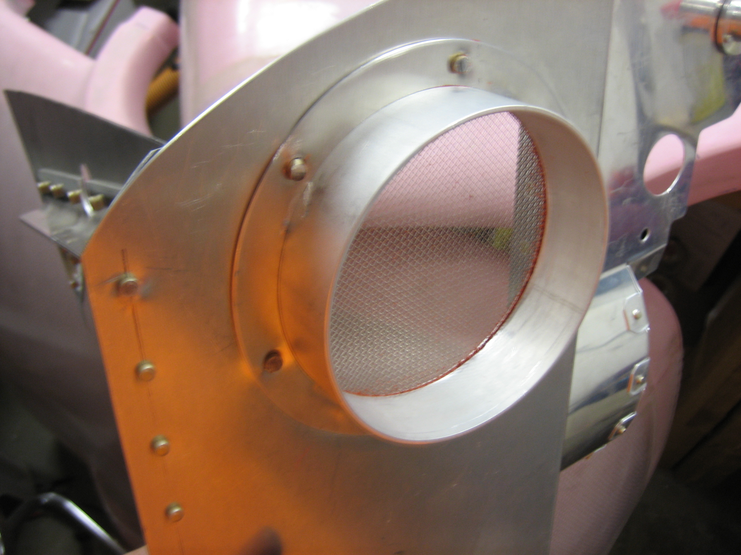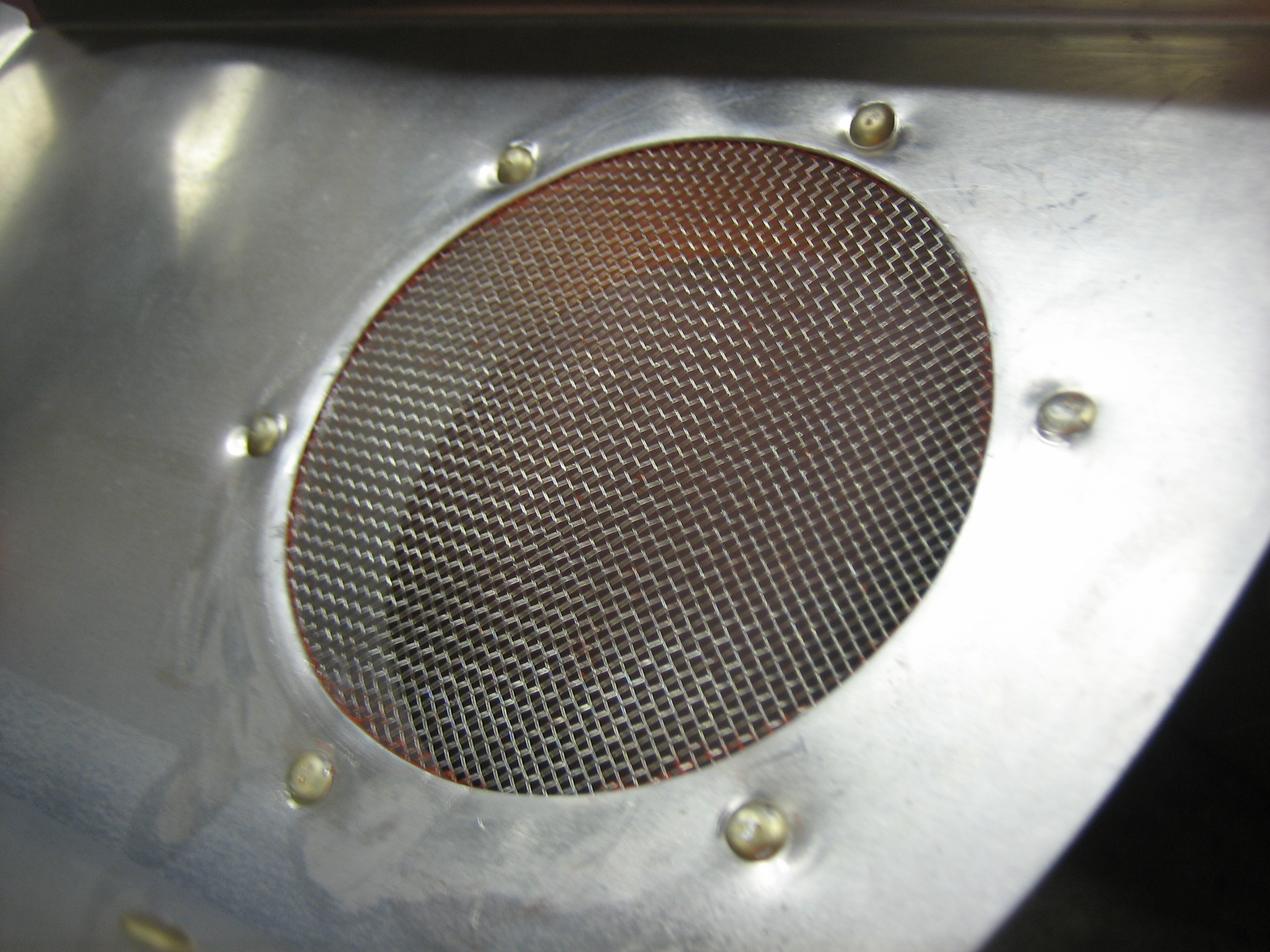 I cleaned up the hole and cut a piece of stainless steel screen to fit. I then riveted everything together with some RTV. Here’s the back side of the baffles where the SCAT tube will attach.