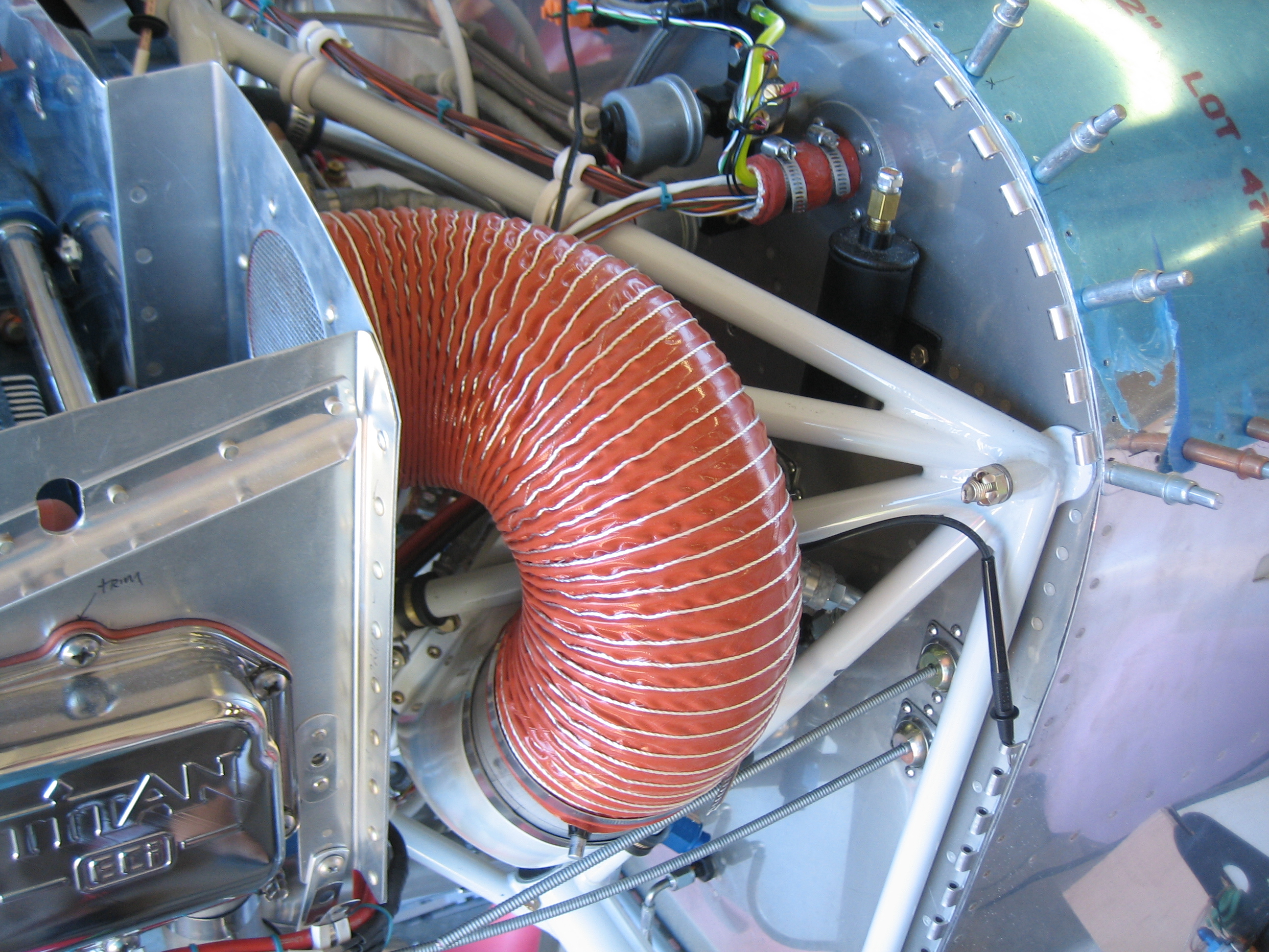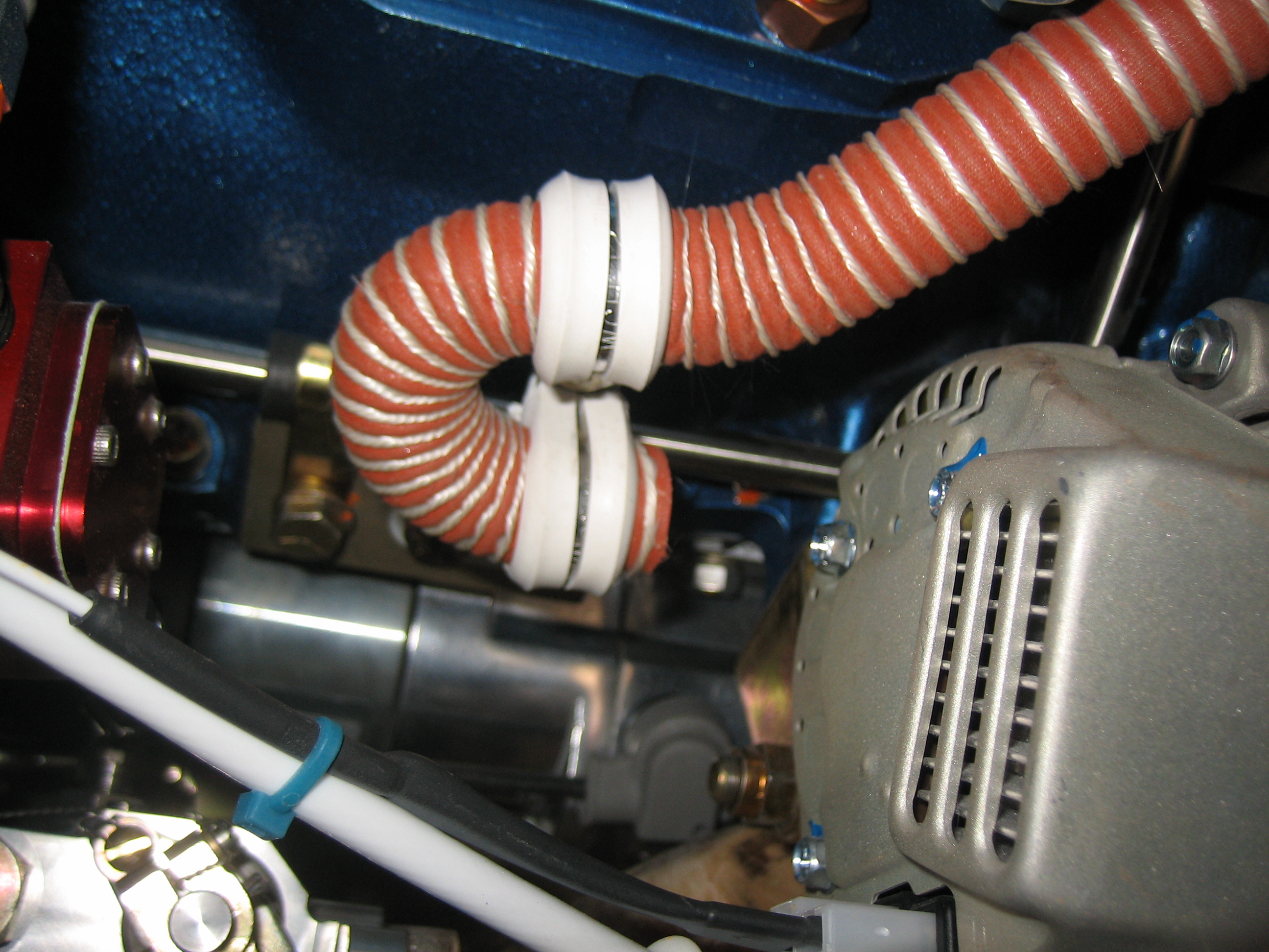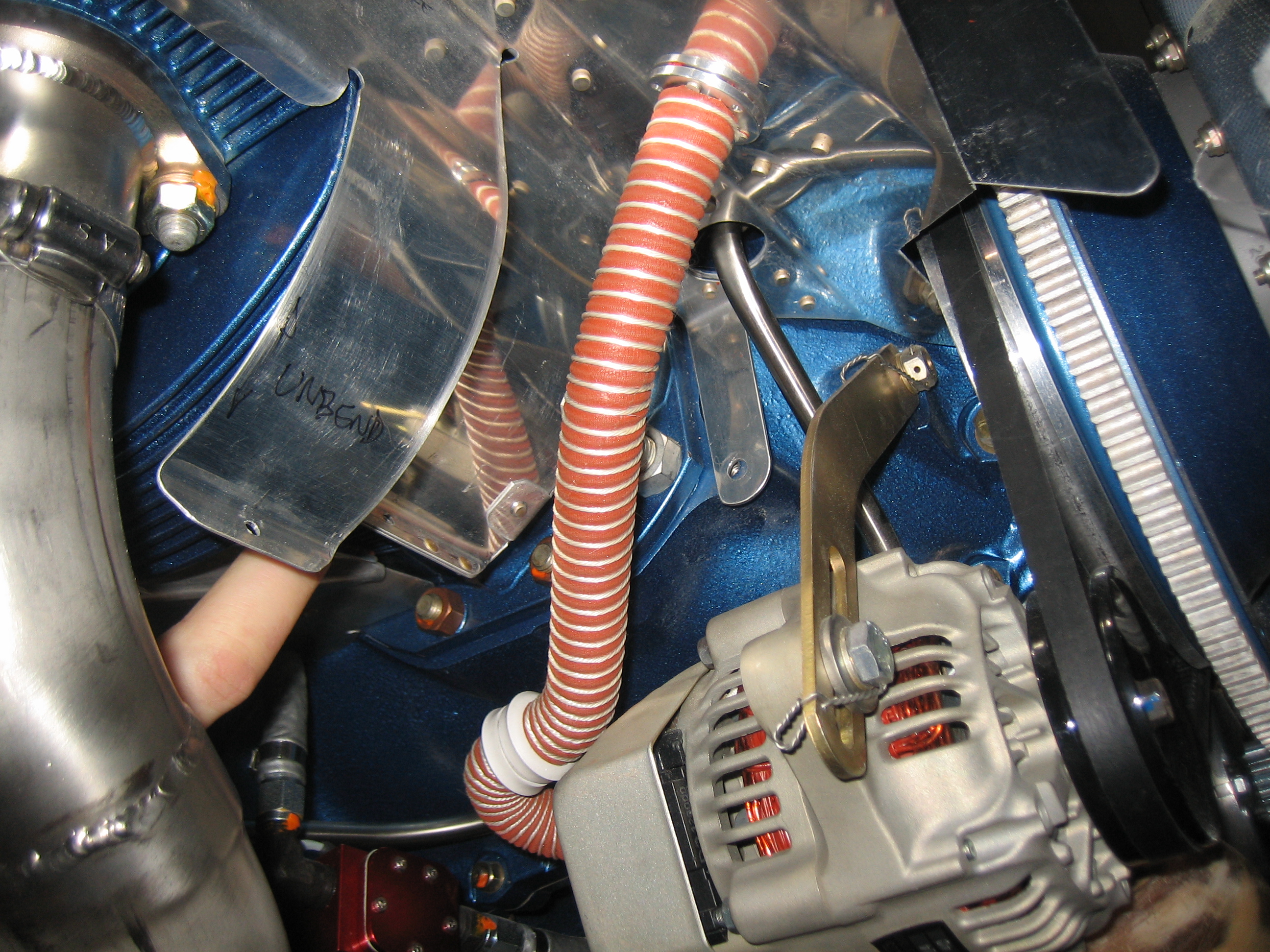 I fit the alternator cooling blast tube. It runs down between the #1 cylinder and the alternator and then turns forward to point at the back of the alternator.