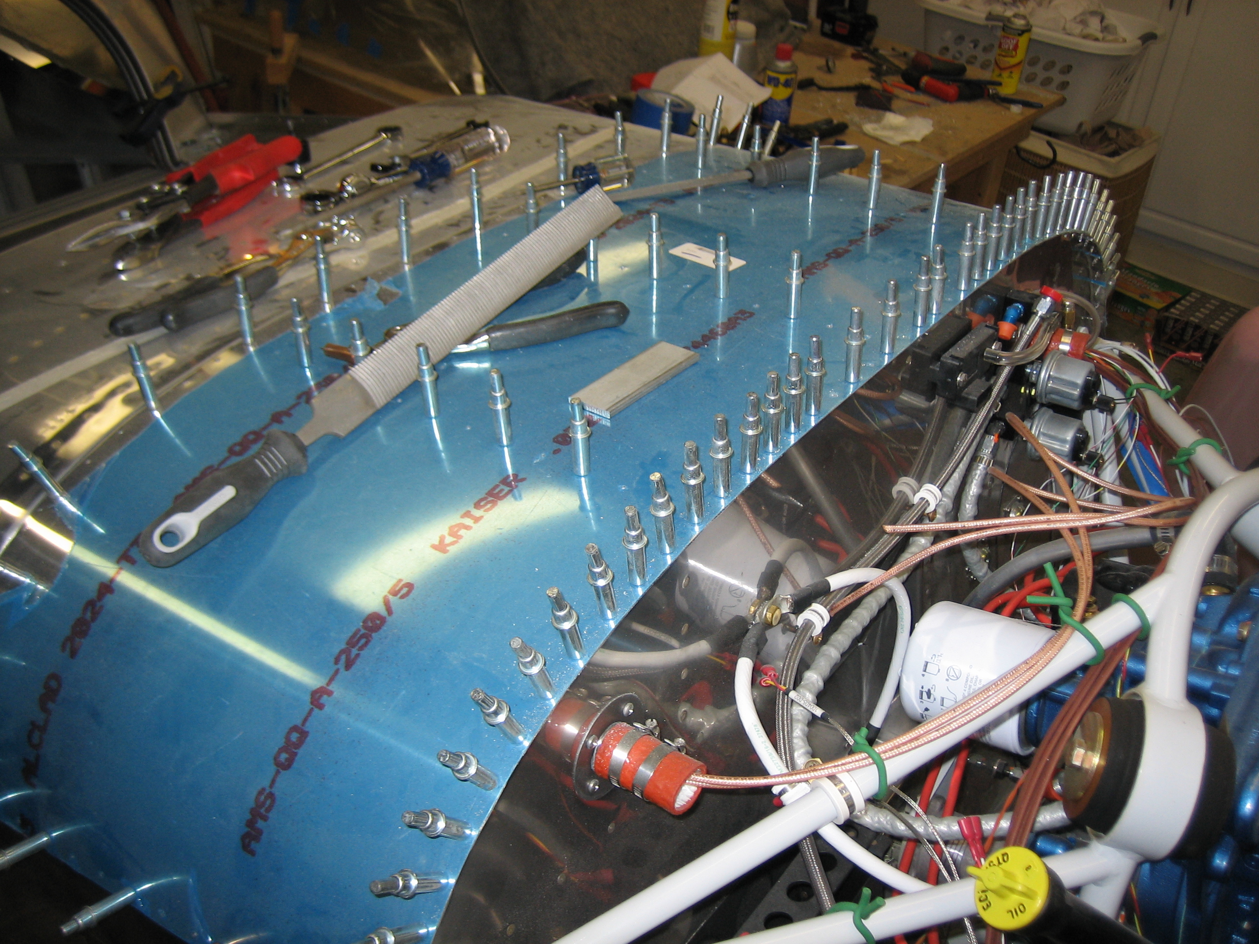 I’ve been laid up on the couch for the last day and a half with the flu, but I’m starting to feel better, so I’ll push myself as usual :-).  I started by clecoing the forward top skin to the fuselage so that I could file the firewall flange back flush with the skin.  This is because the cowl flange butts up against this skin, but it’s quite a bit thicker.