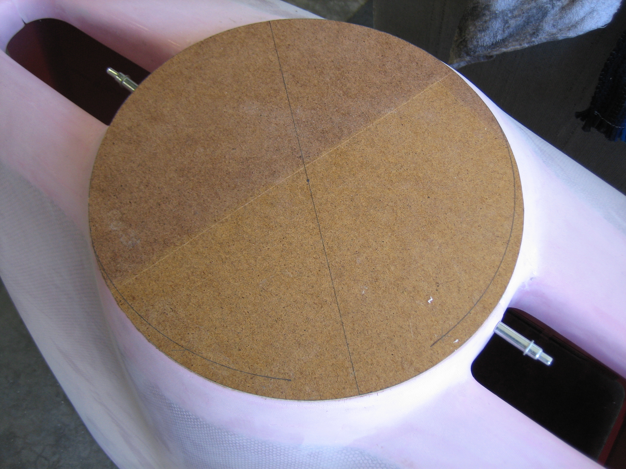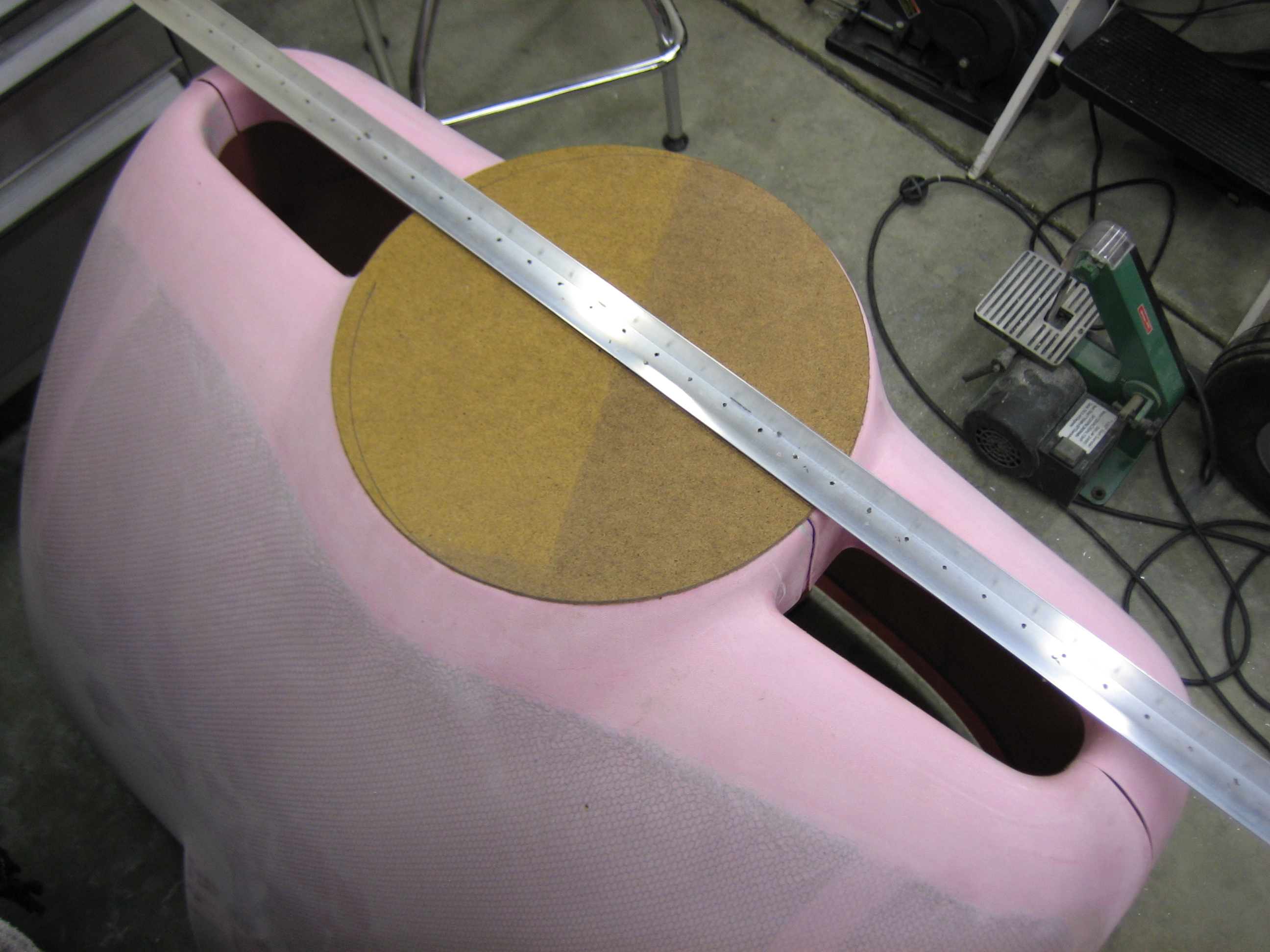 I cut out a 13″ diameter disk of hardboard to use in place of the spinner.  I also cut a spacer that is the height of the firewall that is keeping the aft edges of the cowl the right distance apart.  Even with the joint pulled tight and the flange around the disk as narrow as possible (without looking out of round), there are still small gaps on the outside edges.  I’ll end up having to use some flox to make these joints tight.  I also laid a straight edge across the center to see how straight all of the joints are.  They’re ok right now, but I’ll need to sand these with a long straight edge to get them perfectly even.