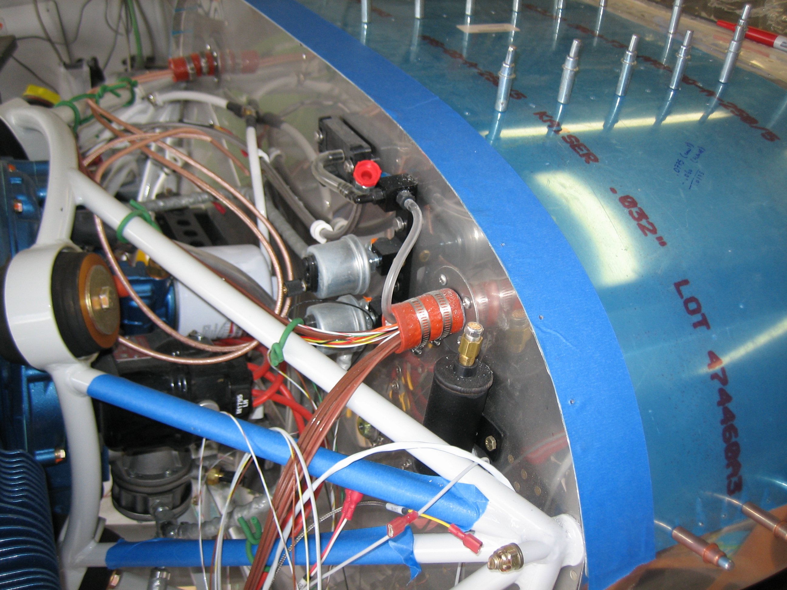 This is a poor picture, but it shows the alignment between the throttle cable and the hole in the firewall.  It’s a perfectly straight shot back to the firewall from the bracket and clears the heat muff inlet by a 1/2″ or so.