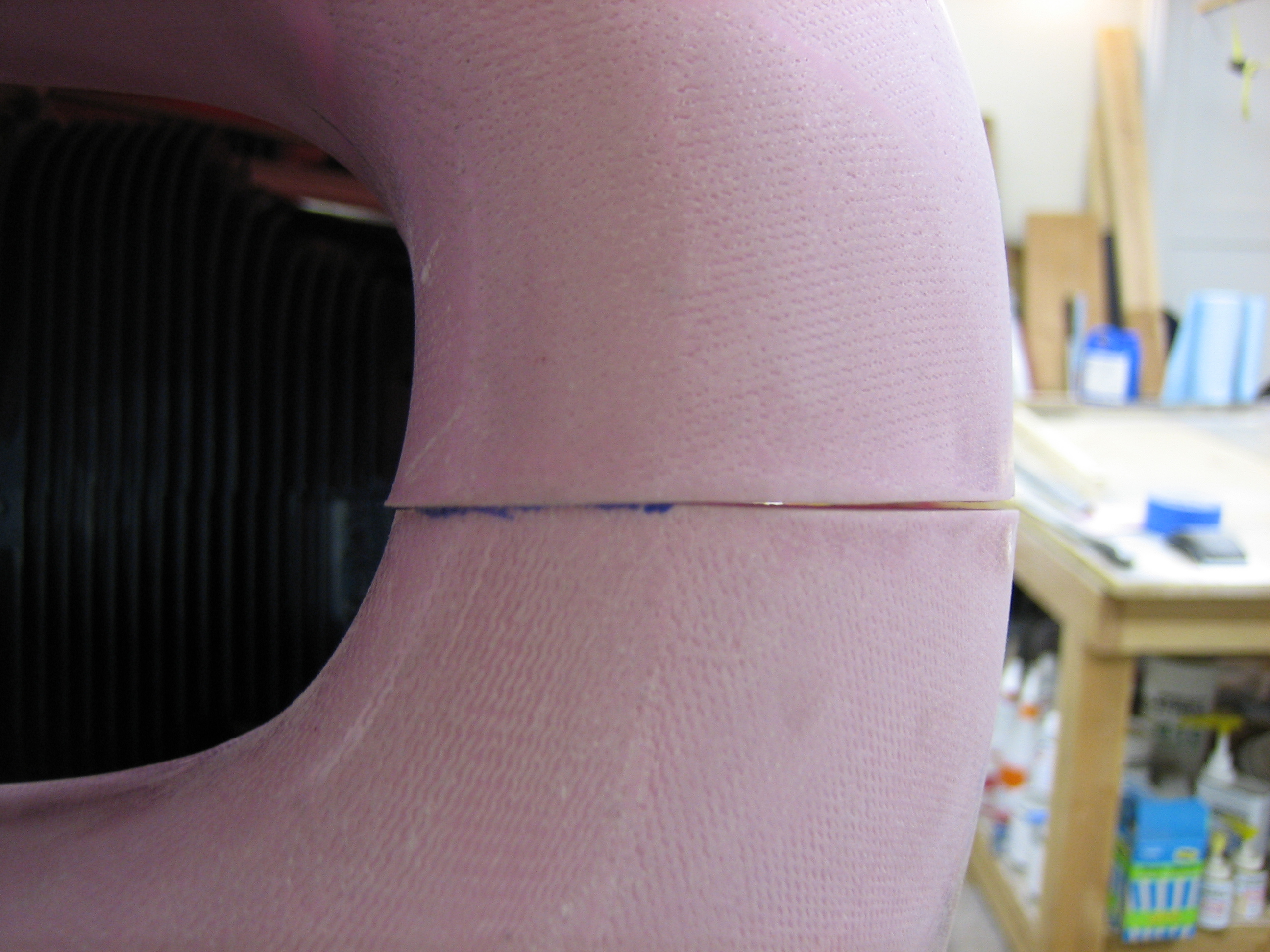 After a little further trimming of the gear leg holes, the cowl halves fit together reasonably well.  There’s still a small gap down the side, but that should disappear after making the trims along the aft edges.