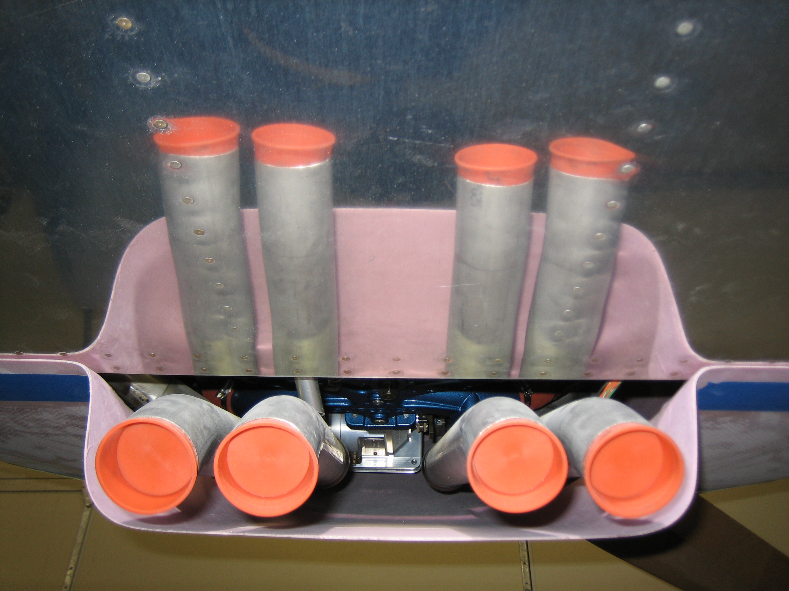 The lower end is positioned right over one of the exhaust pipes so that any oil blown overboard is burned off instead of coating the belly.