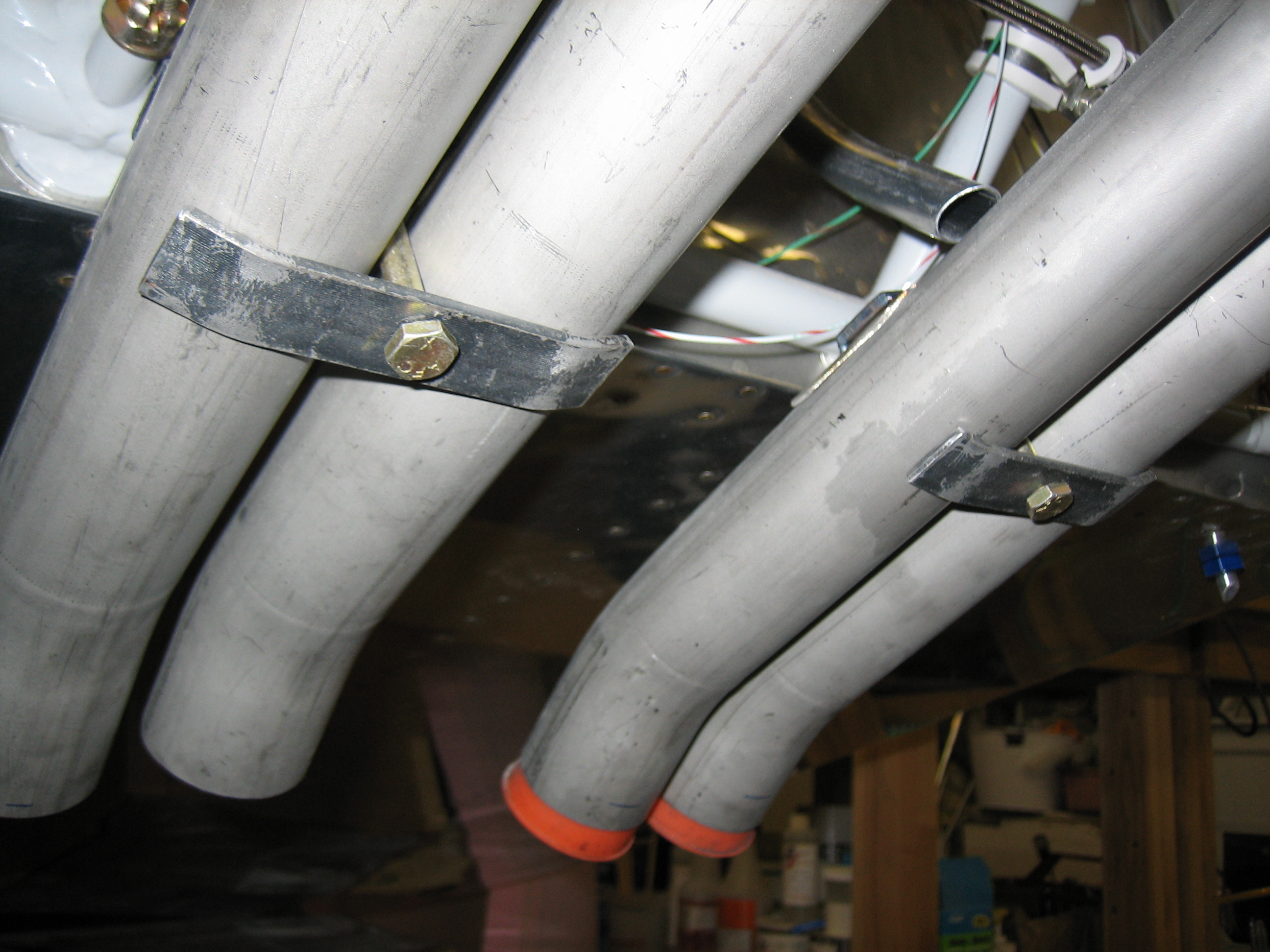I remade the exhaust hangers so that I clearance to install the aft SCAT tube on the heat muff.  I ended up shortening each stainless tube by about 2″ or so and then re-flared the ends and reassembled each support.  Shortening these caused them to splay out more which is what provided the additional clearance for the SCAT tube.  Another advantage of this is that there is more lateral stability for the exhaust pipes.