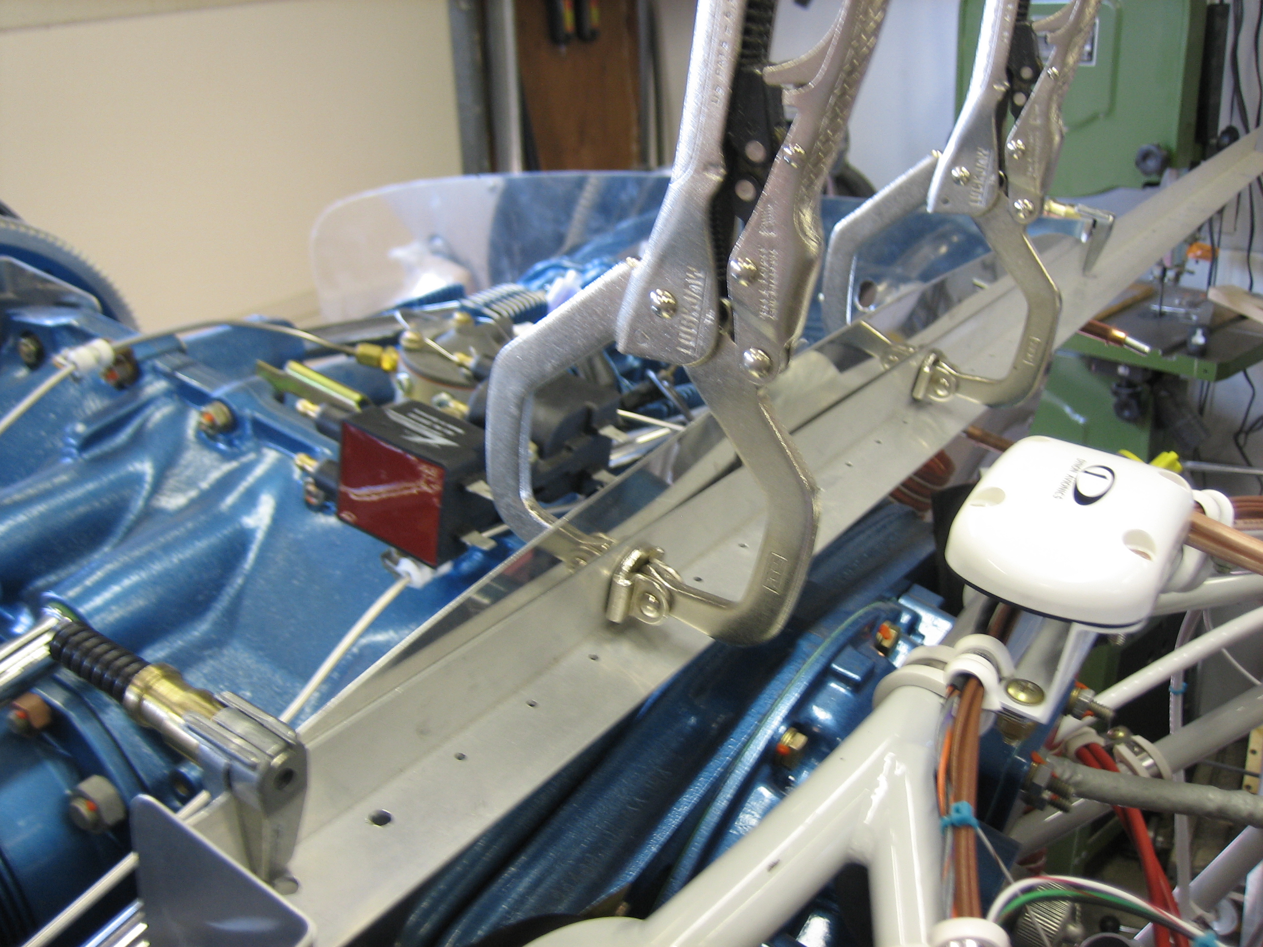 I installed the control cables in the bracket and clamped it to the panel with a couple of c-clamps. You can see that I offset the bracket to the right so that the three engine controls are centered on the panel. I did this to give myself more knee room. It will be very rare that I fly with someone as tall as me (6′ 4″), and no one will ever take off or land from the right seat, so their knee room isn’t as important. The small knob on the right is the parking brake.