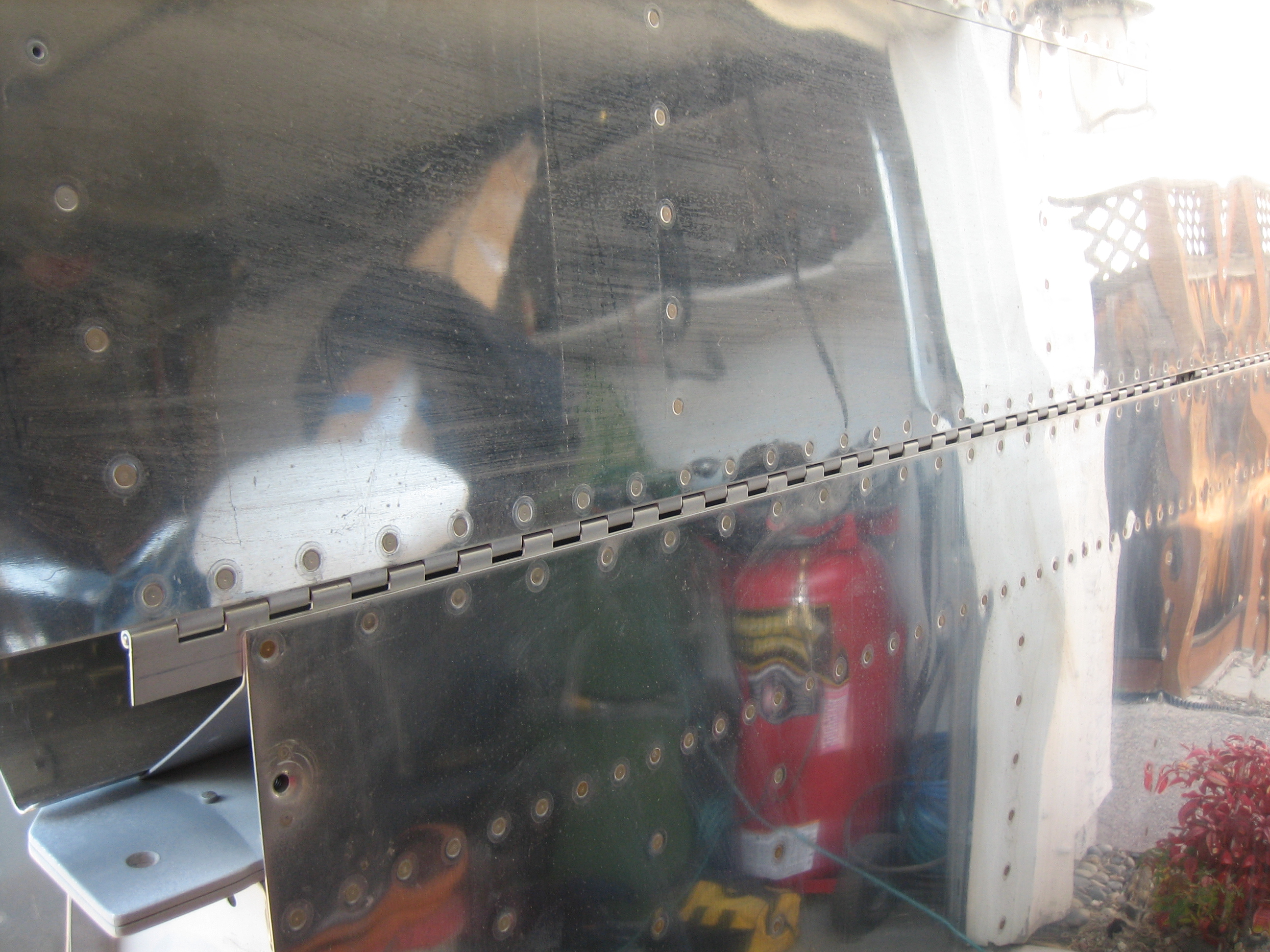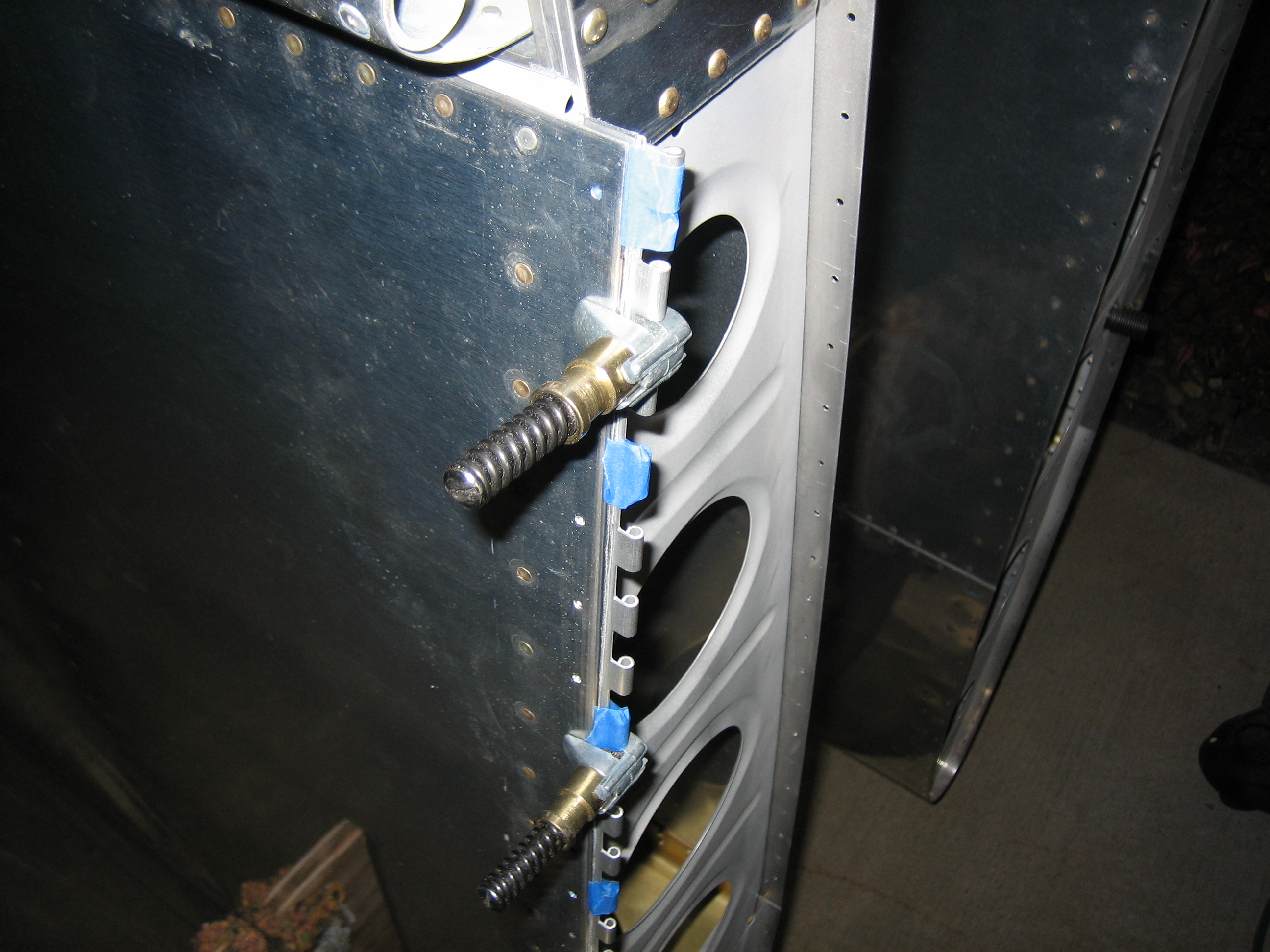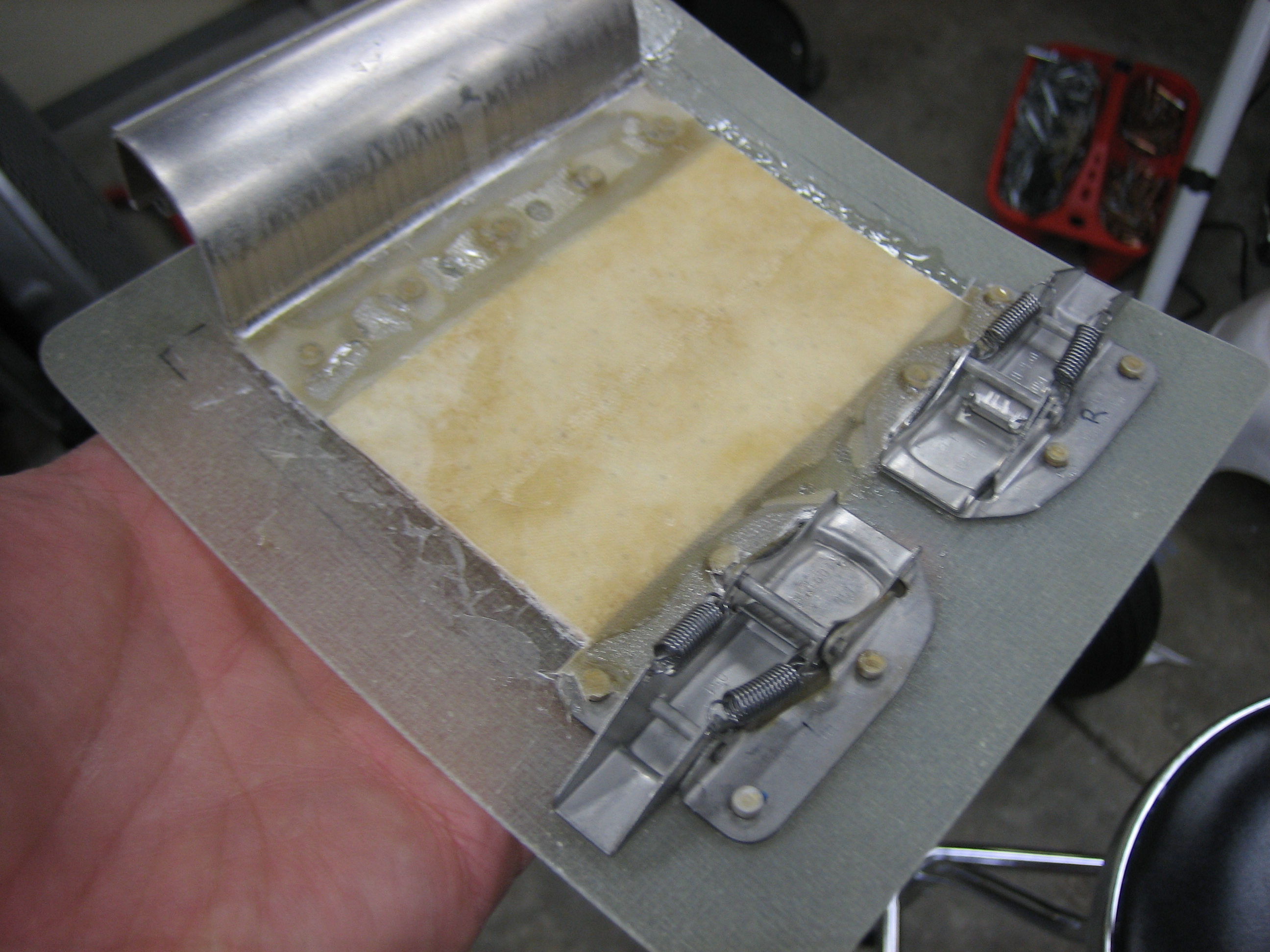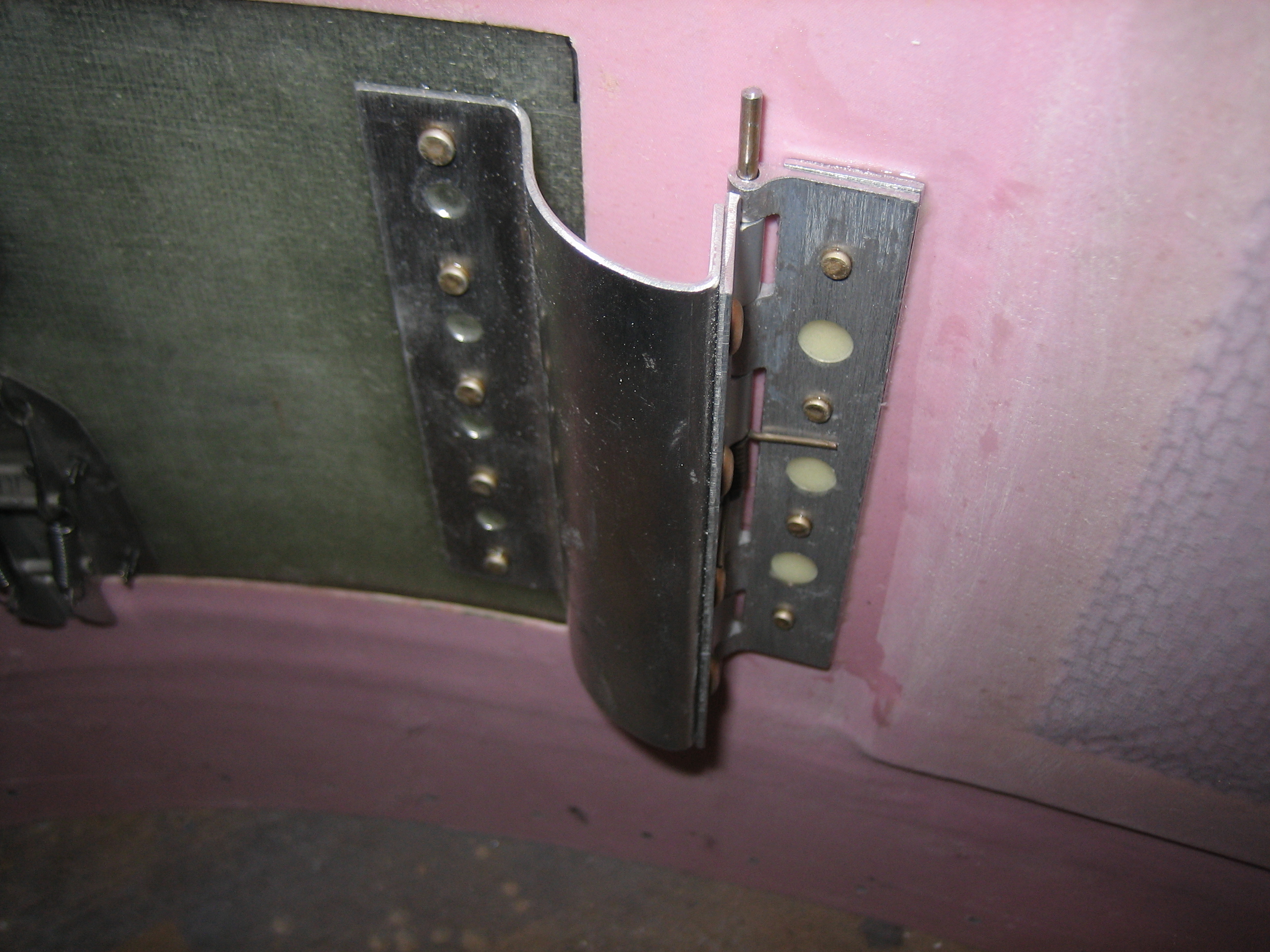 I drilled some extra holes in the hinges and then mixed up some epoxy and flox.  I glued and then riveted the hinge on with some soft rivets.