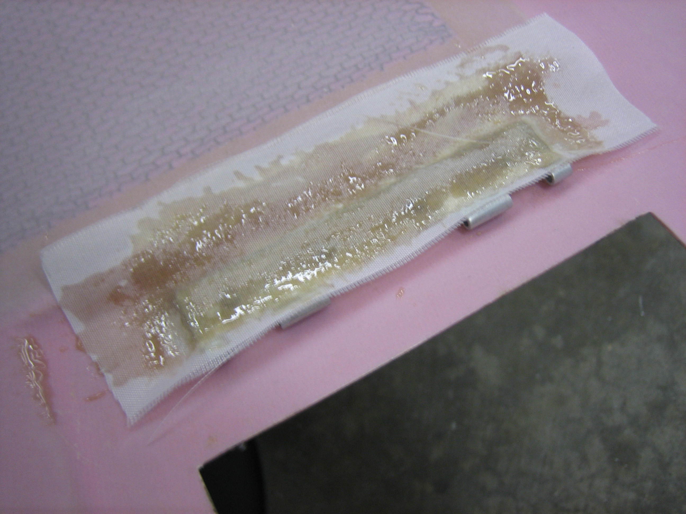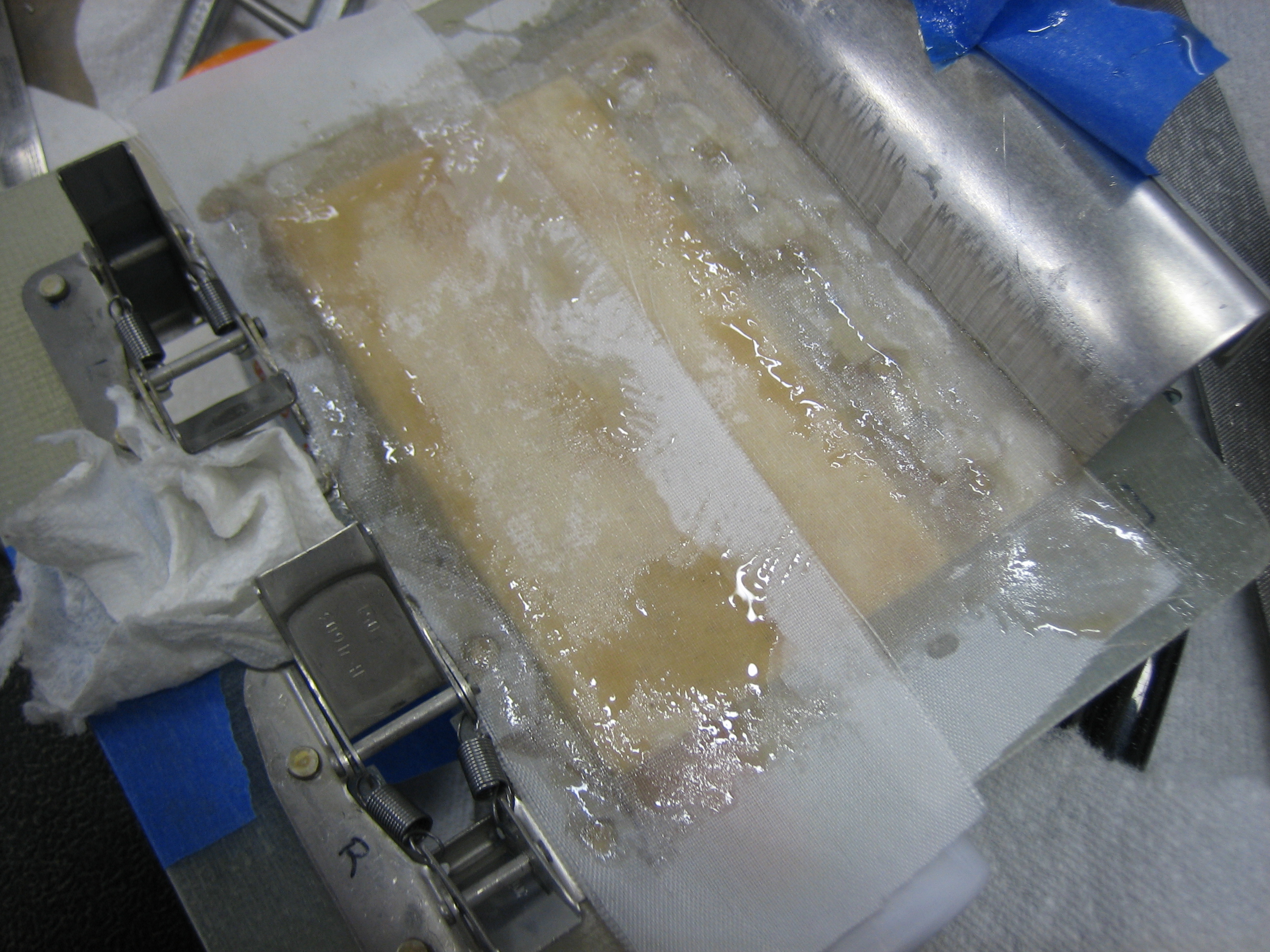 I also put a couple of layers of fiberglass over the side of the hinge bonded to the cowl.  The top layer you see in both layups is peel-ply to wick away excess resin.