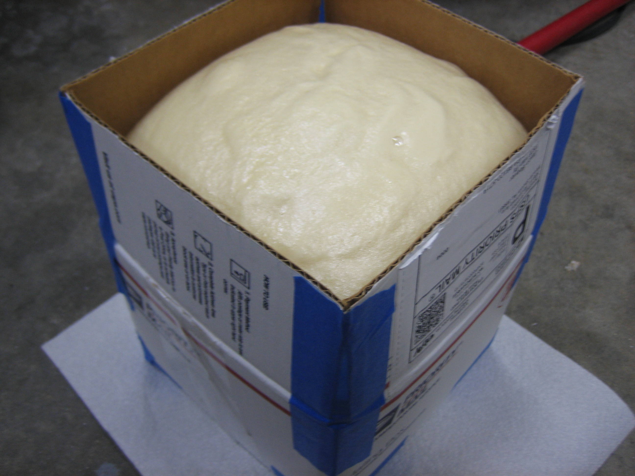I picked up some two-part expanding polyurethane foam at TAP Plastics and poured some in a box that looked about the right size to form the oil cooler plenum.  This needs 24 hours to cure before I can start shaping it.  I fully expect that this first piece will be practice, and I’ll have to make another plug before I can layup the fiberglass over it.