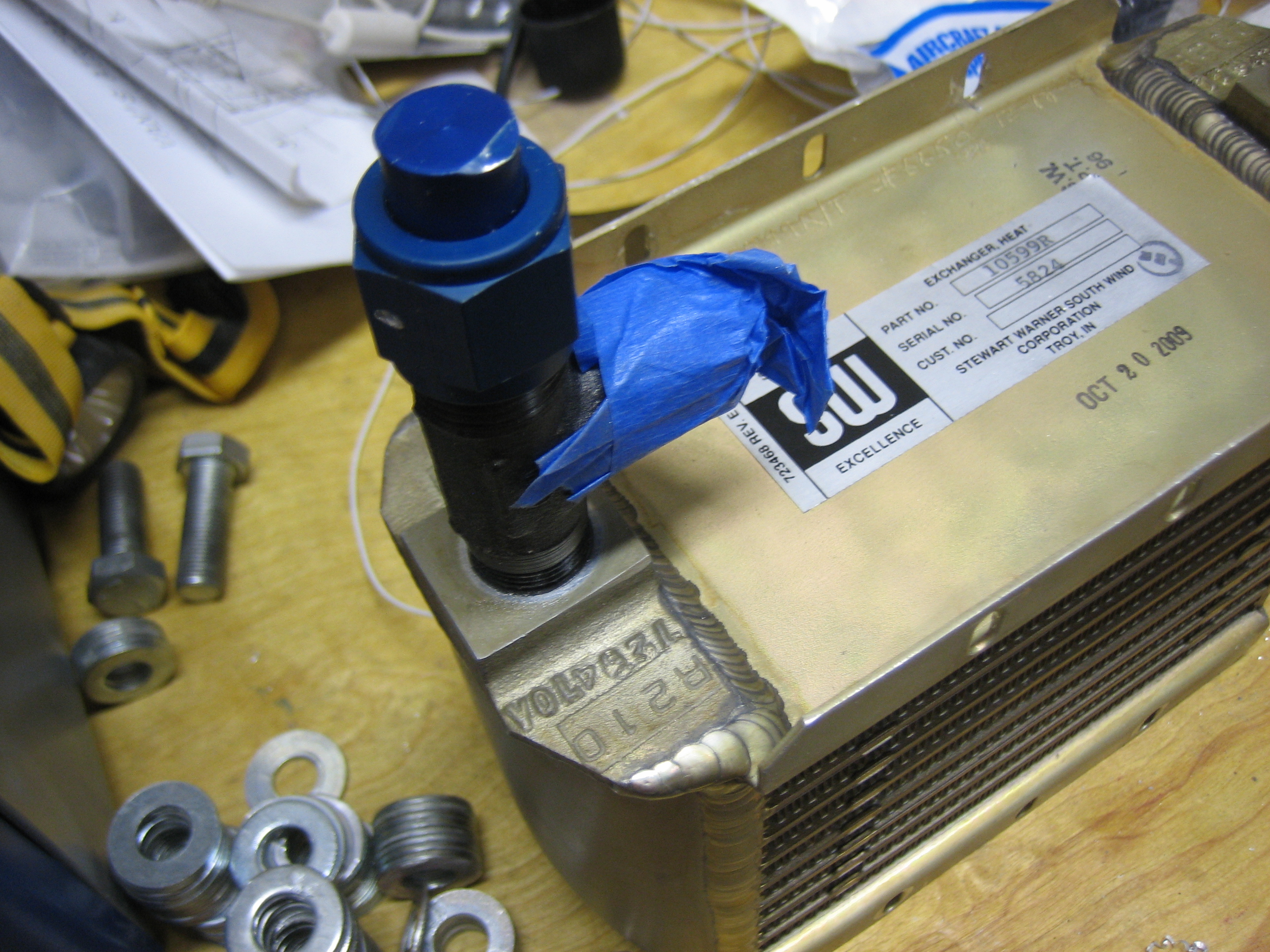 Here’s a better shot of the tee fitting.  The blue tape covers the flare port that will connect to one of the oil cooler lines to the engine.  The other flare port has an AN929-8D cap that can be removed during oil changes to drain the oil from the cooler and lines.  Without this, at least a quart of oil would remain in the cooler and lines during an oil change.