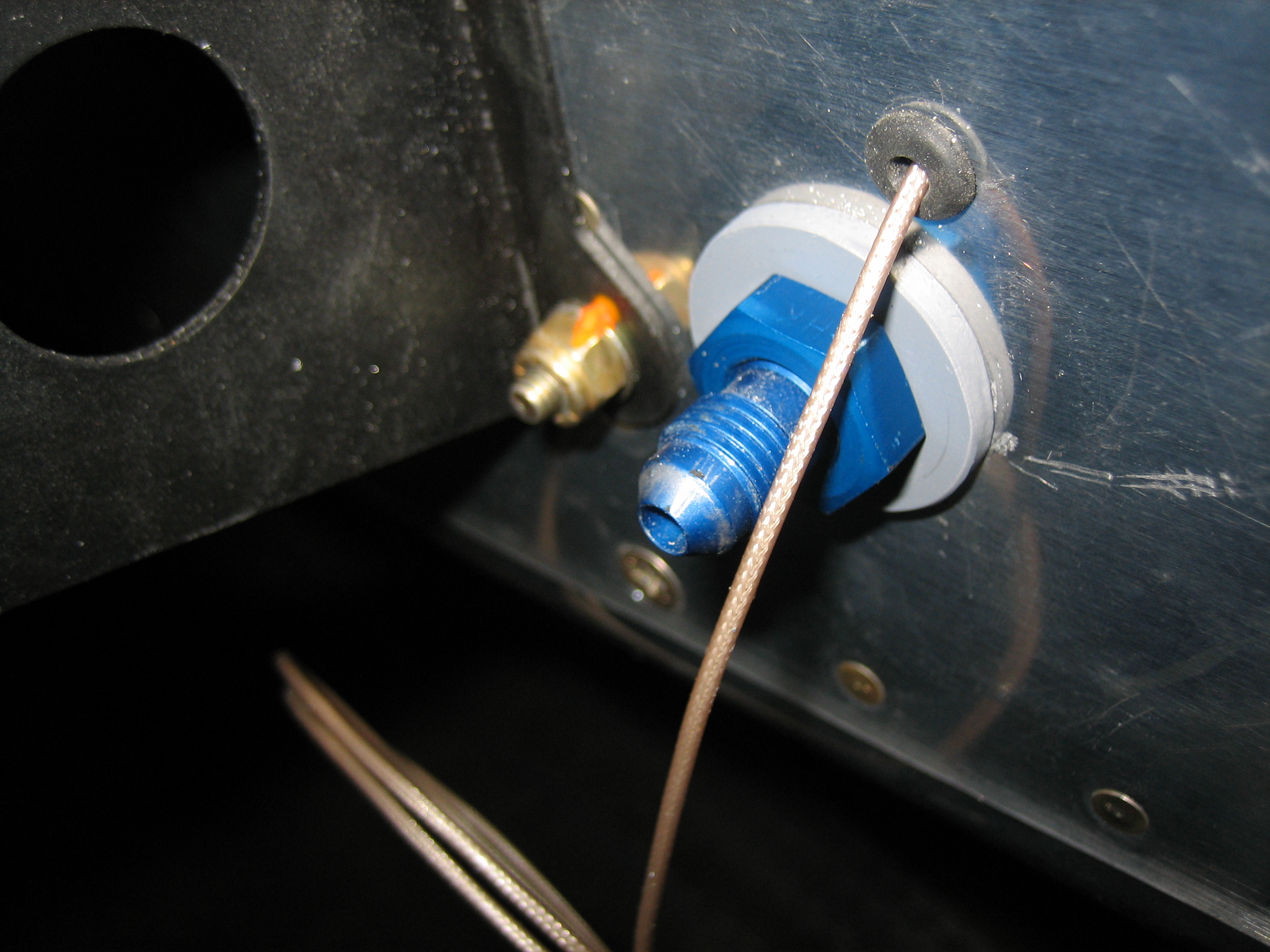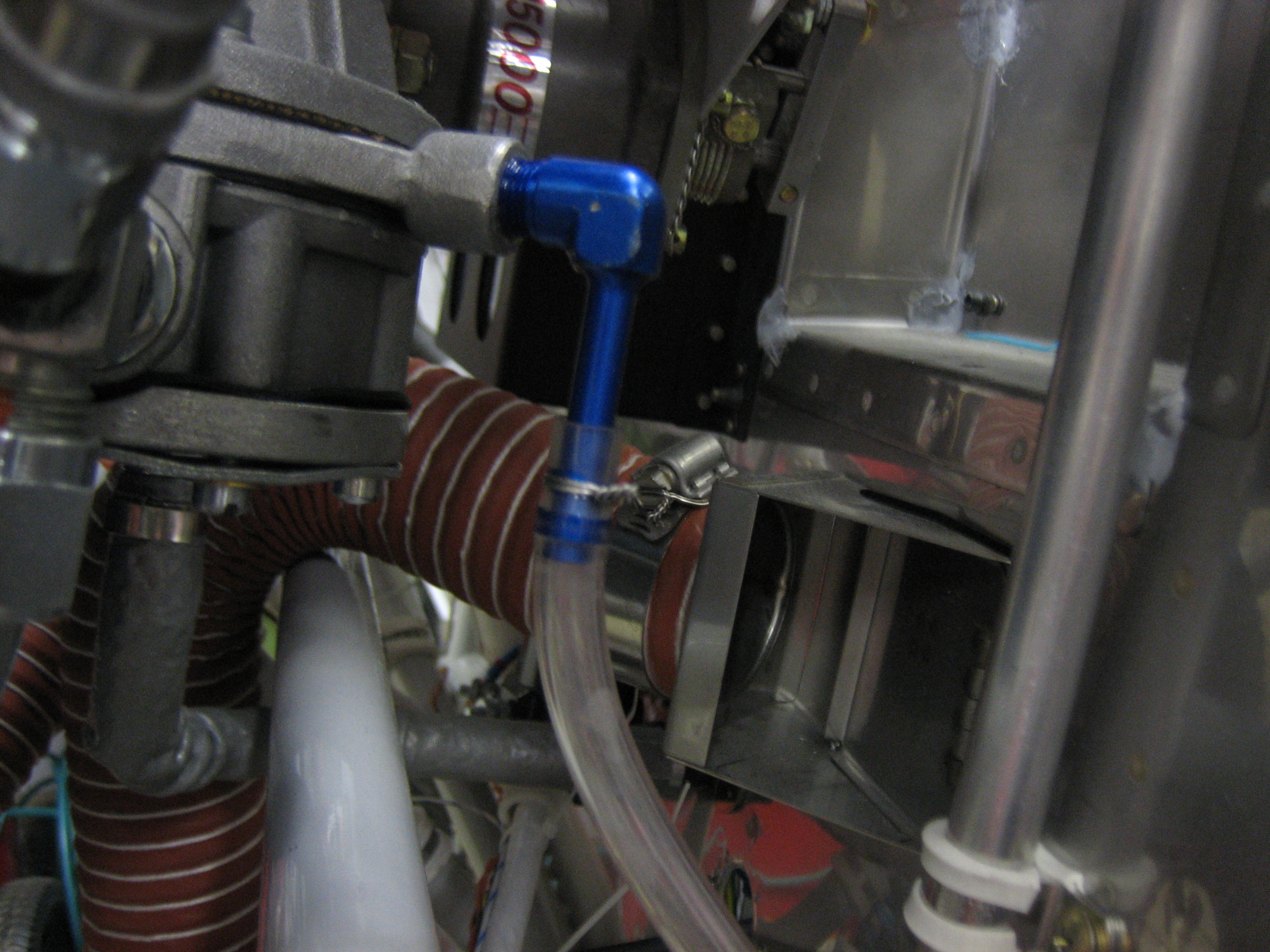 At the bottom end, I bent a short piece of 1/4″ soft aluminum tubing so that it cleared the engine mount tube and poked through a 1/4″ hole I drilled through the firewall flange and hinge.  I slipped a short piece of Tygon tubing over the aluminum tubing and zip-tied it to the engine mount.  I then used some safety wire to attach the Tygon tubing from the fuel pump to the other end of the aluminum tubing.