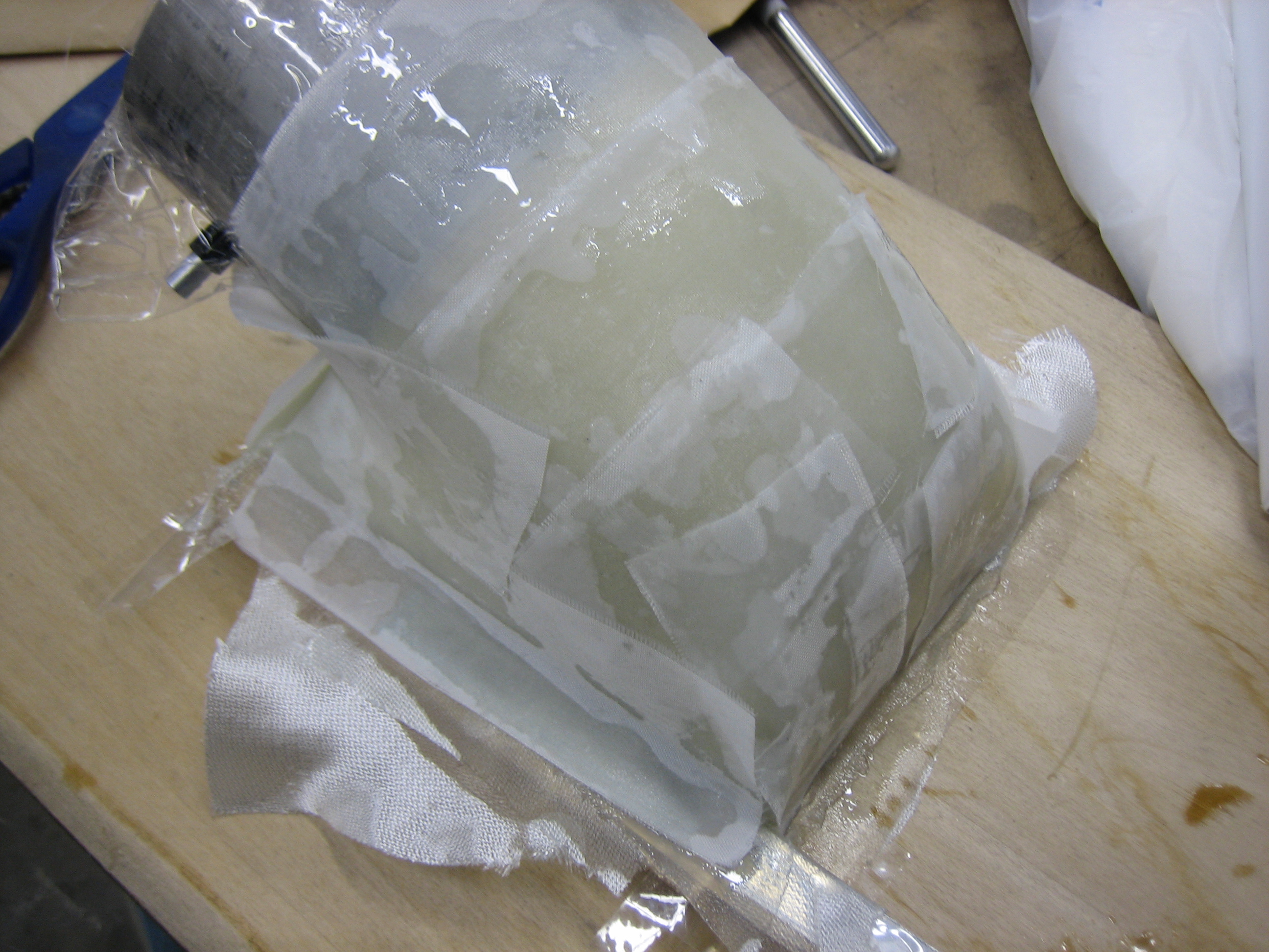 I hot-glued the form down to a couple of spacer blocks and then glassed the plenum.  I used about four layers of glass, but I only have 3oz glass on hand.  I’ll probably need to add quite a few more layers (or step up to some 9oz cloth) to make this stiff enough.  The outside is covered with peel-ply which should leave a surface ready to bond to additional layers.