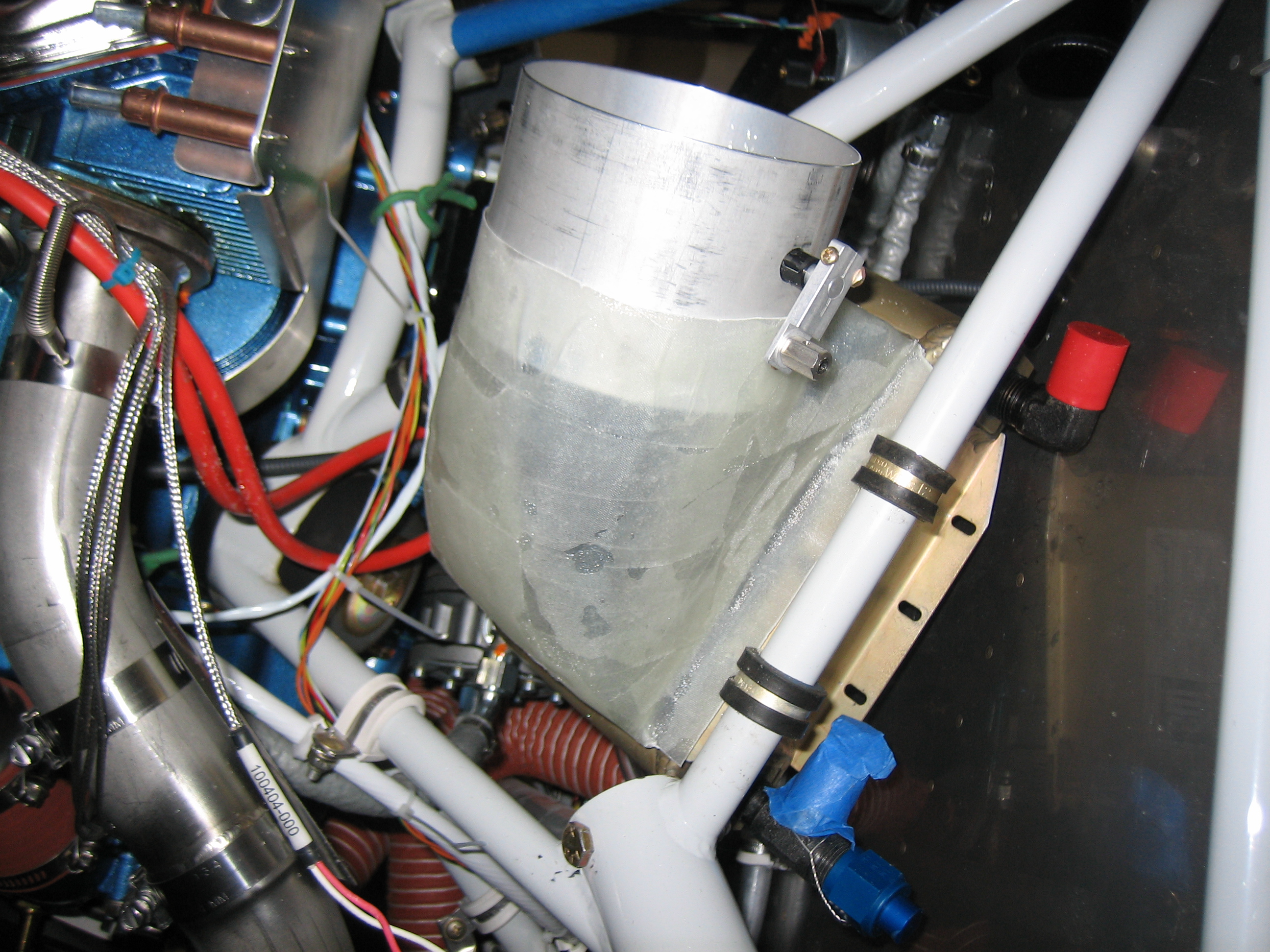 Finally, I covered the oil cooler plenum and butterfly valve with packing tape so that I can layup some fiberglass over it.  Because of the compound curves of the mold, I had to use a number of narrow strips to avoid wrinkles.
