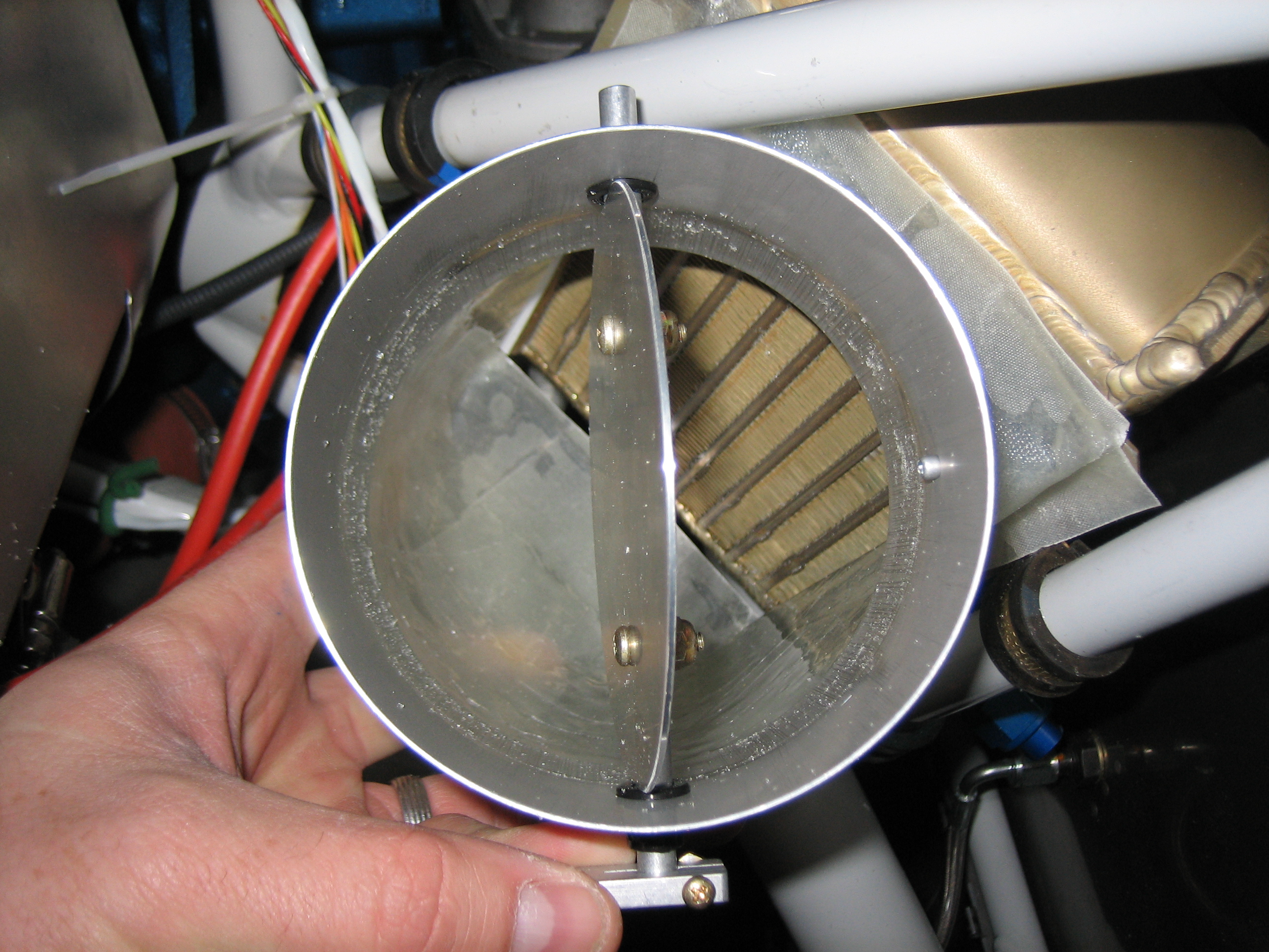 Here’s a shot down the inside.  With the butterfly valve open, the air will have a nice clean shot at the oil cooler fins.