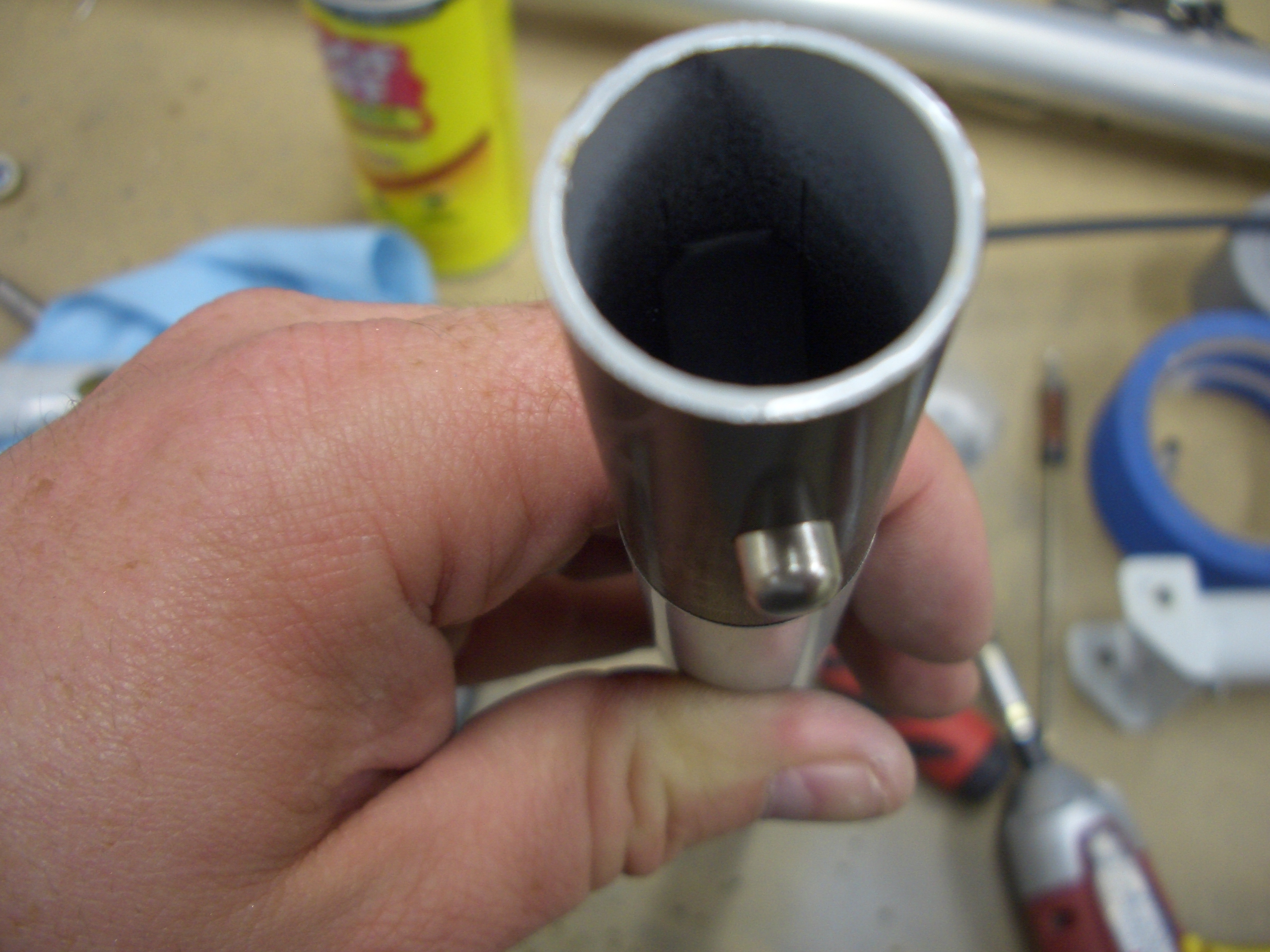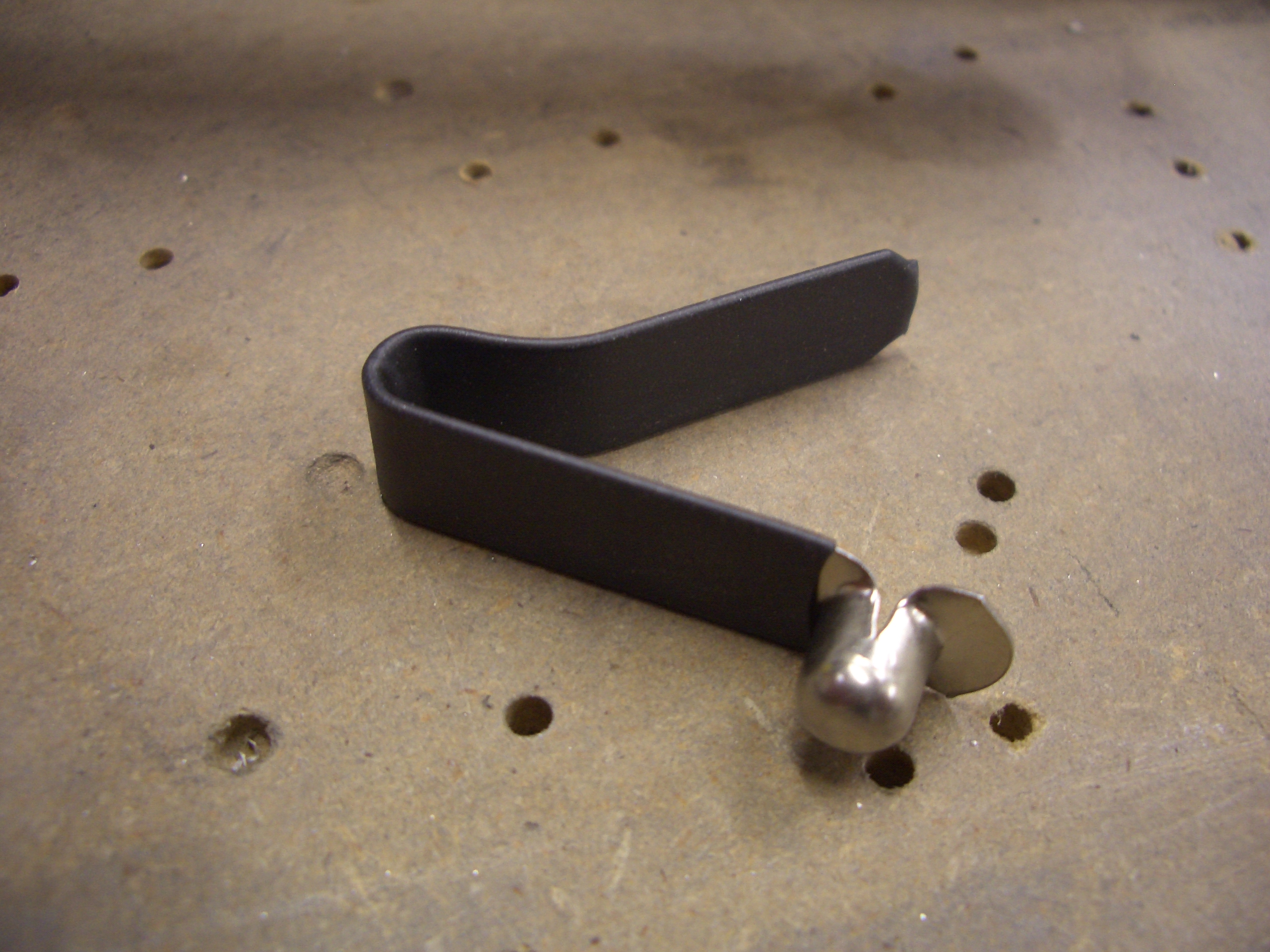 The copilot’s stick is removable so that it can be taken out when not needed. The stick is a tight friction fit in the base, but Van’s recommends installing a bolt through the pair to keep the stick from inadvertently pulling out. Apparently, this is due to an accident that happened a number of years ago when the copilot’s stick pulled out while somebody was trying to land the plane from the right seat. The problem with this approach is that it means removing the copilot’s stick requires tools and would be inconvenient at best. A number of builders recommended using a quick release locking mechanism. I ordered a few of these clips from McMaster-Carr. Since the copilot’s grip wiring is going to be running past this clip, I slipped on a piece of heat shrink tubing since the edges are pretty sharp.