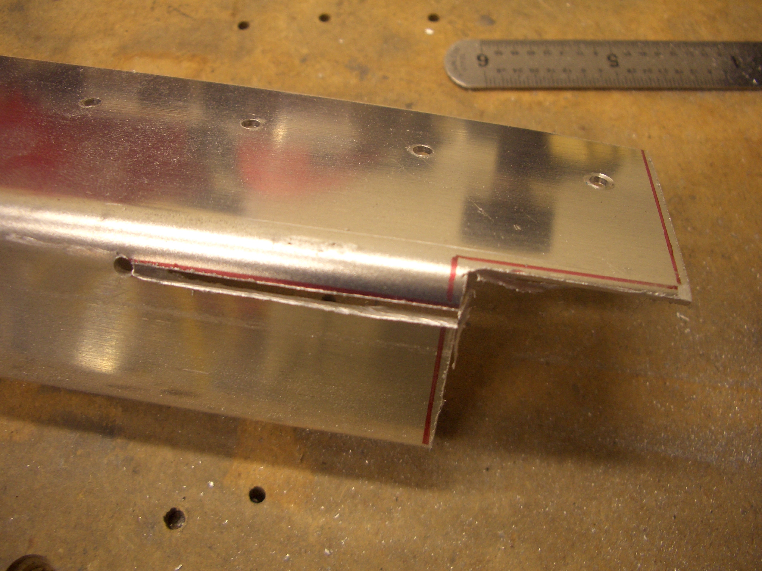 The plans specify attachment straps that connect F-623 to F-705 that are 3/4″ wide. This is too wide to hit just one row of rivets here, but not wide enough to catch both rows. Most builders just narrow the strip to 1/2″ and catch just the outer row of rivets, but I decided to make the strip a little wider and catch both rows of rivets.