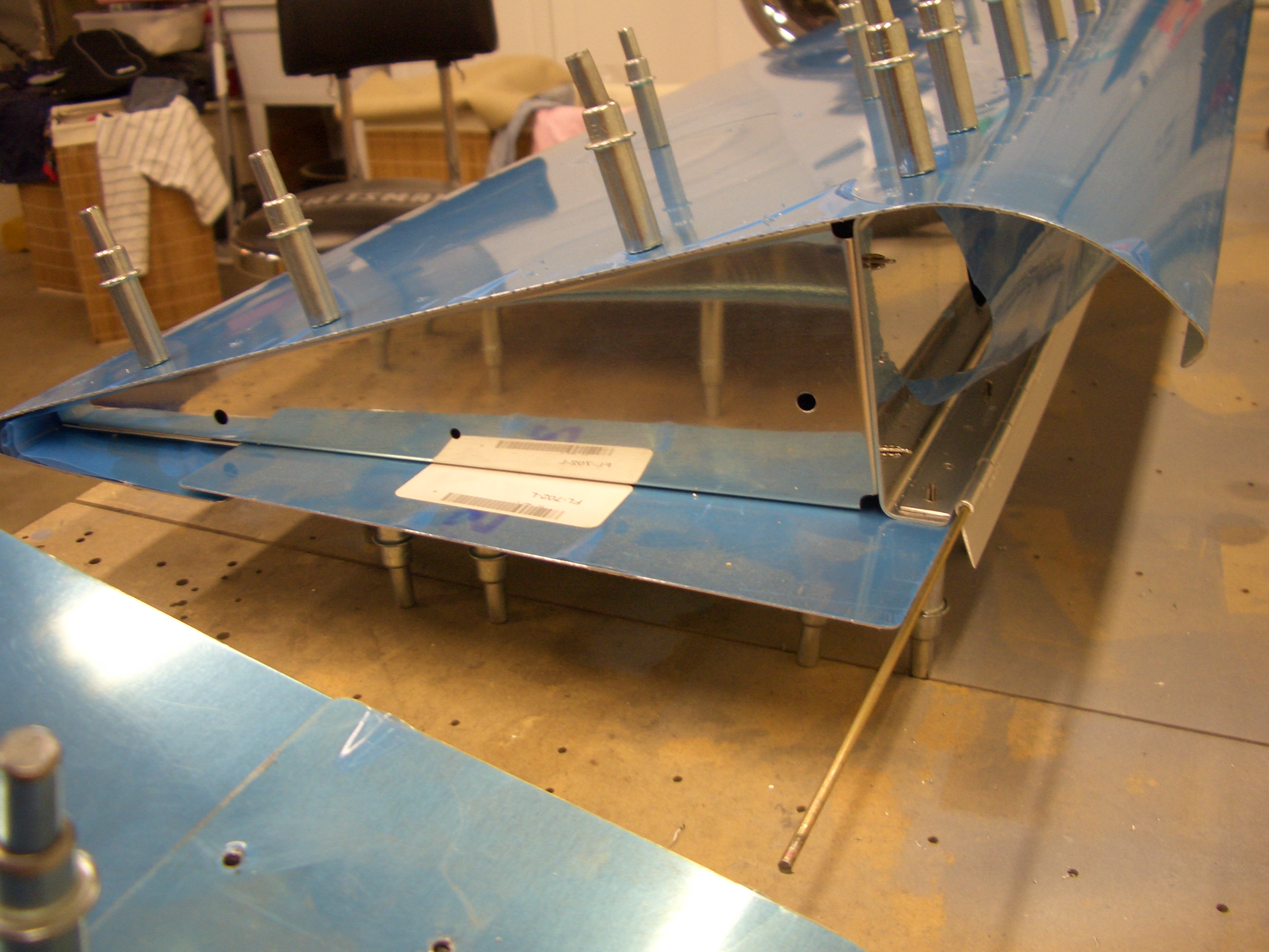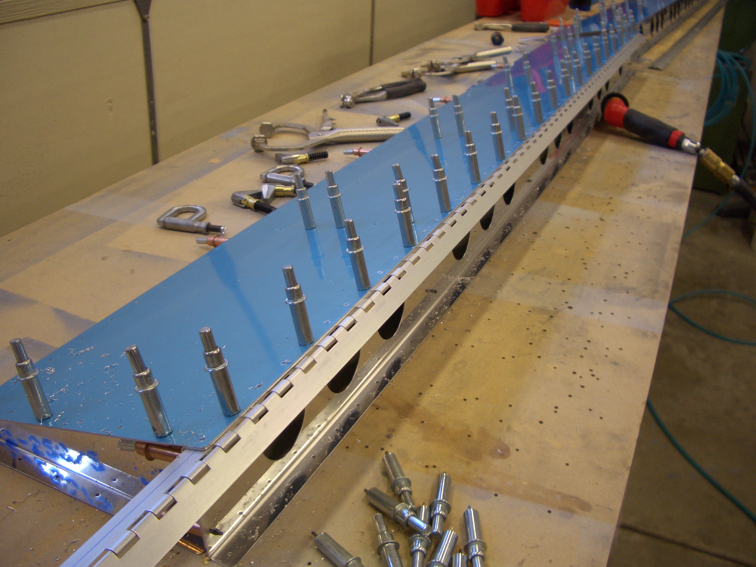Then the nose ribs get dropped into the leading edge skins and the spars are riveted to them (the closer row of three rivets here just above the nutplate).