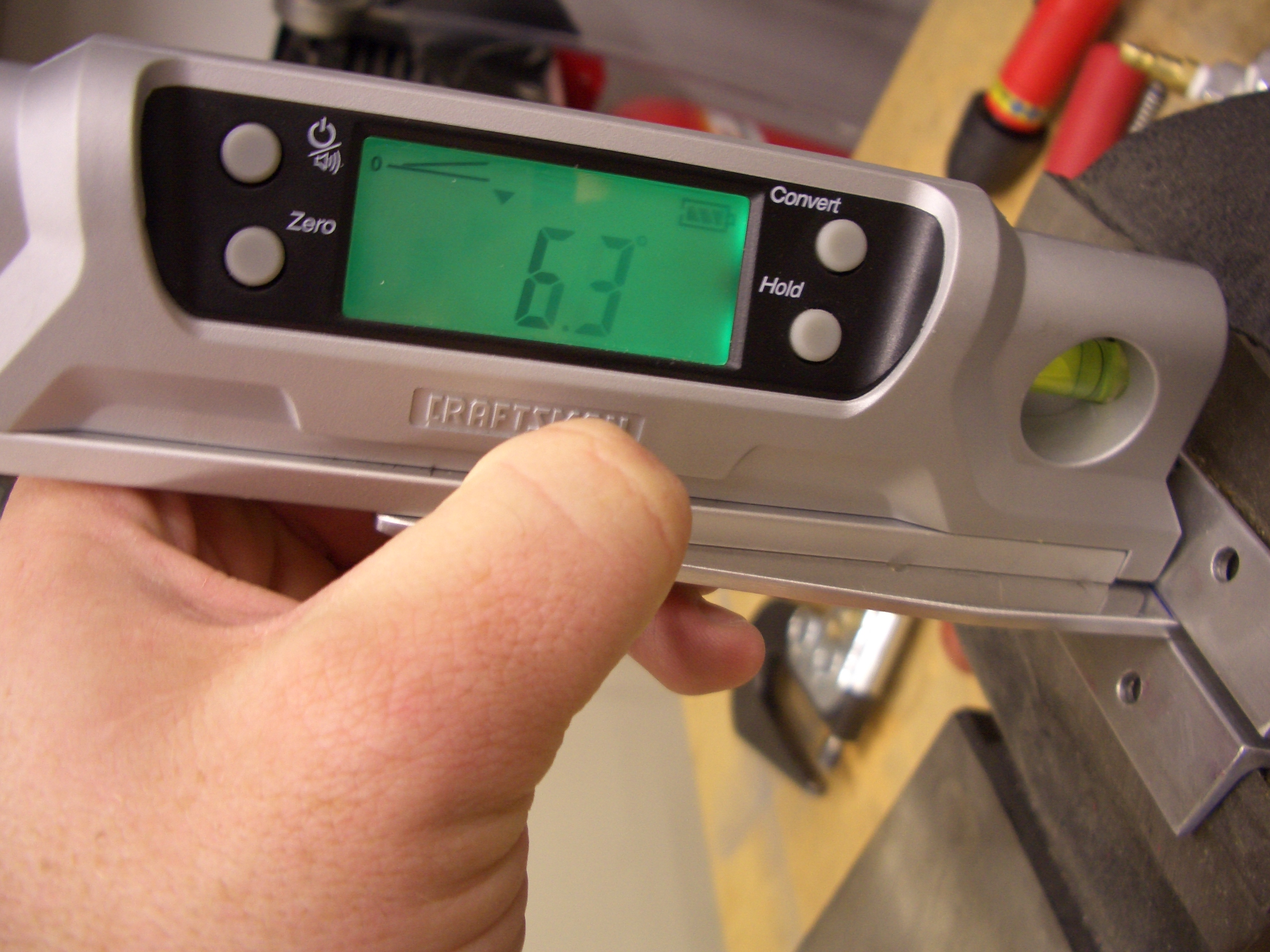 The flap brackets needed to be bent to 6.3º.  I used my fancy digital level to zero out the angle before bending and beat on this with a deadblow mallet until it read 6.3º.  I then repeated this for the other bracket.