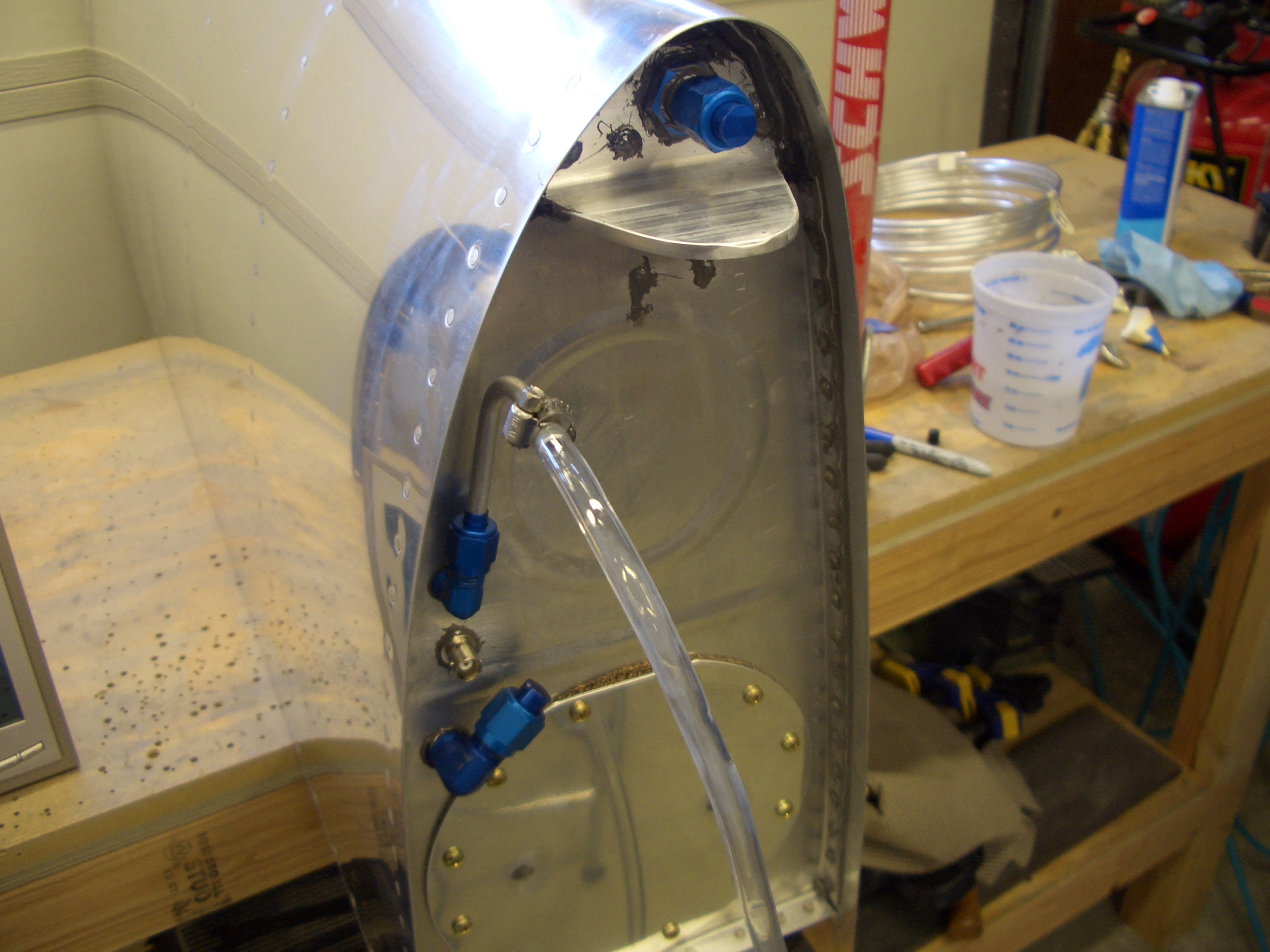 It’s been a week and a half or so since I finished sealing the last tank, so I thought now would be a good time to leak test the tanks. I put some packing tape over the filler hole, put some caps over the return line and fuel pick up lines, and made a little elbow out of some 1/4″ soft aluminum tubing and attached it to the vent port along with some 1/4″ ID vinyl tubing to make a simple water manometer.